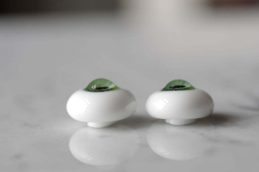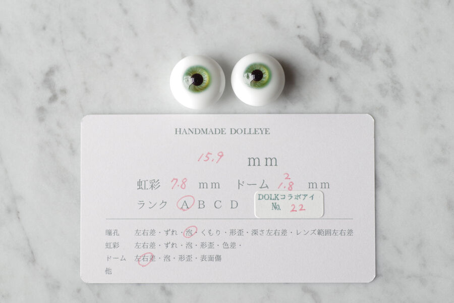 ※ レンズ部に細かい泡あり、ハンドメイドのため左右での色差、黒目の大きさやドームの高さの左右差など左右で同じ出来ではありません。予めご了承ください。