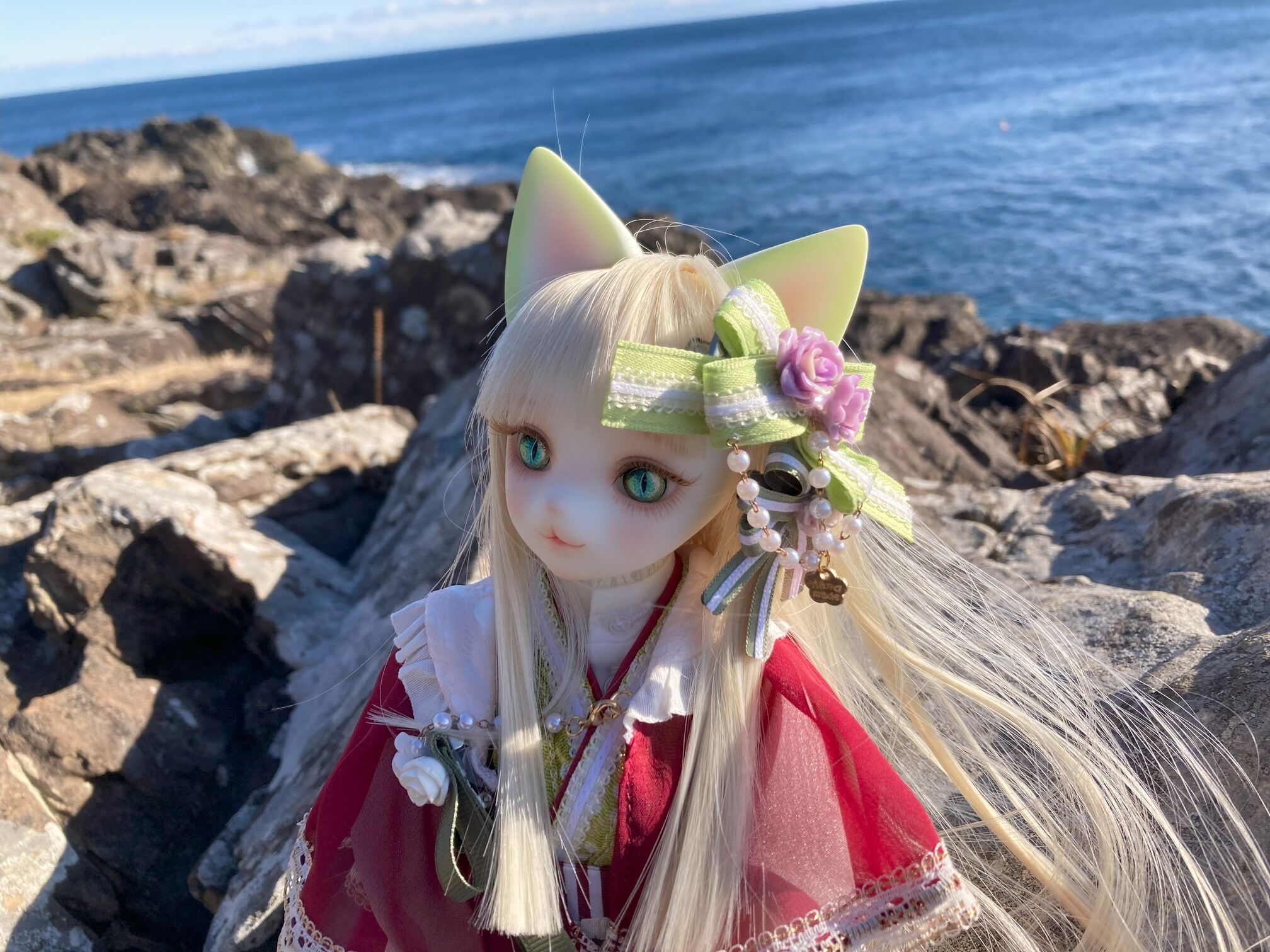 猫の手足の造形をより可憐に魅せる和ロリドレスは、イラストからDOLKがオリジナルデザインをおこし、人気ドールメーカーSADOLがドールサイズで特別に仕立てています。茜色のシフォン生地と軽やかな萌黄のドレスが、ネコミミの抹茶色のメイクと調和する優雅な仕上がりです。