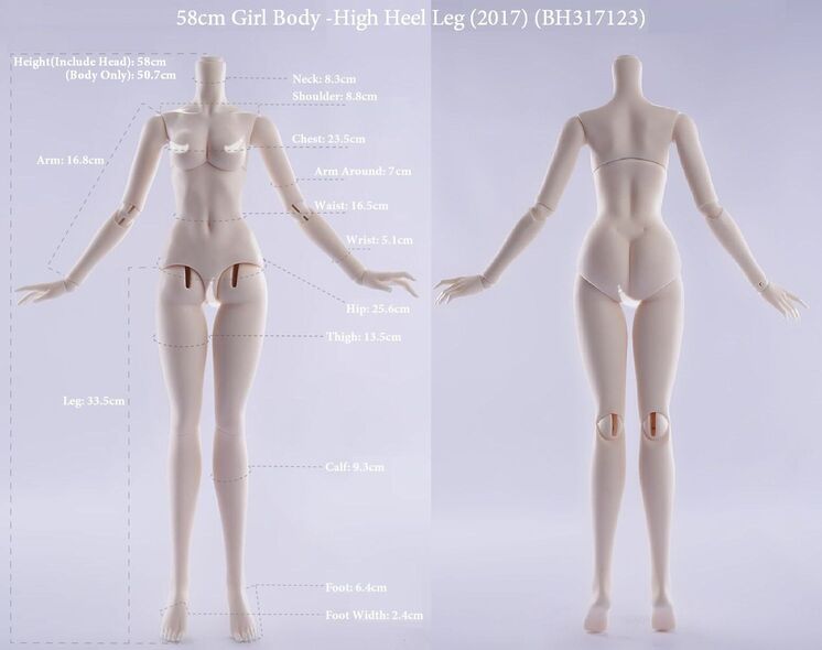 | 58cm Girl High Heel Leg & 普胸(2017): BH317123 | 58.1 | 22.5 | 8.3 | 12.5 | 23.5 | 16.5 | 25.6 | 16.8 | 5.1 | 33.5 | 13.5 | 6.4 | 2.4 | 8~9 | 14 | |
