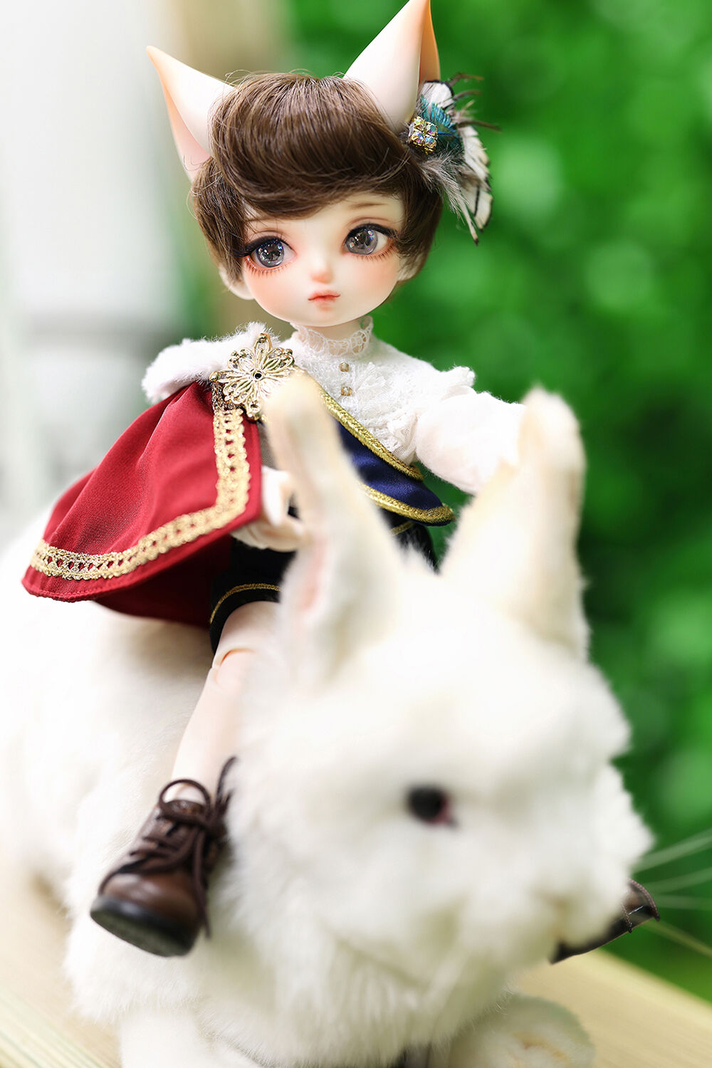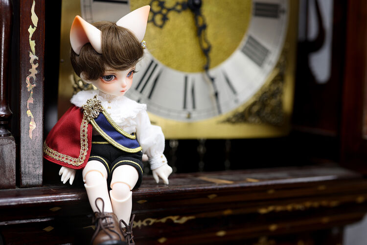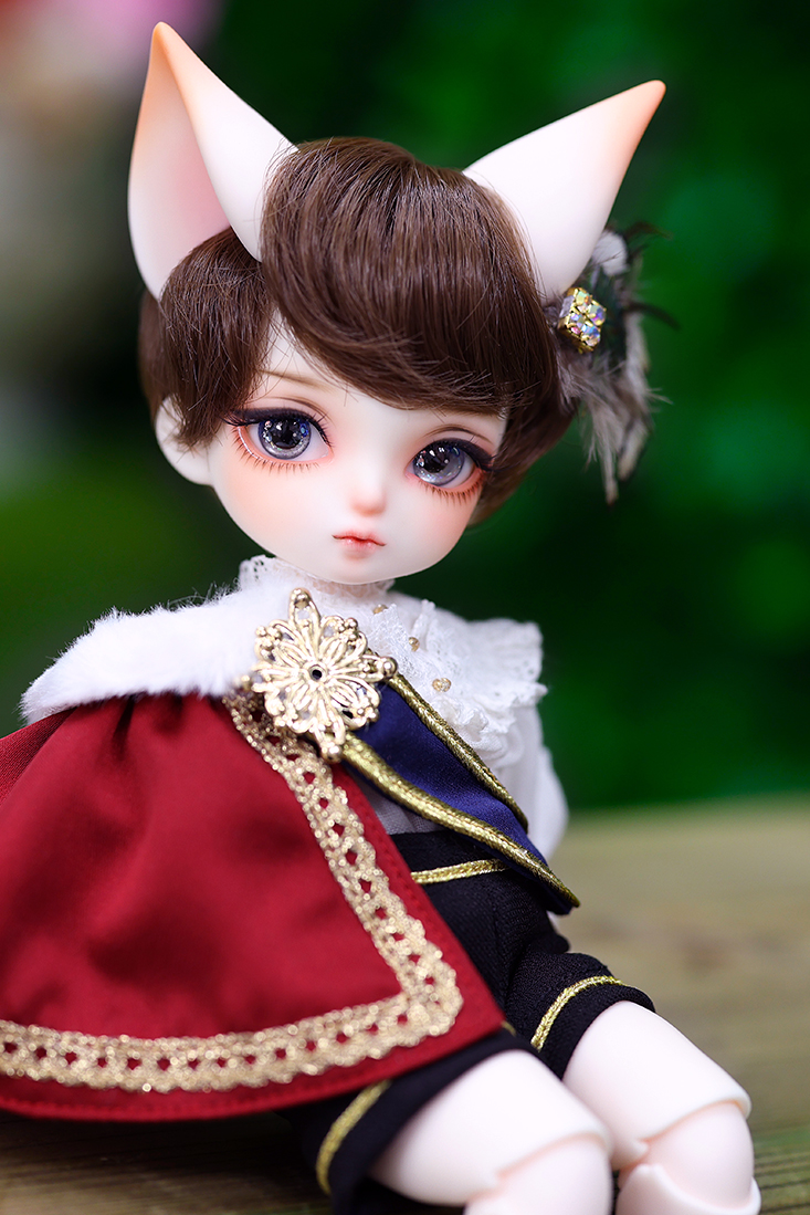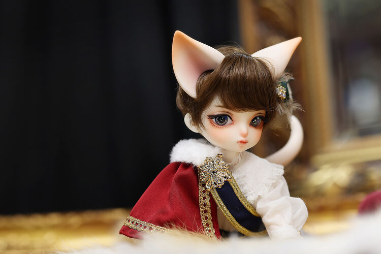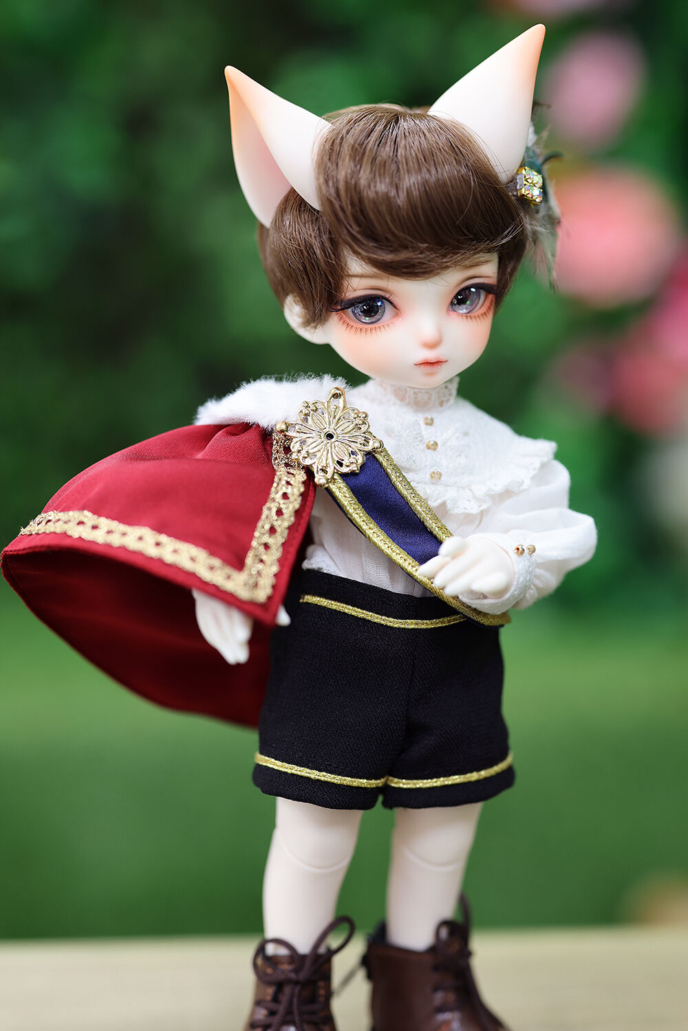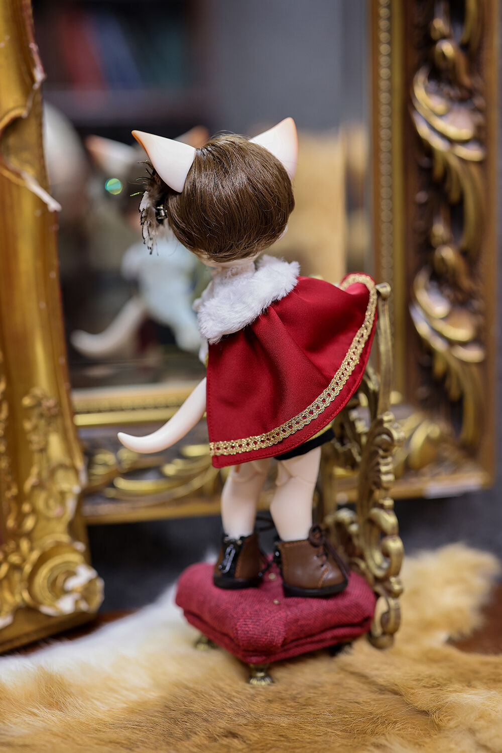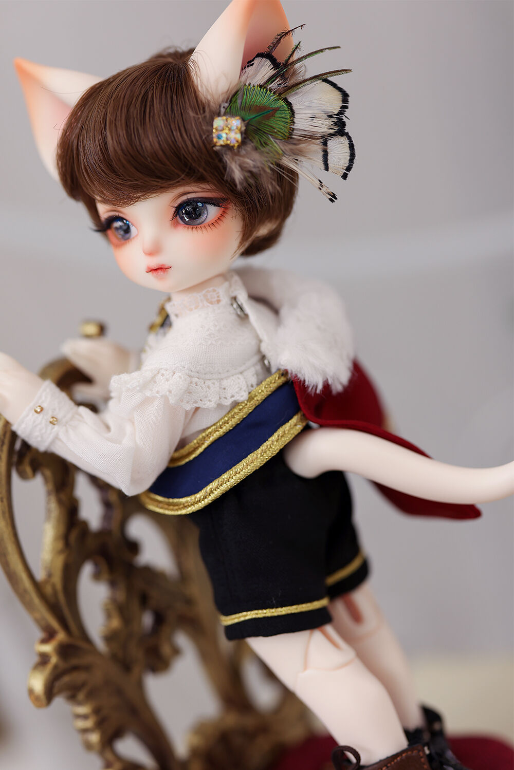 どこか飄々とした印象を醸す羽根の髪飾りや、王家の勲章煌めくペリースが、BENJAMINの風貌を立派な猫銃士へと完成させています。