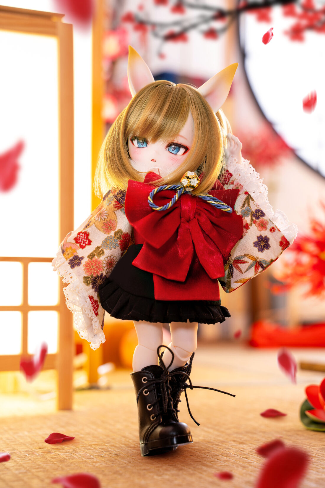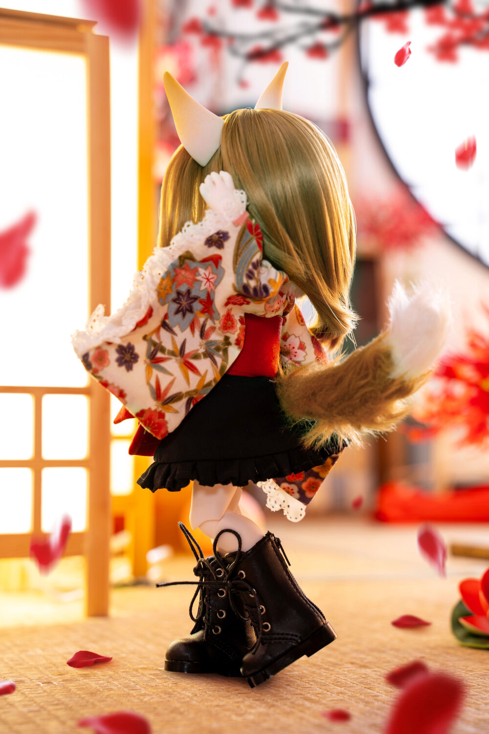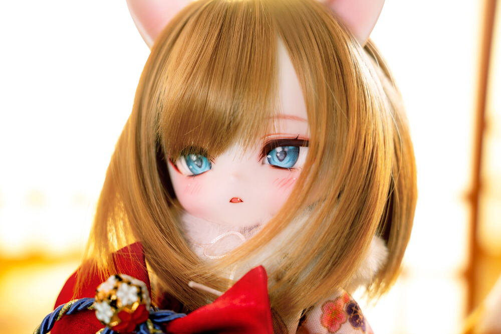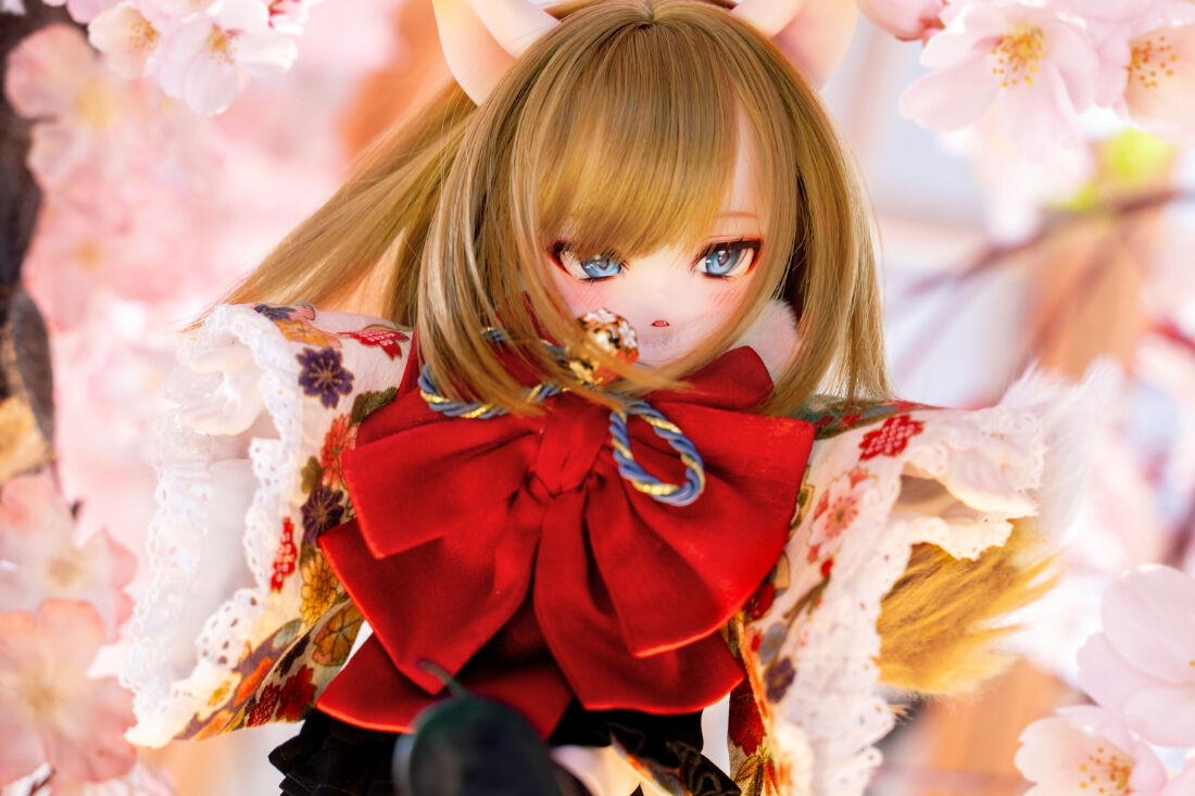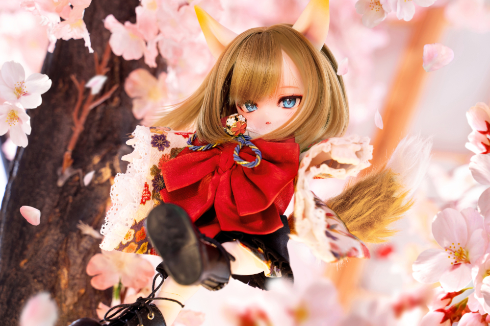 DOLK初コラボとなるMio Studioが、MYUの小さなボディにぴったりの着物を巧緻な仕立てで誂えました。華やかな前結びのお太鼓や狐の毛並みを彷彿とさせるショールが、玉藻前の出立ちをより一層絢爛に魅せています。ふんわりと広がるフリル仕立てのスカートが雅やかな和のテイストに可愛らしさをプラス。艶やかな飴色が輝く、ふわふわ仕様の狐尻尾にもご注目ください。