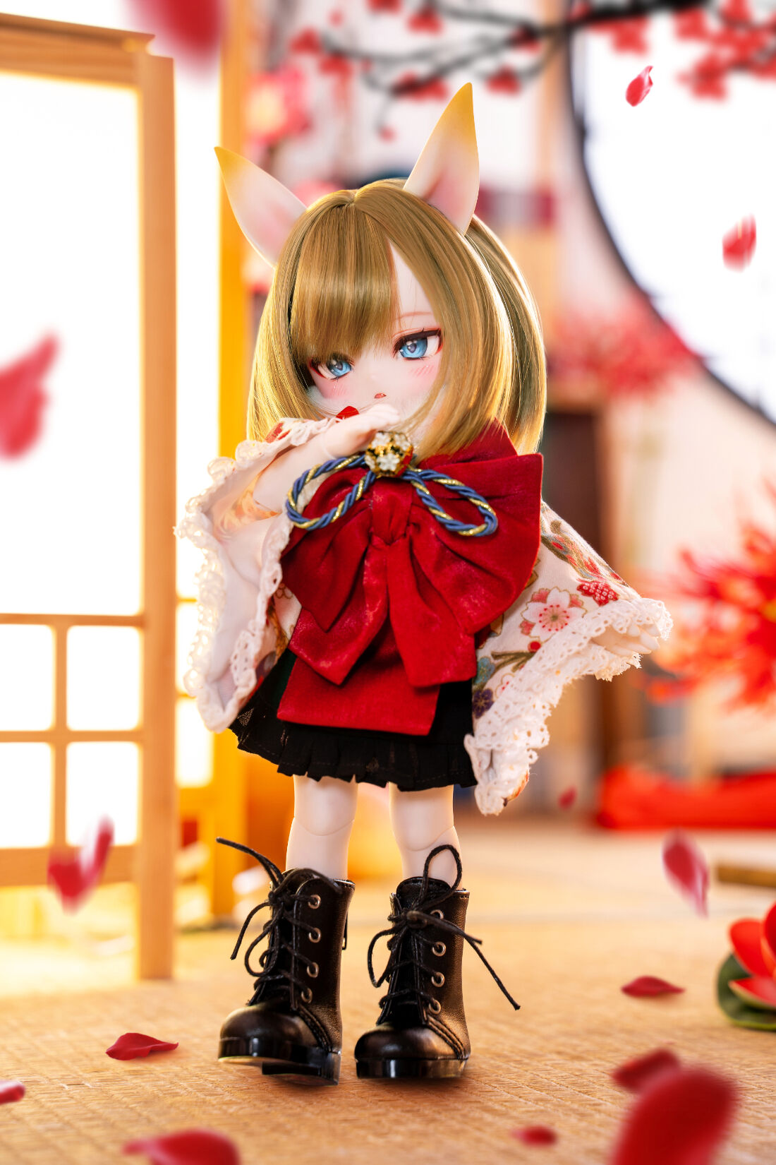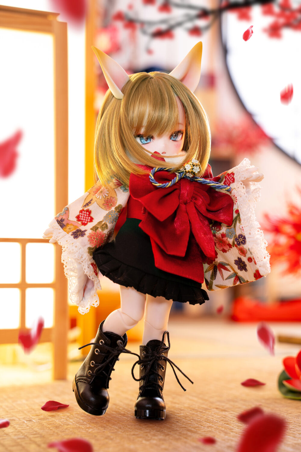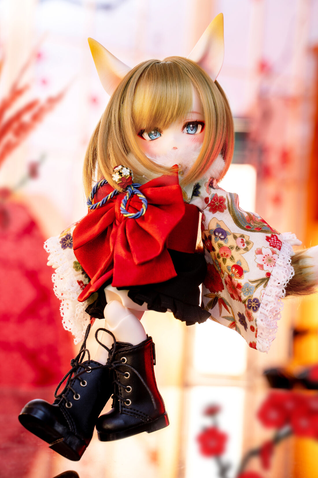DOLK初コラボとなるMio Studioが、MYUの小さなボディにぴったりの着物を巧緻な仕立てで誂えました。華やかな前結びのお太鼓や狐の毛並みを彷彿とさせるショールが、玉藻前の出立ちをより一層絢爛に魅せています。ふんわりと広がるフリル仕立てのスカートが雅やかな和のテイストに可愛らしさをプラス。艶やかな飴色が輝く、ふわふわ仕様の狐尻尾にもご注目ください。