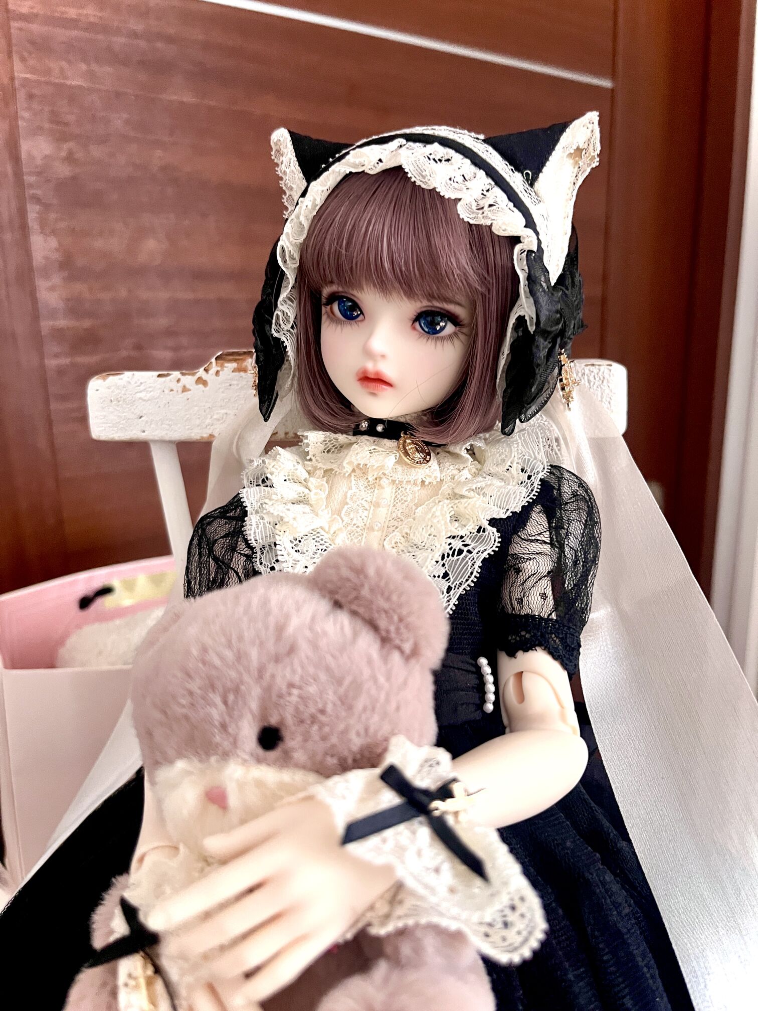 上品なレース使いと、ドールのボディを引き立てる美しいシルエットを両立する圧倒的な完成度。ネコ耳がかわいいヘッドドレスは長くて繊細なリボンを結んでも結ばなくても楽しめる仕様となっています。