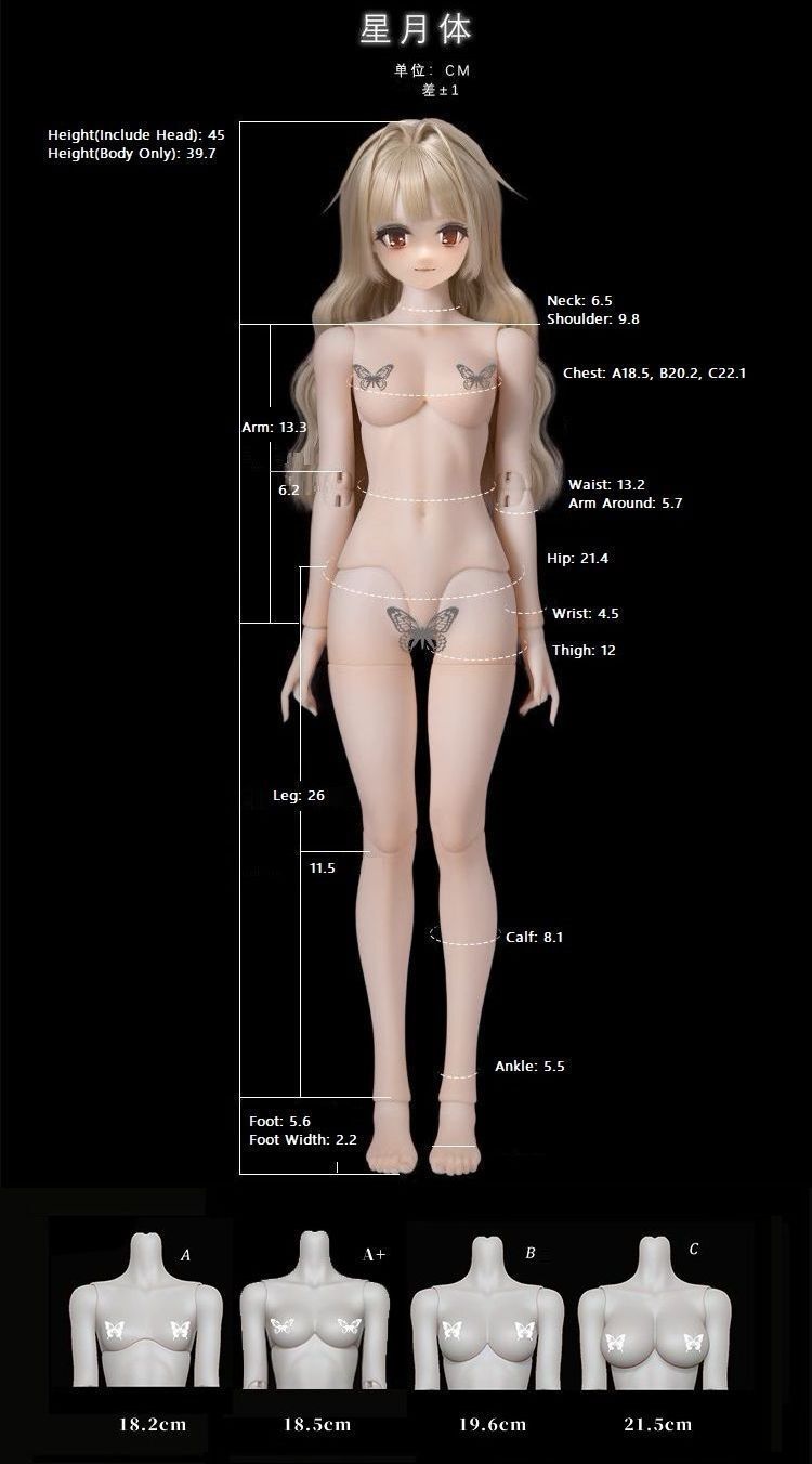 | 1/4 Girl (星月体): A胸 | 45 | 18 | 6.5 | 9.8 | 18.2 | 13.2 | 21.4 | 13.3 | 4.5 | 26 | 12 | 5.6 | 2.2 | 7~8 | 14 | |