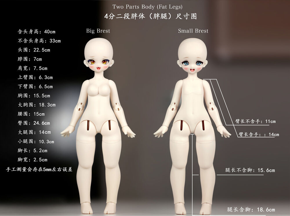 | 1/4 40cm Girl 二段胖体(胖腿/小胸) | 40 | 22.5 | 7 | 7.5 | 15.5 | 15 | 24.6 | 11 | --- | 18.6 | 14 | 5.2 | 2.5 | 8~9 | 20~22 | |