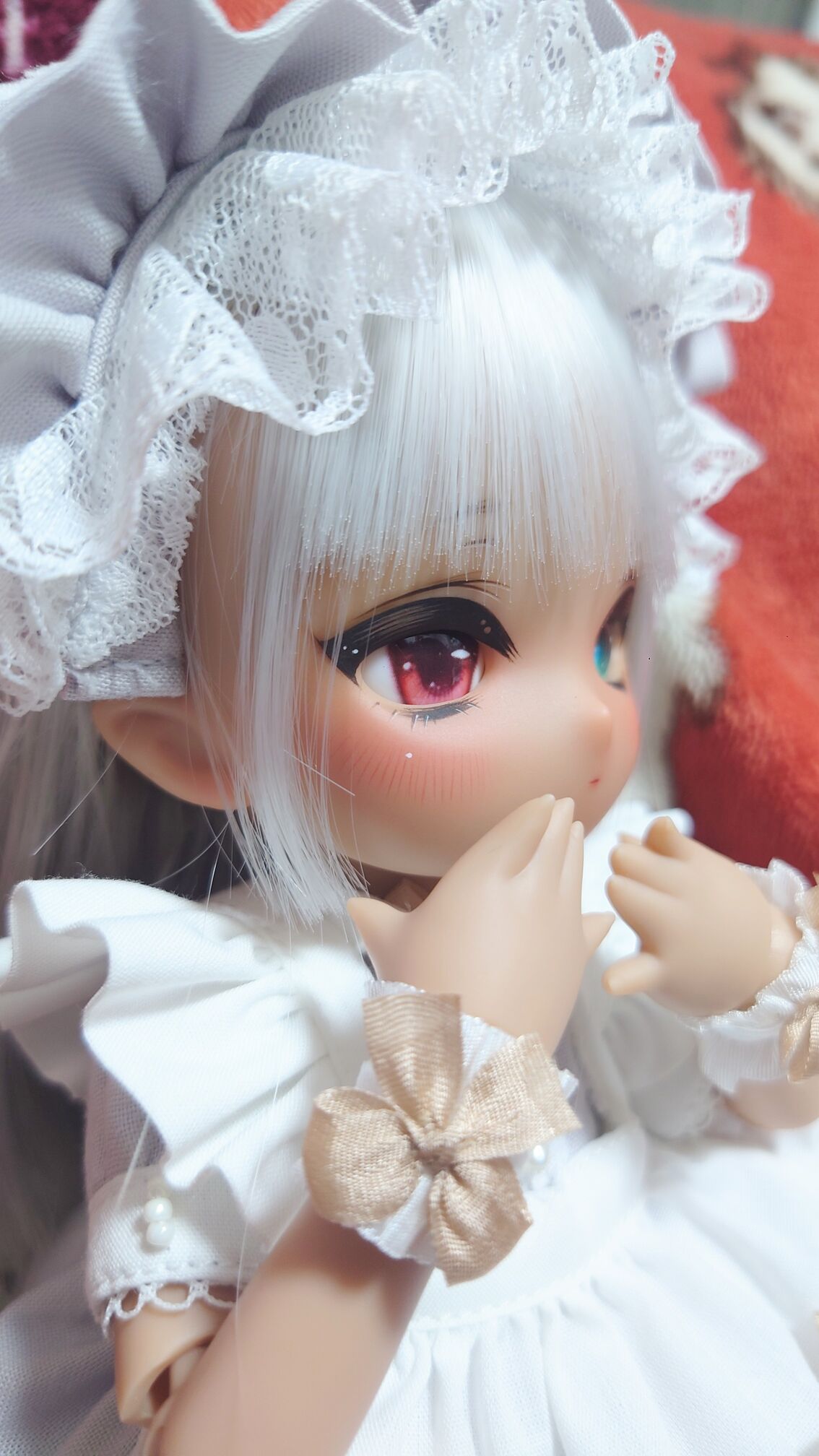 アニメ系ドールの中では比較的小さな7-8インチのGuruのアイホールにあう、小さめのアニメティックアイを、人気アーティストのNayeONE氏が特別に限定サイズで制作しています。ウサギらしいレッドの瞳と、特別感を感じさせるグリーンのオッドアイ構成で妖精のような小さなメイドさんが誕生しました。