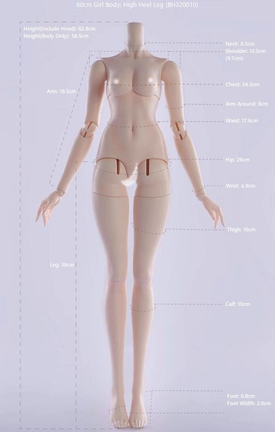 | 60cm Girl High Heel Leg & 普胸: BH320010 | 62.8 | 22 | 8.3 | 12.5 | 24.5 | 17.6 | 26 | 18.5 | 4.9 | 38 | 16 | 6.8 | 2.8 | 8~9 | 16 |
