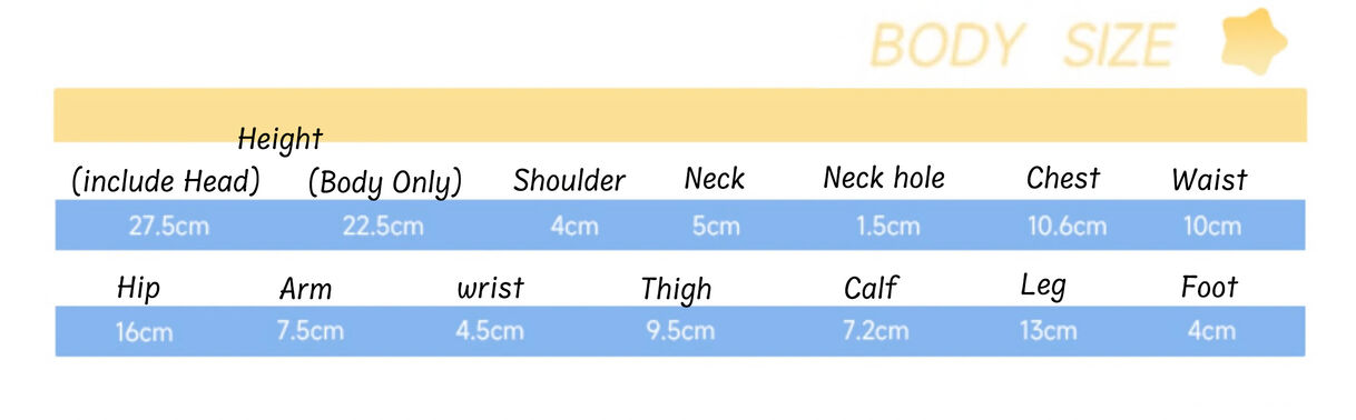 ※ 各サイズはメーカー公式データを記載しています。実際のドール・アイテムには個体差により多少の誤差があります。