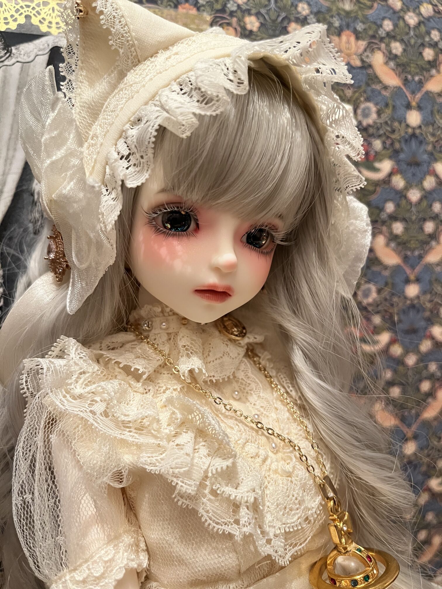 上品なレース使いと、ドールのボディを引き立てる美しいシルエットを両立する圧倒的な完成度。ネコ耳がかわいいヘッドドレスは長くて繊細なリボンを結んでも結ばなくても楽しめる仕様となっています。