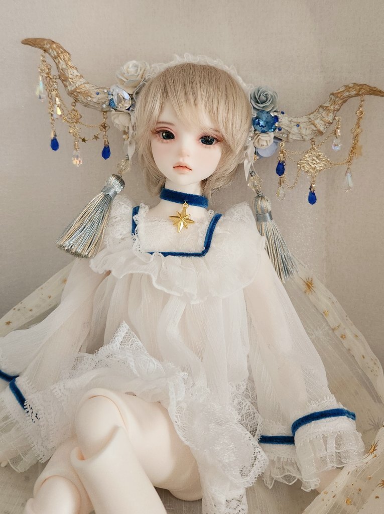 人気コラボレーションで衣装制作を多く手掛けるSleeping forest。今回は、性別のない天使ボディにぴったりなふわりと広がるトップスと、華奢な太ももを強調したショートパンツのコーディネートに、夢見心地な世界観を反映させた長いマントや小さな冠をセットにしています。すらりと伸びる白い足に映える、金色の縁取りがされたガーターつきのソックスなど、細部までこだわりを感じさせるディテールで仕立てられています。
