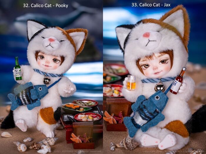 32~33. Calico Cat: 猫ジャンプスーツ、ネックレス、魚カバン