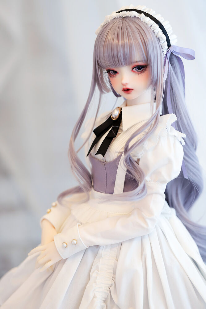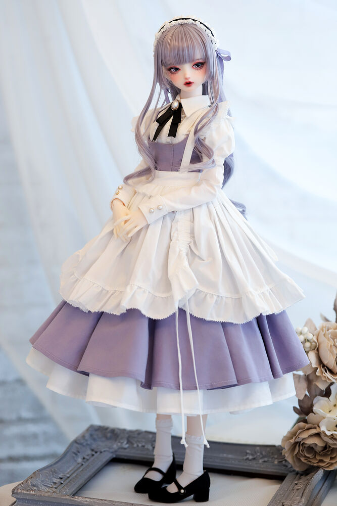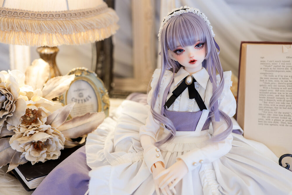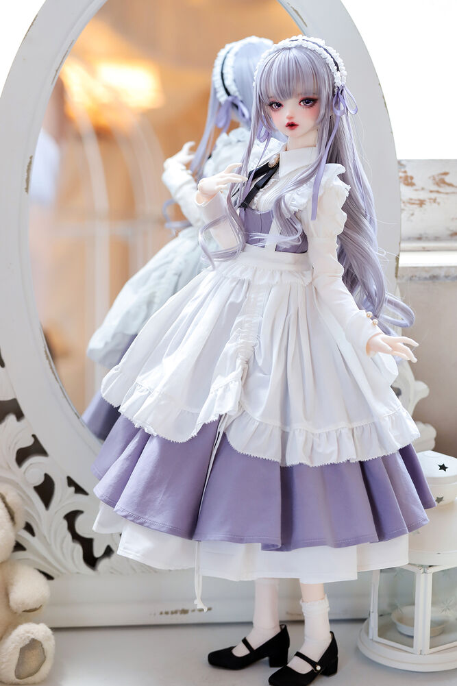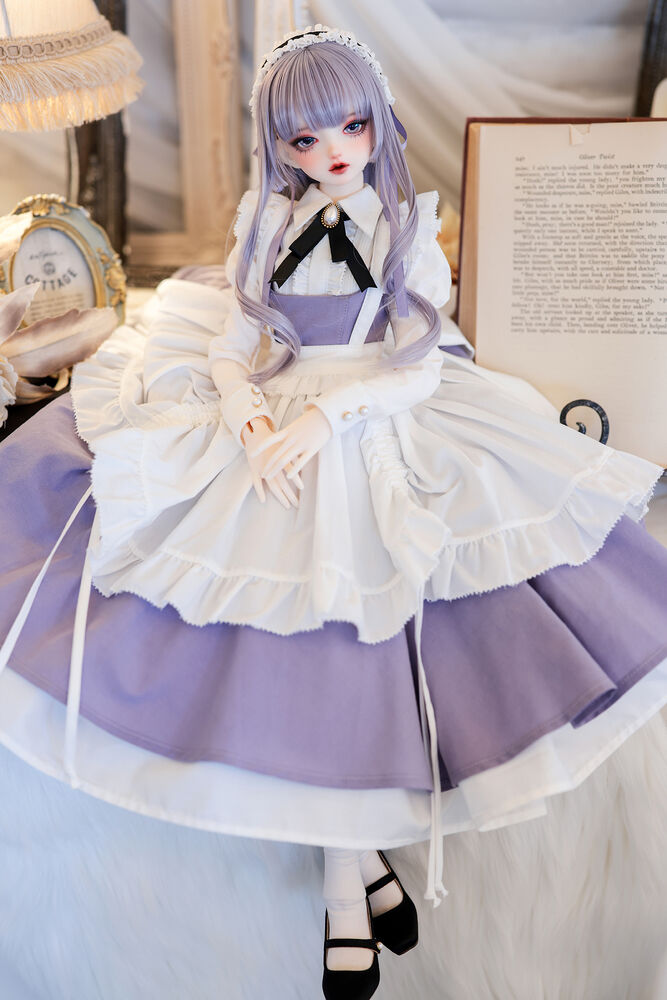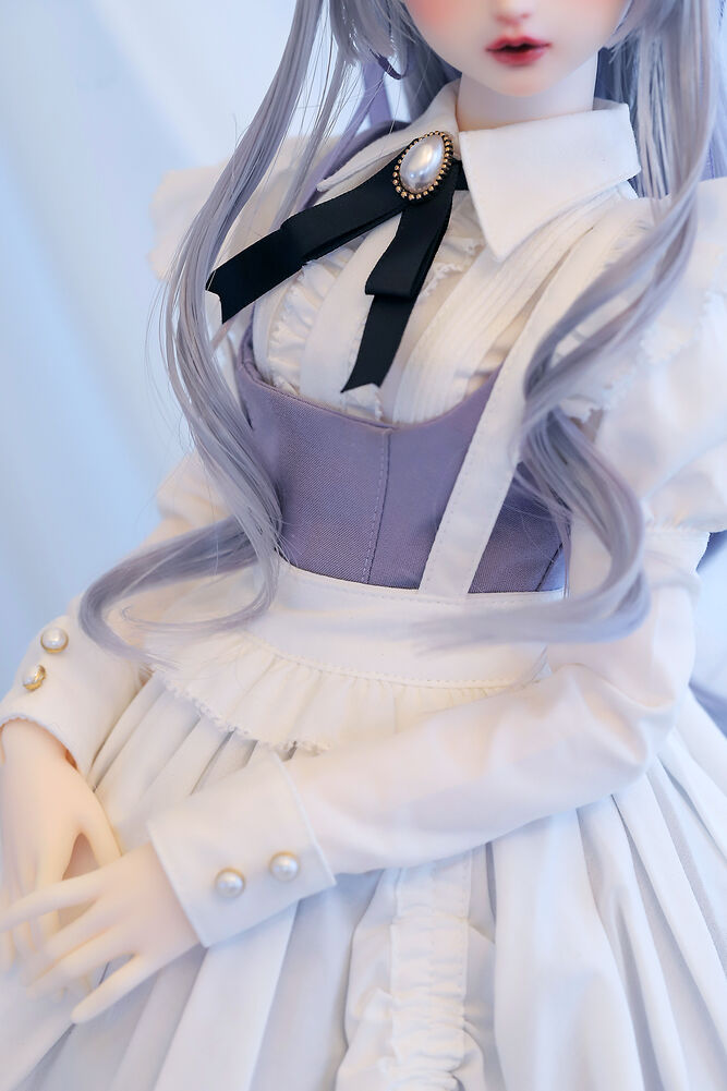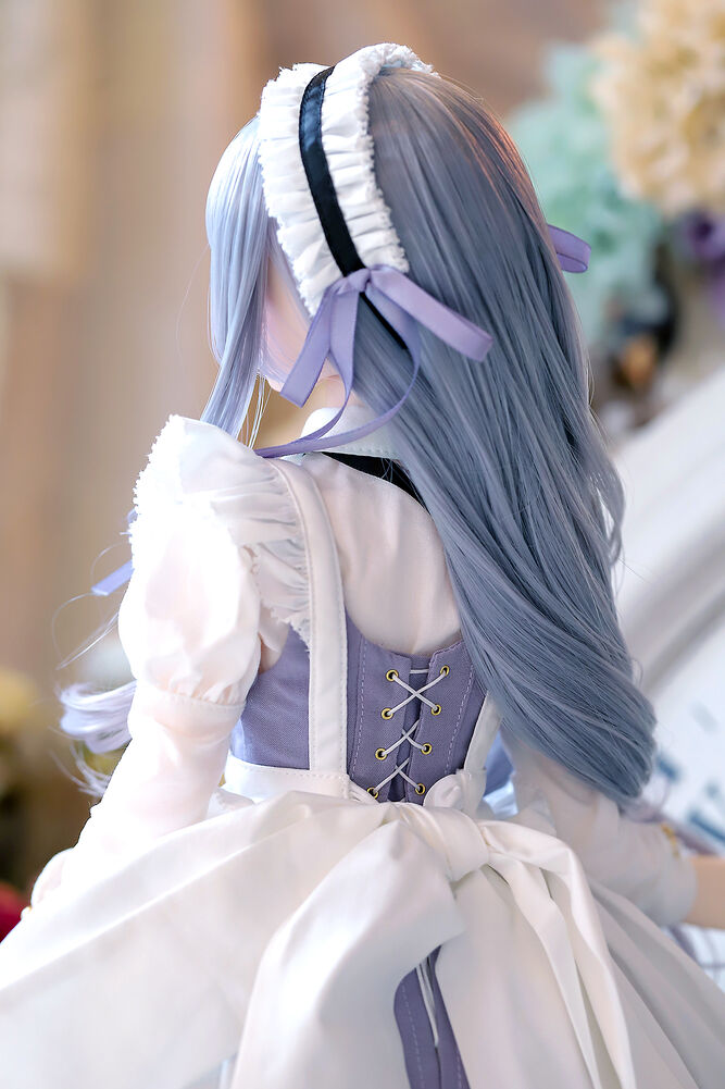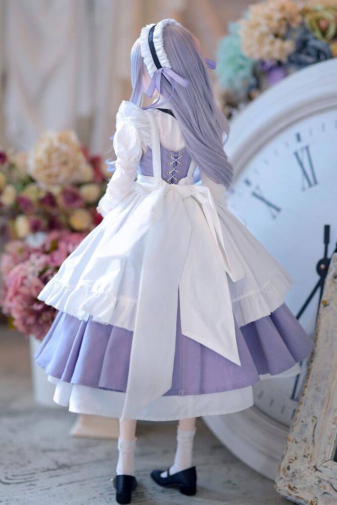 大人気のモダンメイド服をベースに、Asleep EidoronのIvyのためにコラボ限定の一着が仕立てられています。アッシュパープルのくすみカラーの生地を採用することで、ブラックのメイド服にはなかった軽やかさとドールならではの優雅な世界観に奥行きを与えています。