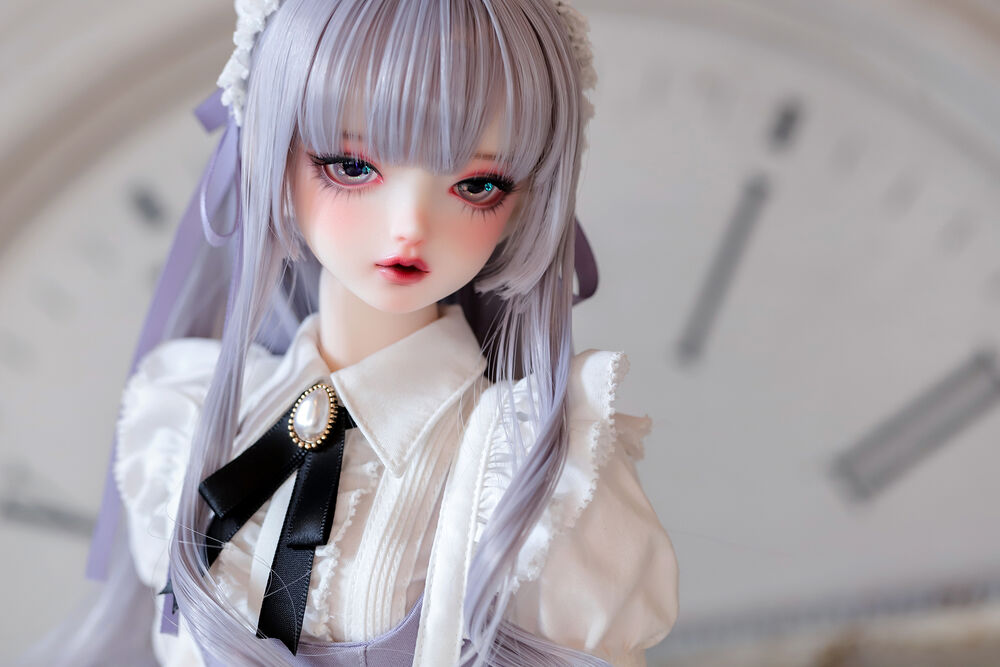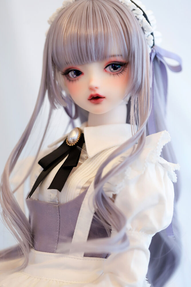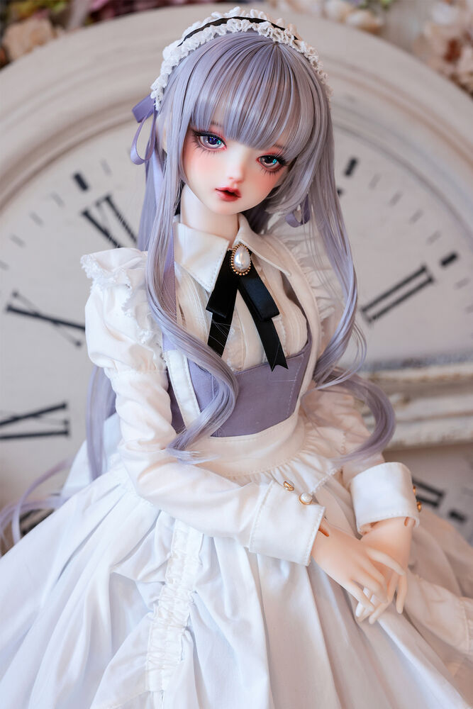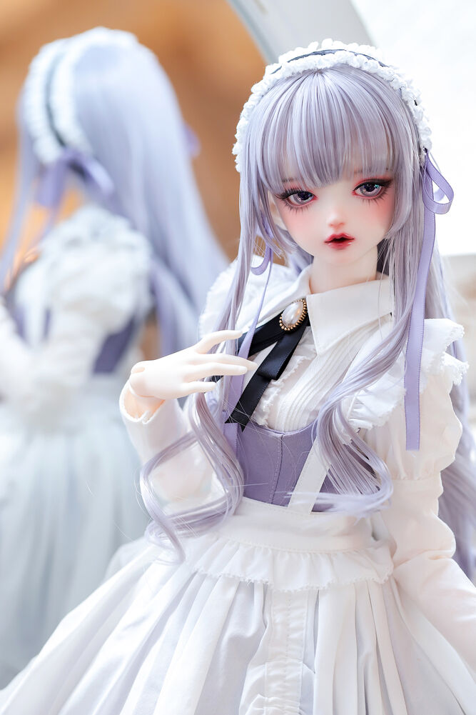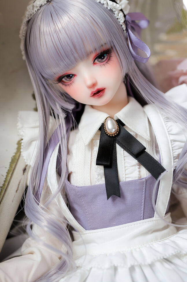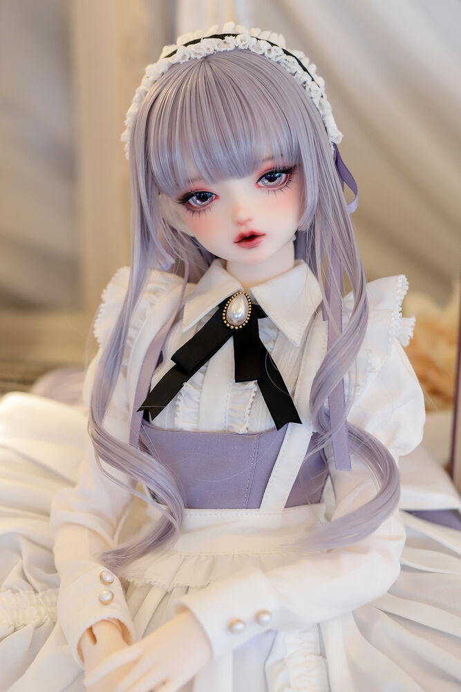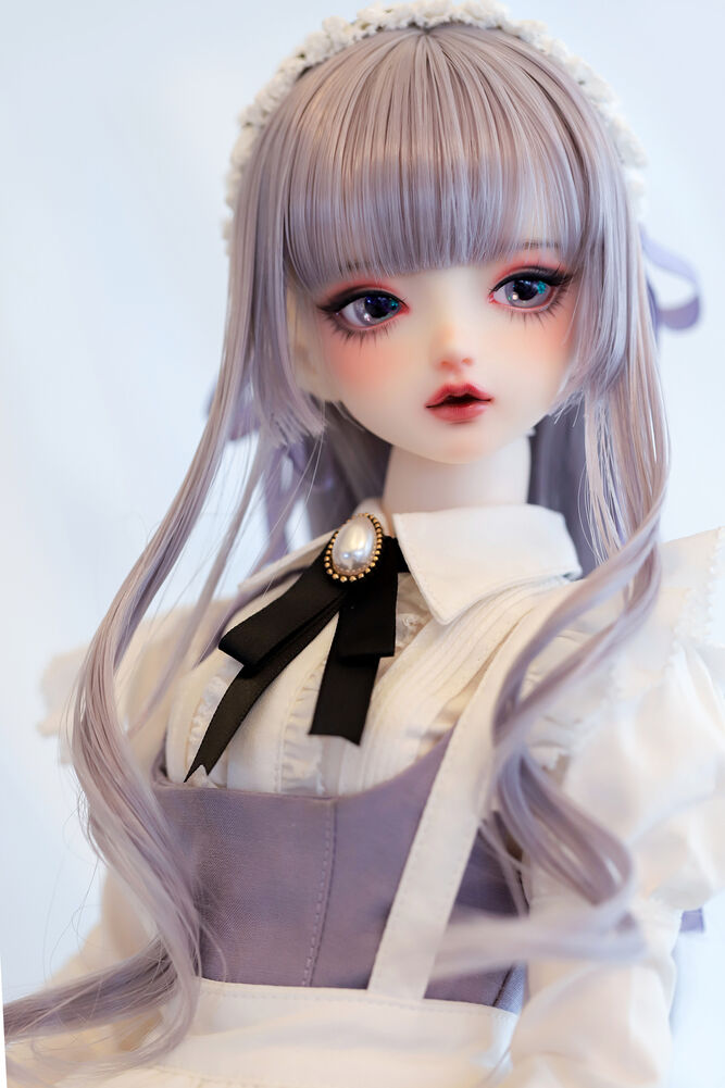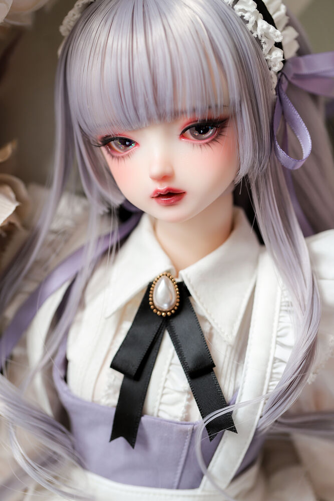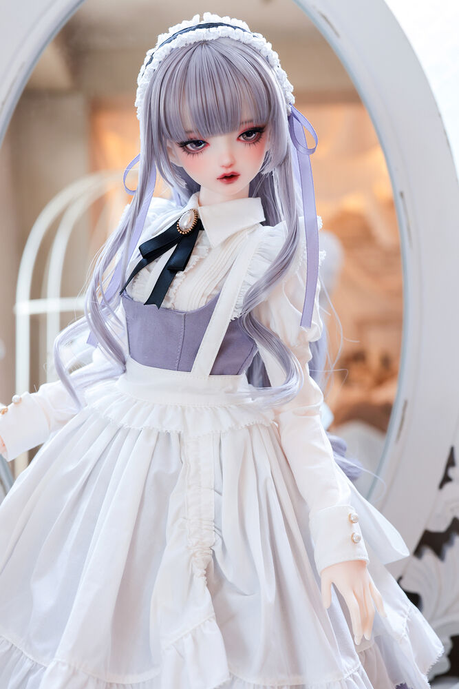大人気のモダンメイド服をベースに、Asleep EidoronのIvyのためにコラボ限定の一着が仕立てられています。アッシュパープルのくすみカラーの生地を採用することで、ブラックのメイド服にはなかった軽やかさとドールならではの優雅な世界観に奥行きを与えています。