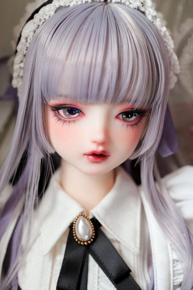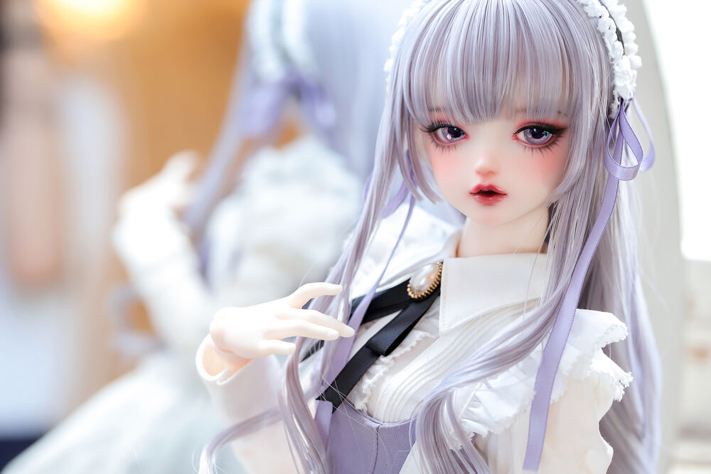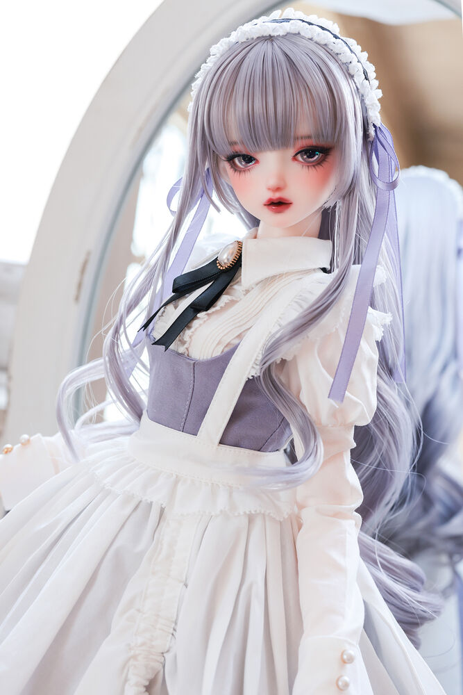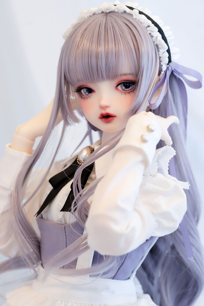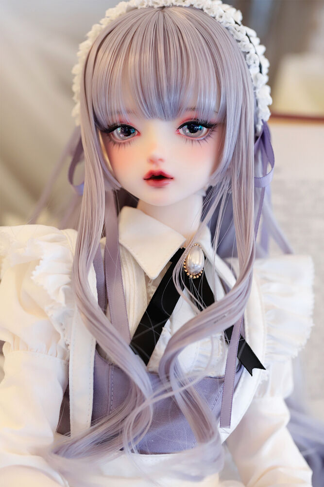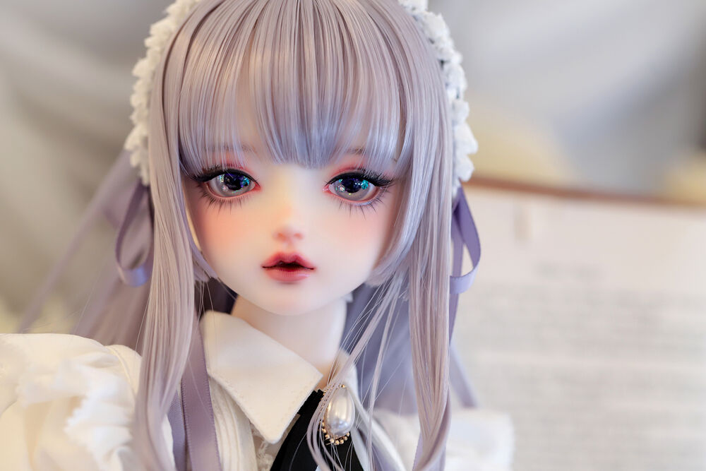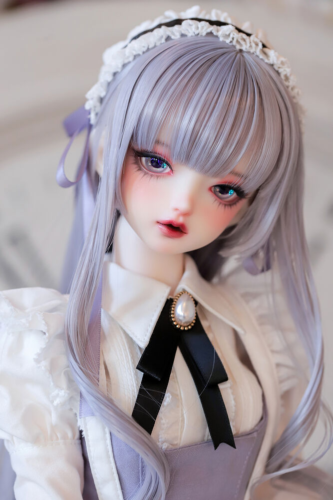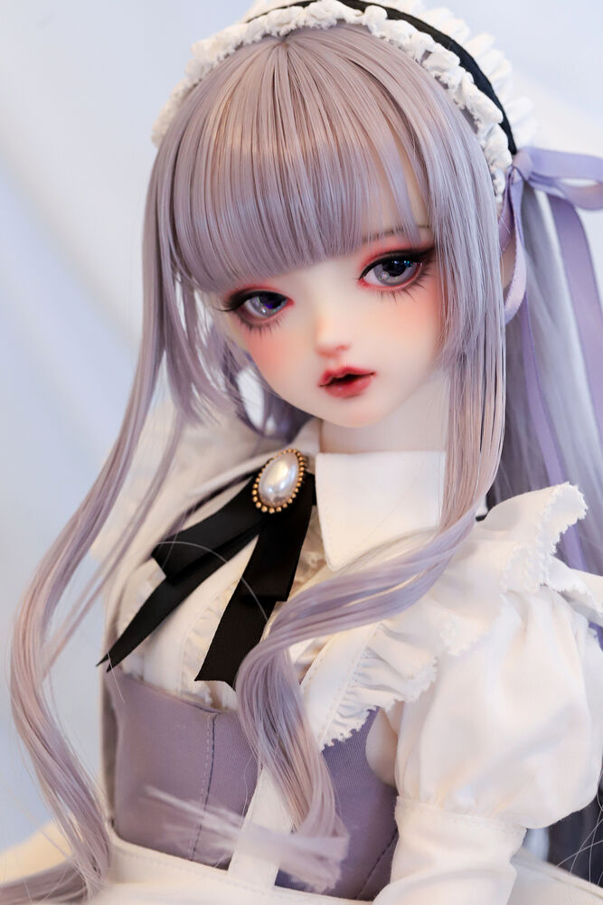 大人気のモダンメイド服をベースに、Asleep EidoronのIvyのためにコラボ限定の一着が仕立てられています。アッシュパープルのくすみカラーの生地を採用することで、ブラックのメイド服にはなかった軽やかさとドールならではの優雅な世界観に奥行きを与えています。