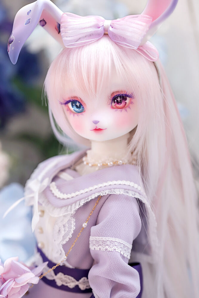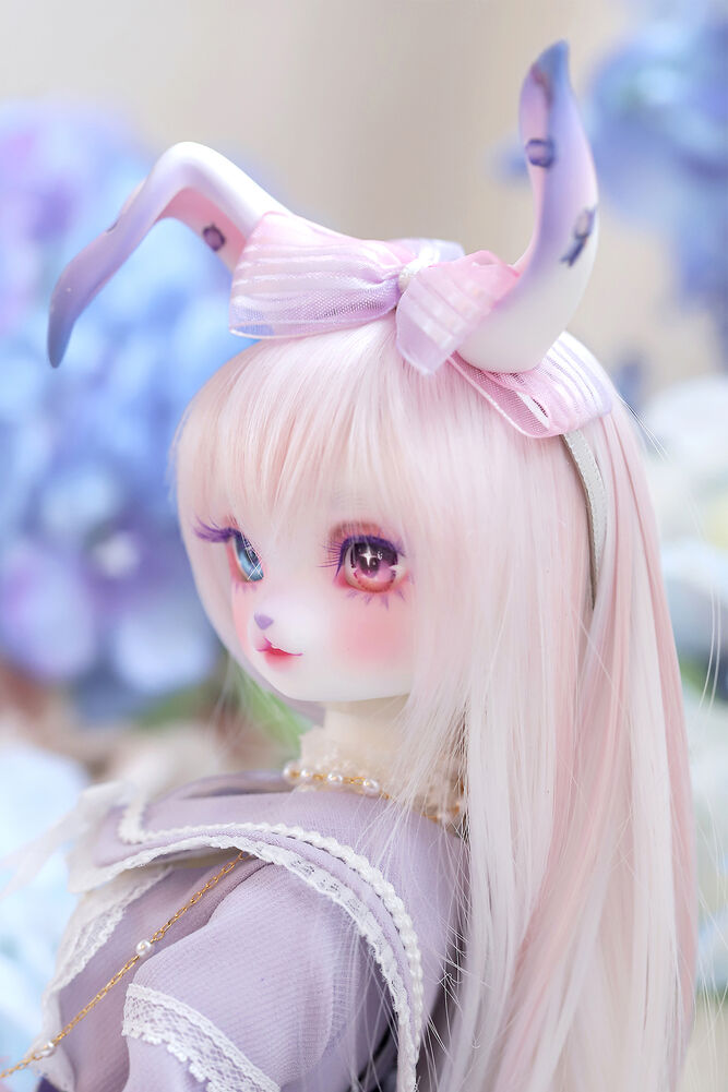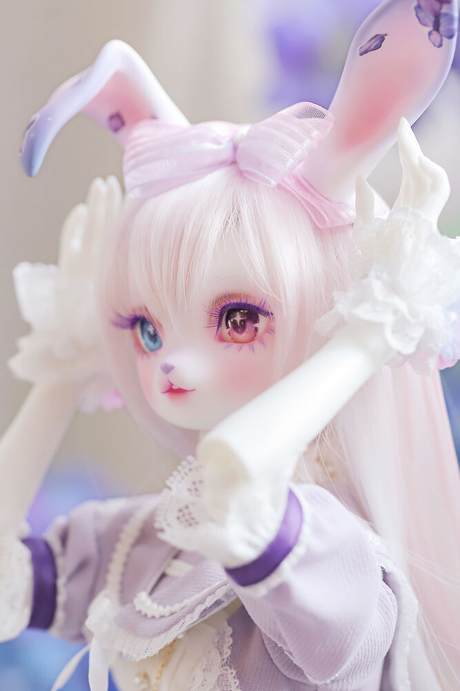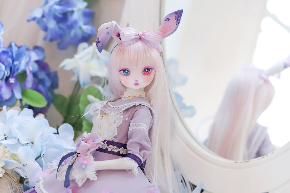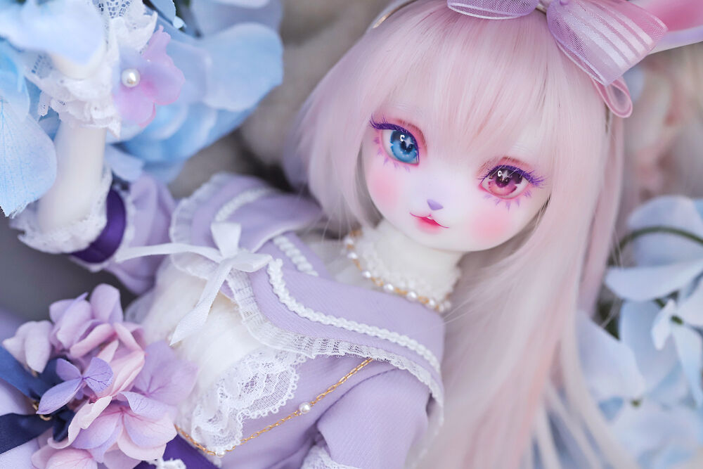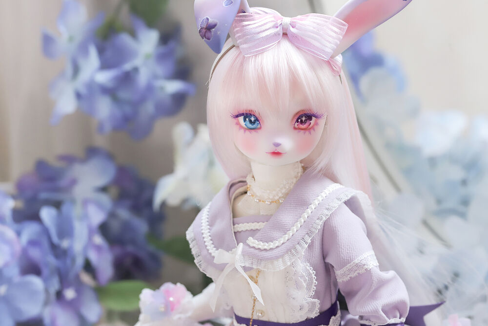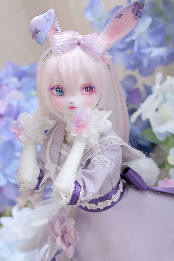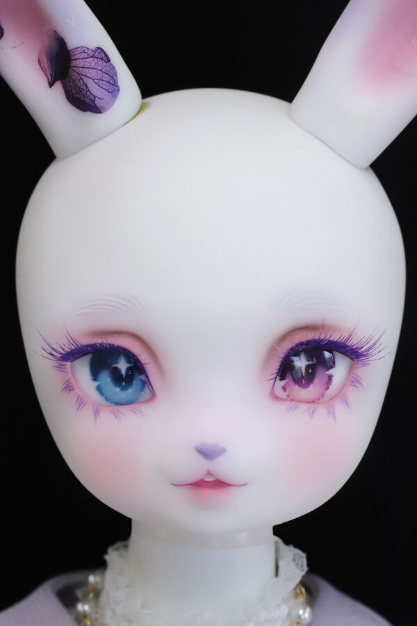 うさぎらしい愛くるしい表情や、ピンク×パープルのゆめかわカラーリング、紫陽花のデカールシールで華やかにするだけでなく、紫色の睫毛は白の睫毛をわざわざ塗装して制作するなど細部まで手間暇をかけた仕上がりとなっています。