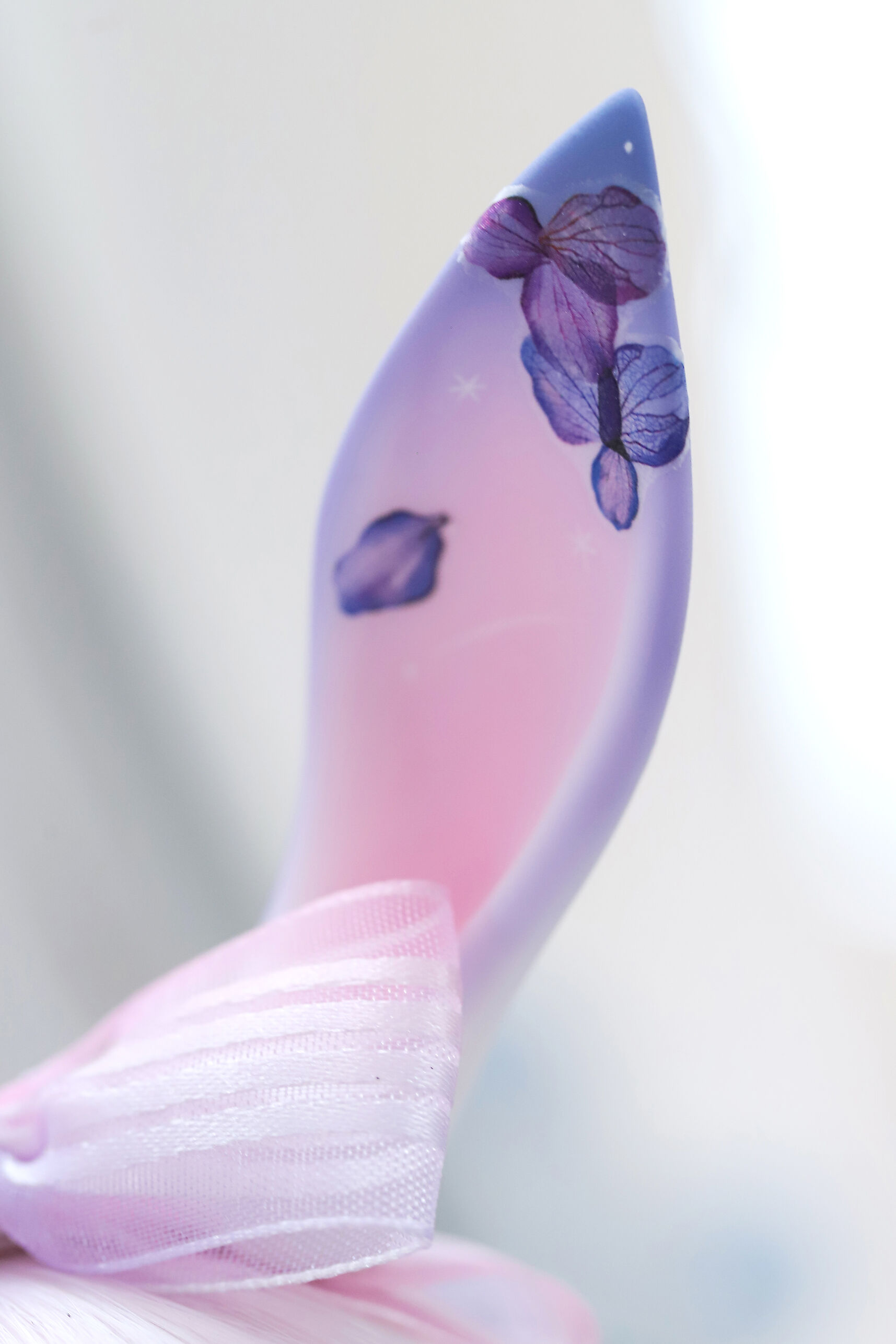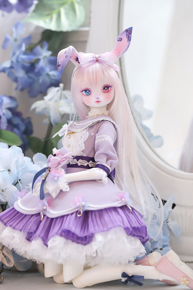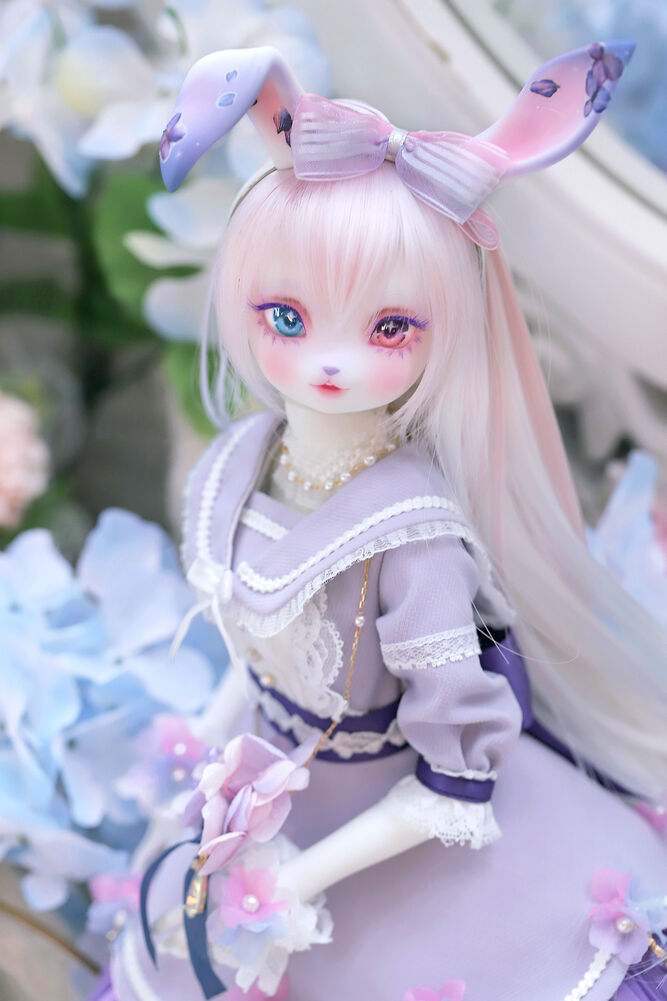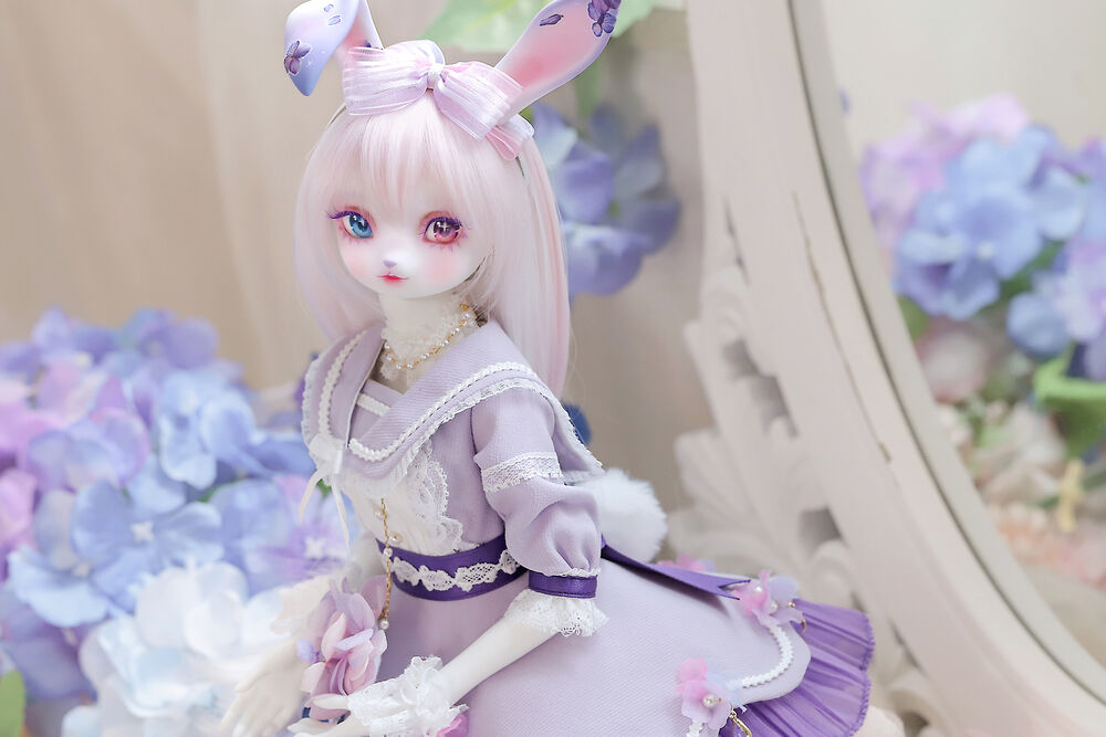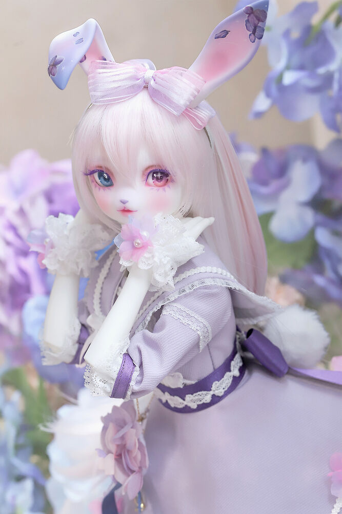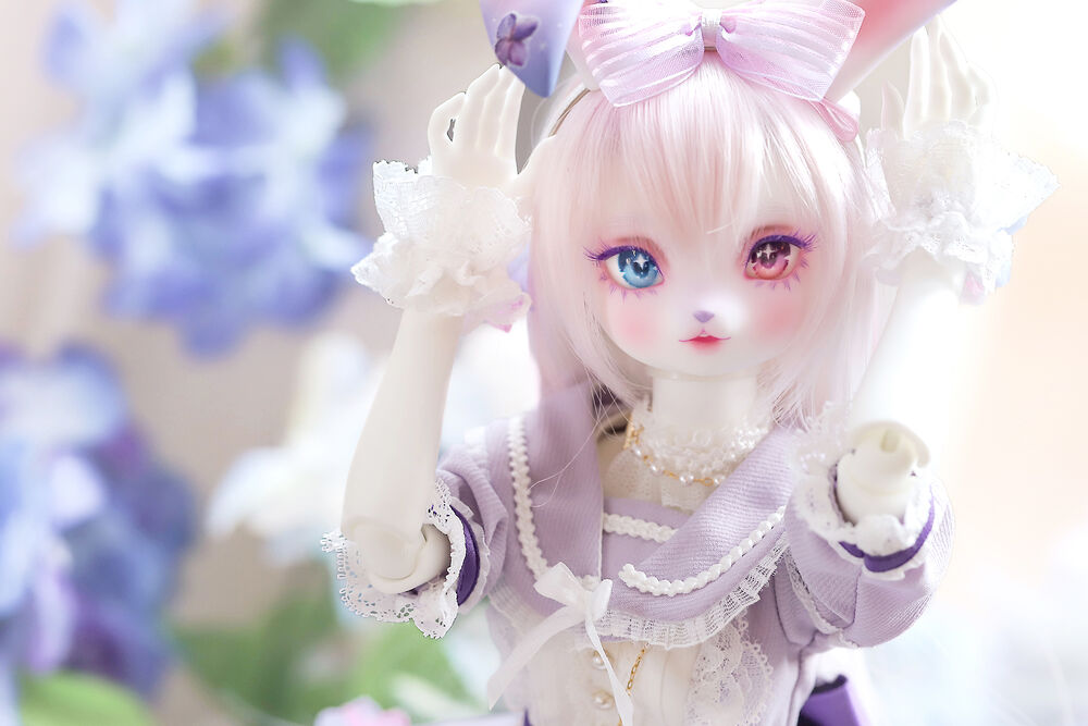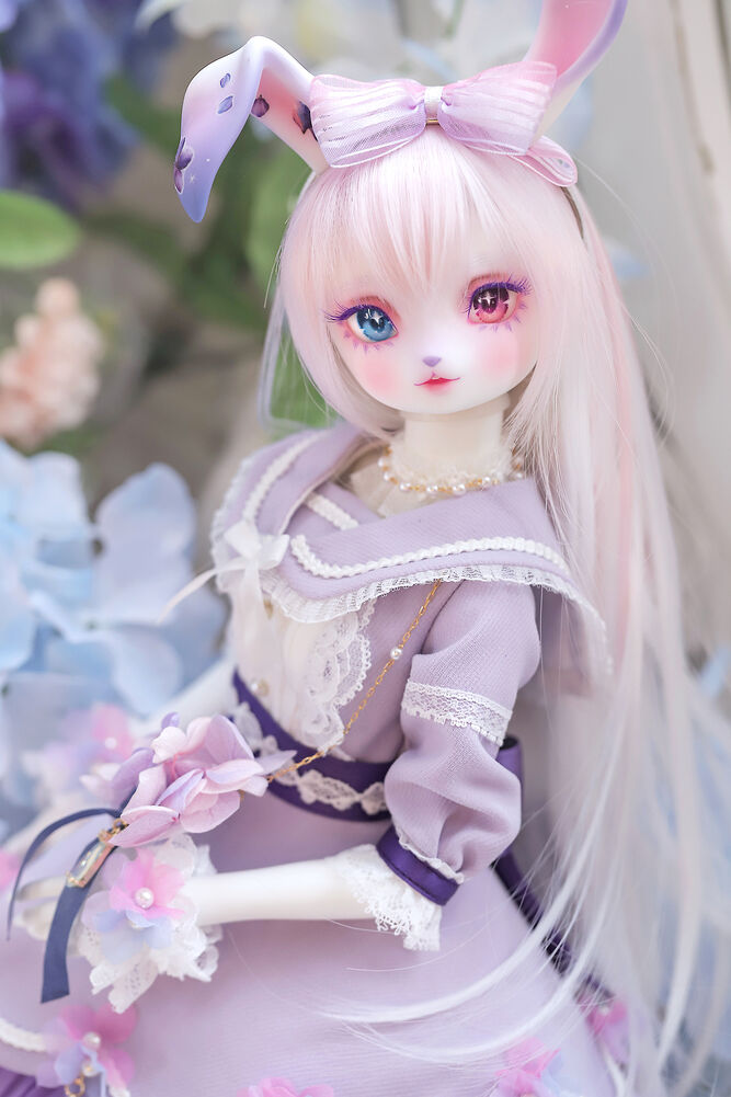 うさぎらしい愛くるしい表情や、ピンク×パープルのゆめかわカラーリング、紫陽花のデカールシールで華やかにするだけでなく、紫色の睫毛は白の睫毛をわざわざ塗装して制作するなど細部まで手間暇をかけた仕上がりとなっています。