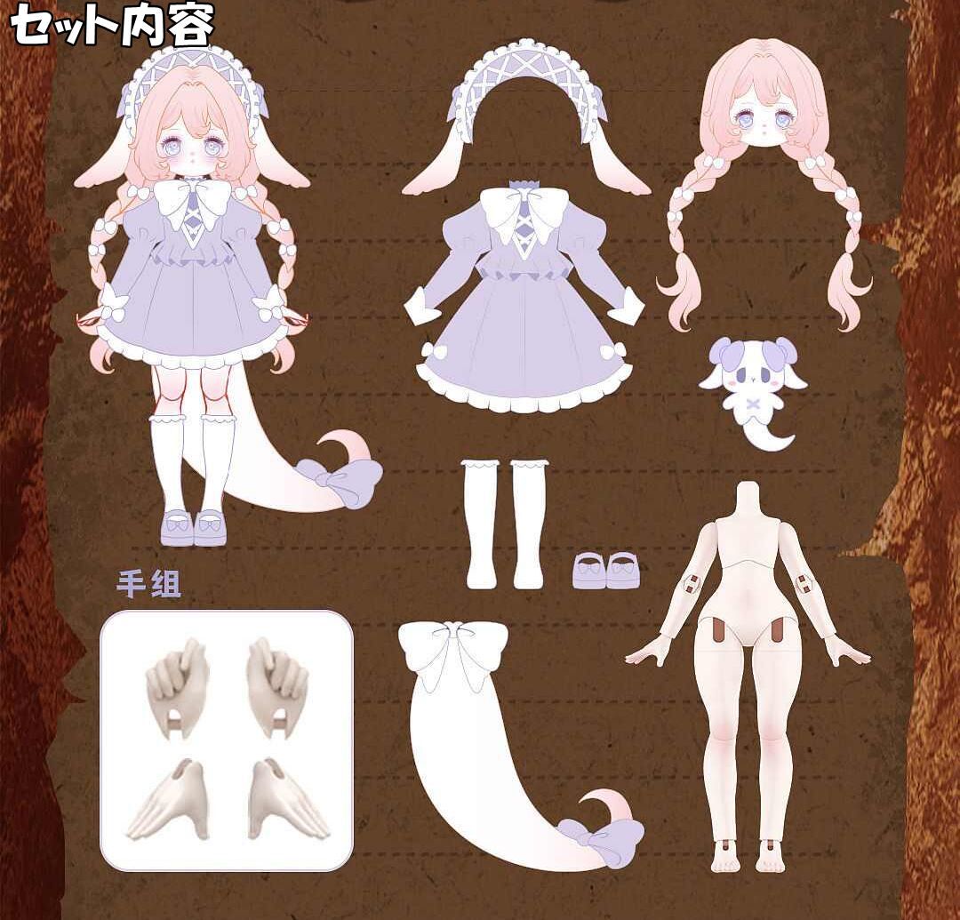 【初回特典】ヒールパーツセット*6、ランダムアイプレート*6、ハンドパーツセットA(2ペア入り)*6、ハンドパーツセットB(2ペア入り)*6、ノーメイク フェイスプレート(ノーマルスキン)*6、寝巻きドレス*1、ランダムメイク済フェイスプレート*6、ボディ+ハンド6ペアセット(ノーマルスキン)*1、ドール「ドクロウィング」SPカラーセット*1、シューズ*6、アウトフィット「水季謠」*1、巨尾ひつじ・パラレルカラーヘッドセット*1、ボディ+ハンド6ペアセット(SPホワイトスキン)*1 が追加で付属します。