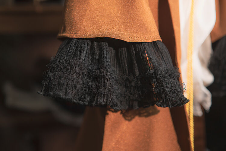 アビシニアンらしい色使いをベースとした生地選びをはじめ、古代エジプトの壁画に描かれている「聖なる猫」と似ていると語られるアビシニアンのイメージを衣装の細部にエジプシャンな要素として落とし込み、長いガウンや下着と一体化した尻尾など、ユニークな解釈を感じられる特別な1着が完成しています。また、ガウンの襟やファーにはワイヤーが入れられているためポージングで微細な表情を自由につけられます。