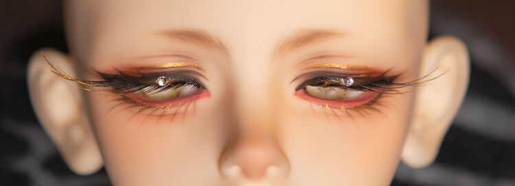 Lance Daydreamの伏せた目元にデザインされた長いまつ毛は、目尻側が扇のように長いアイラッシュが採用されており、さらにゴールドの塗料でまつ毛の先端を彩ることによって、神秘的な表情が叶えられています。また、アイラインにキュービックをポイントとして取り入れ、より魅惑的な視線がたのしめる仕上がりとなりました。
