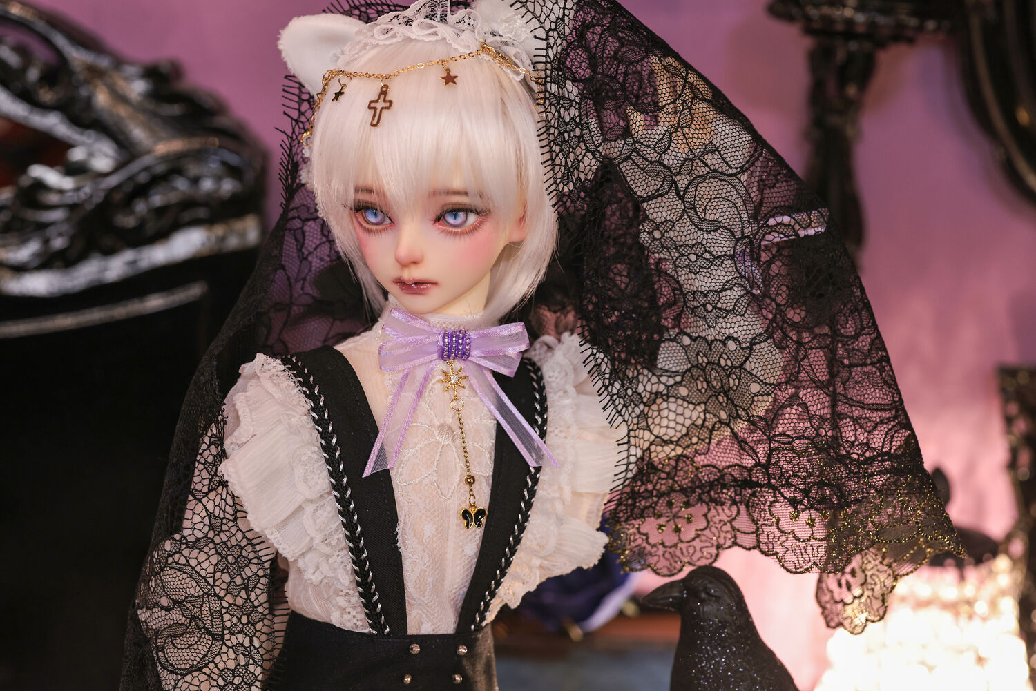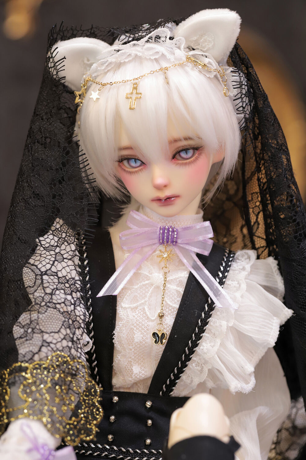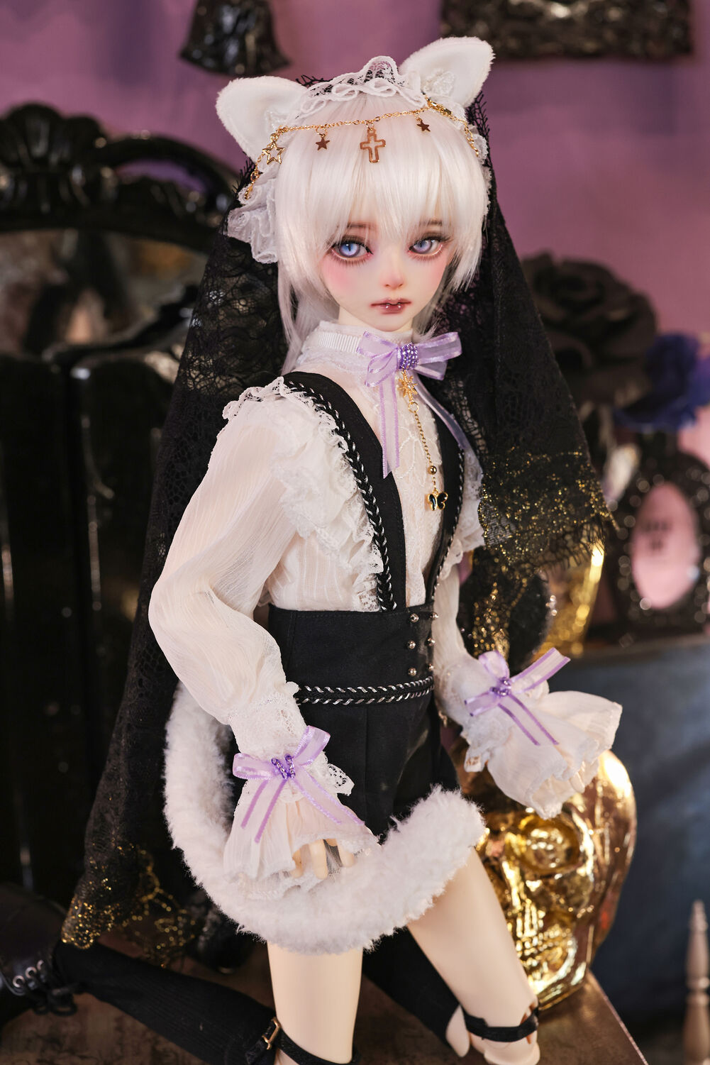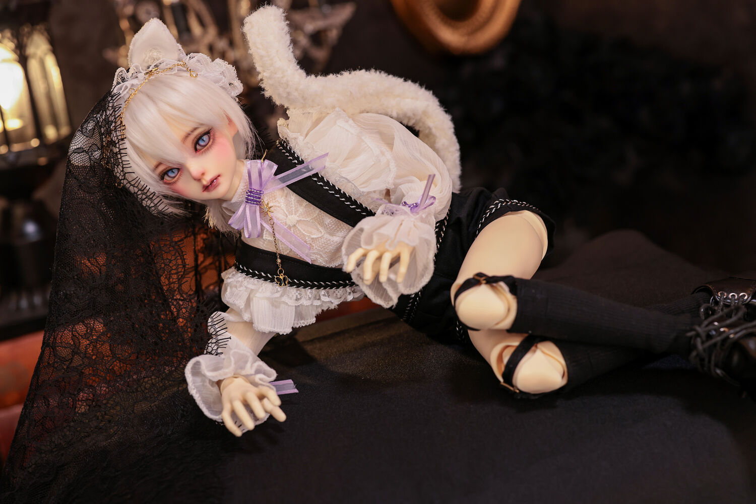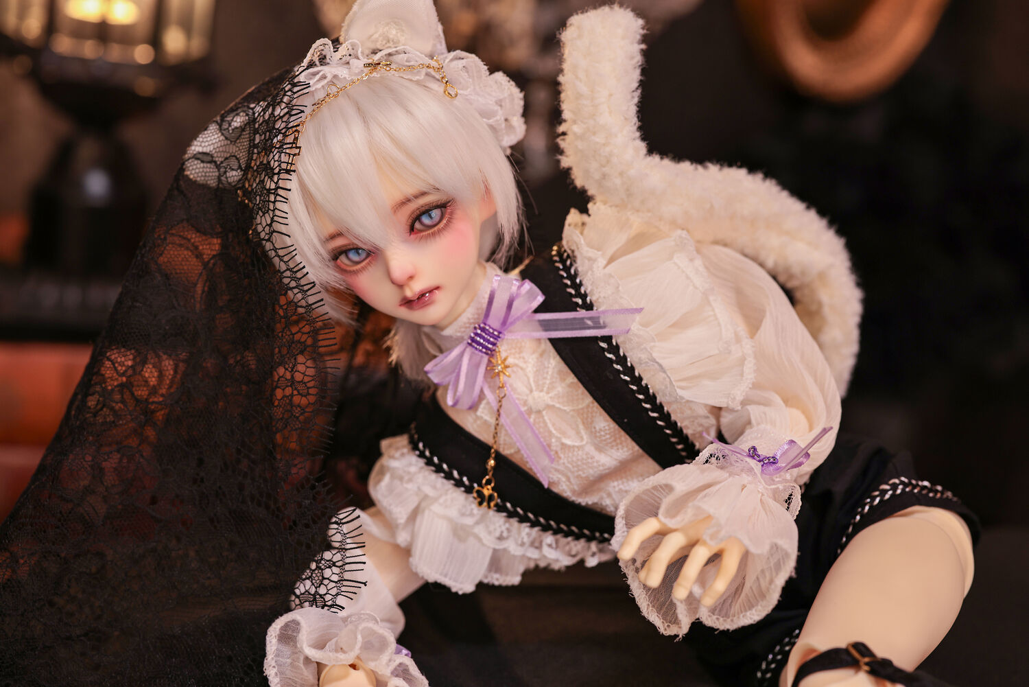 レースやフリルの細やかな装飾に、針金式で自在に表情を変えるしっぽ、金の縁取りが丁寧に施されたブラックベールが、可憐さの奥に潜む底知れぬ魅力を引き立てます。