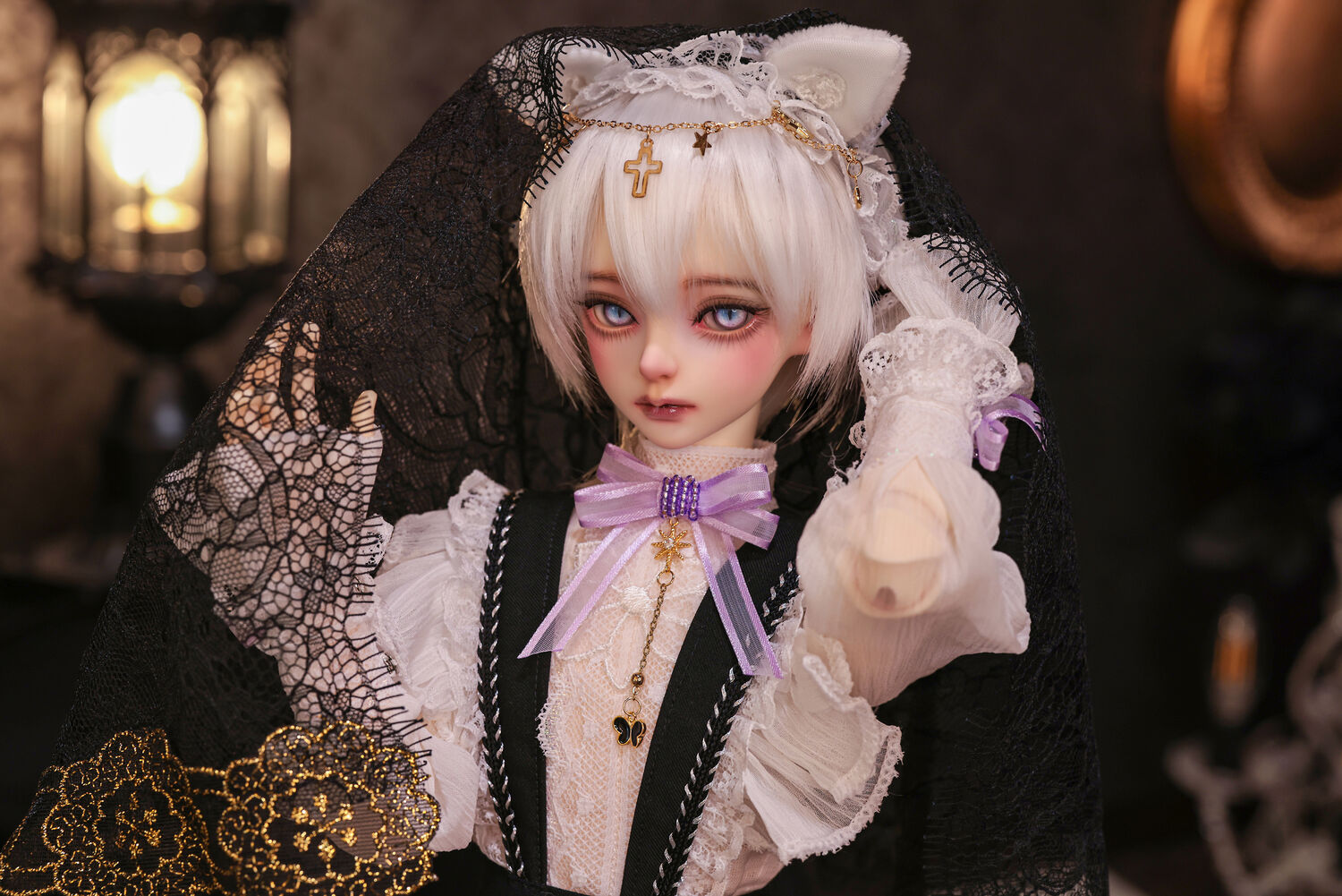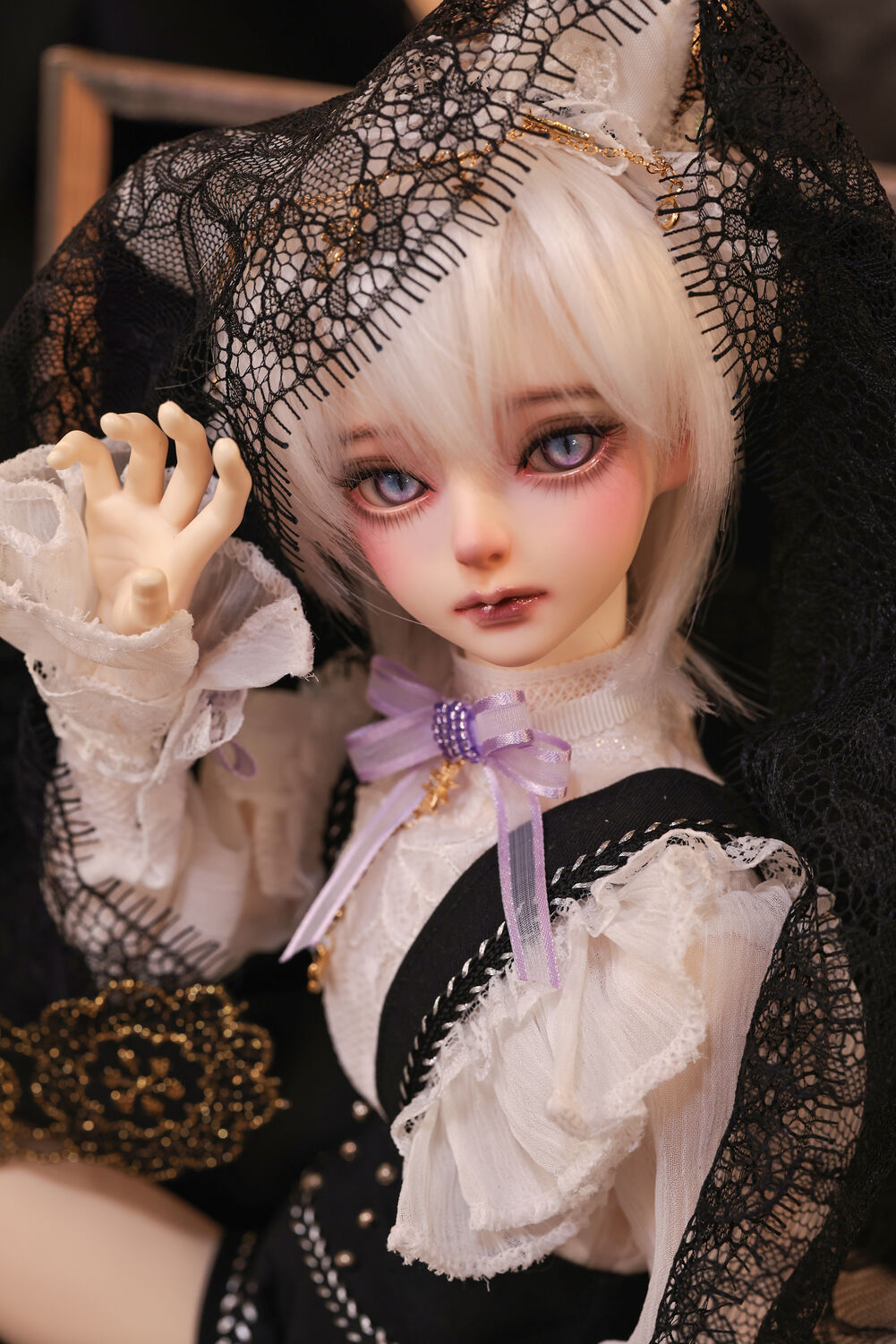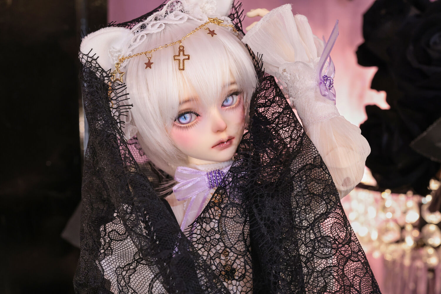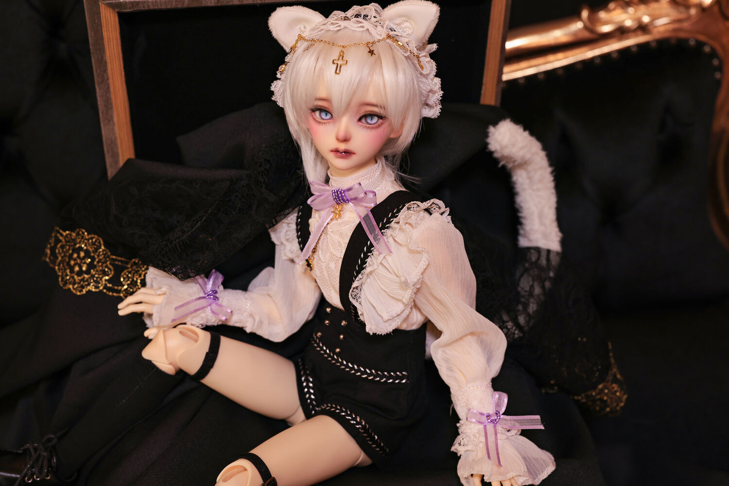 レースやフリルの細やかな装飾に、針金式で自在に表情を変えるしっぽ、金の縁取りが丁寧に施されたブラックベールが、可憐さの奥に潜む底知れぬ魅力を引き立てます。