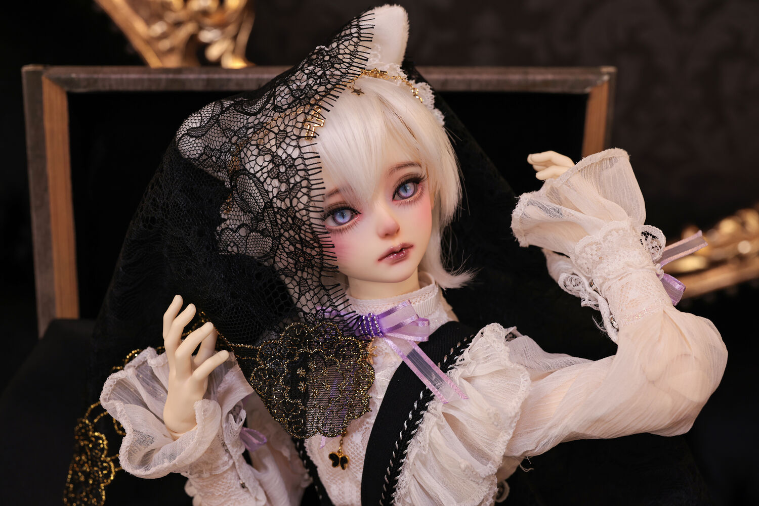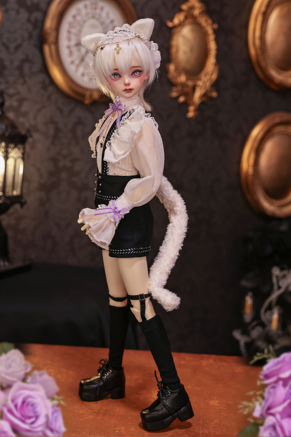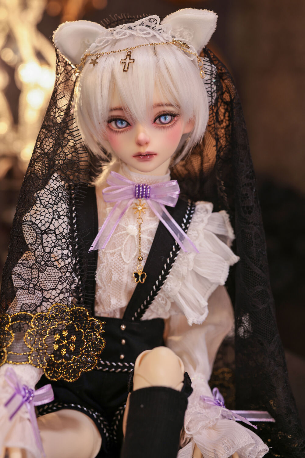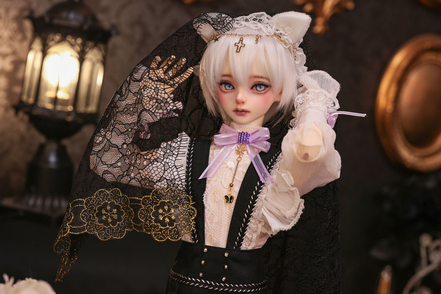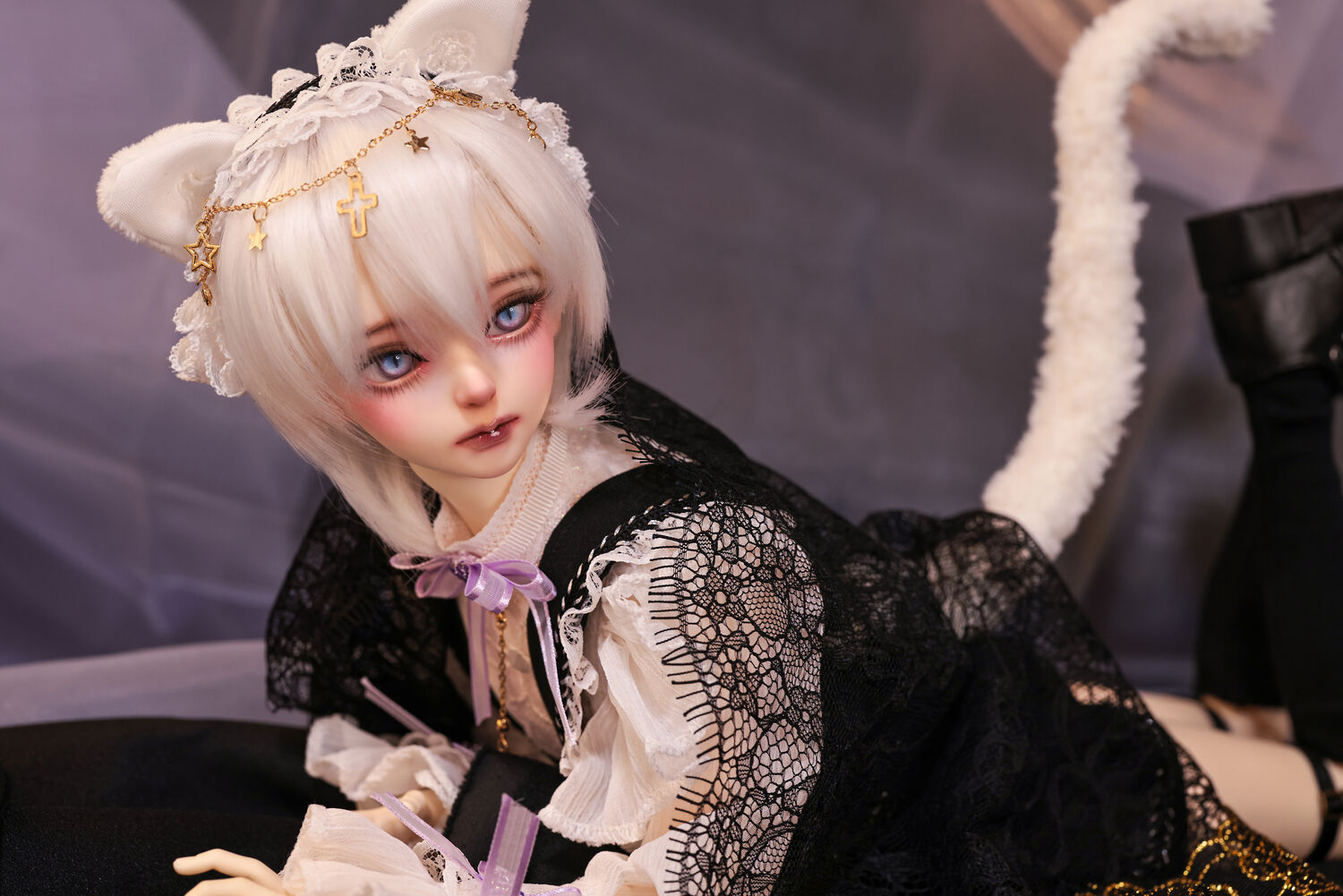 レースやフリルの細やかな装飾に、針金式で自在に表情を変えるしっぽ、金の縁取りが丁寧に施されたブラックベールが、可憐さの奥に潜む底知れぬ魅力を引き立てます。