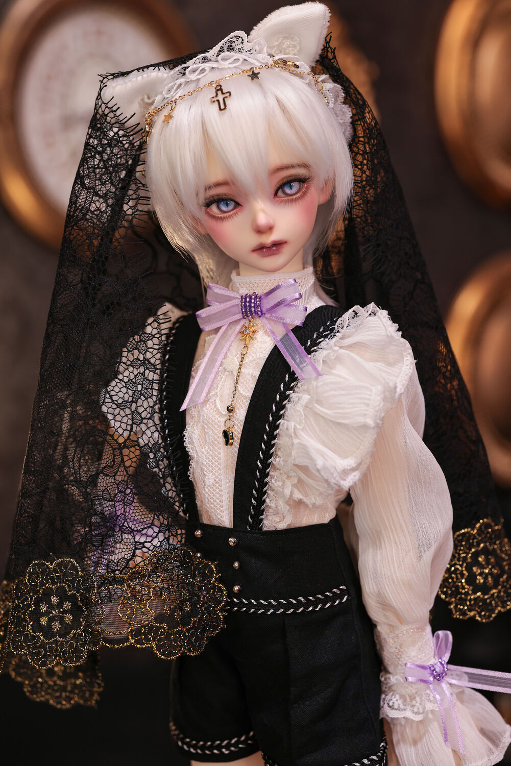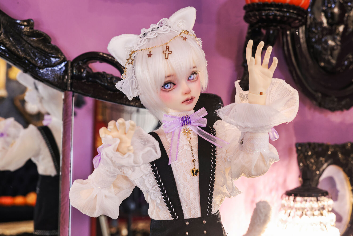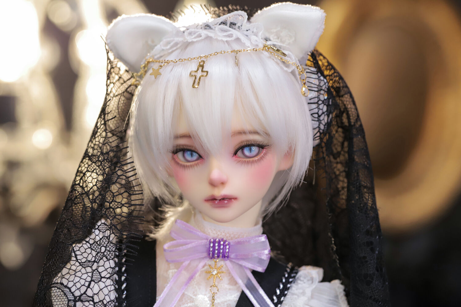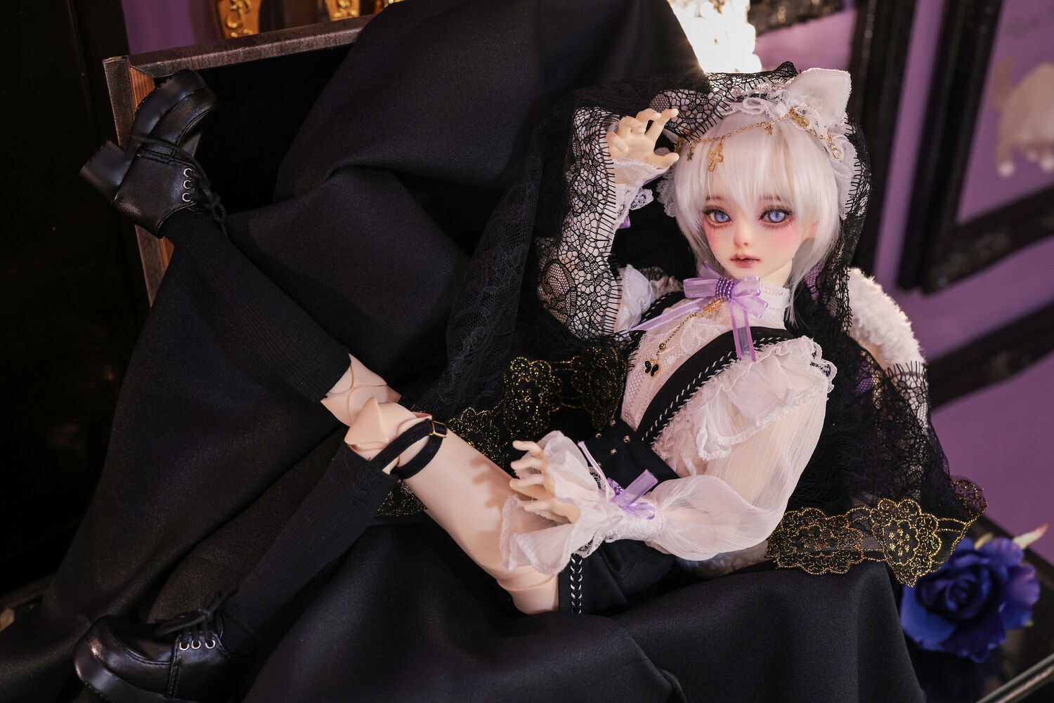 レースやフリルの細やかな装飾に、針金式で自在に表情を変えるしっぽ、金の縁取りが丁寧に施されたブラックベールが、可憐さの奥に潜む底知れぬ魅力を引き立てます。