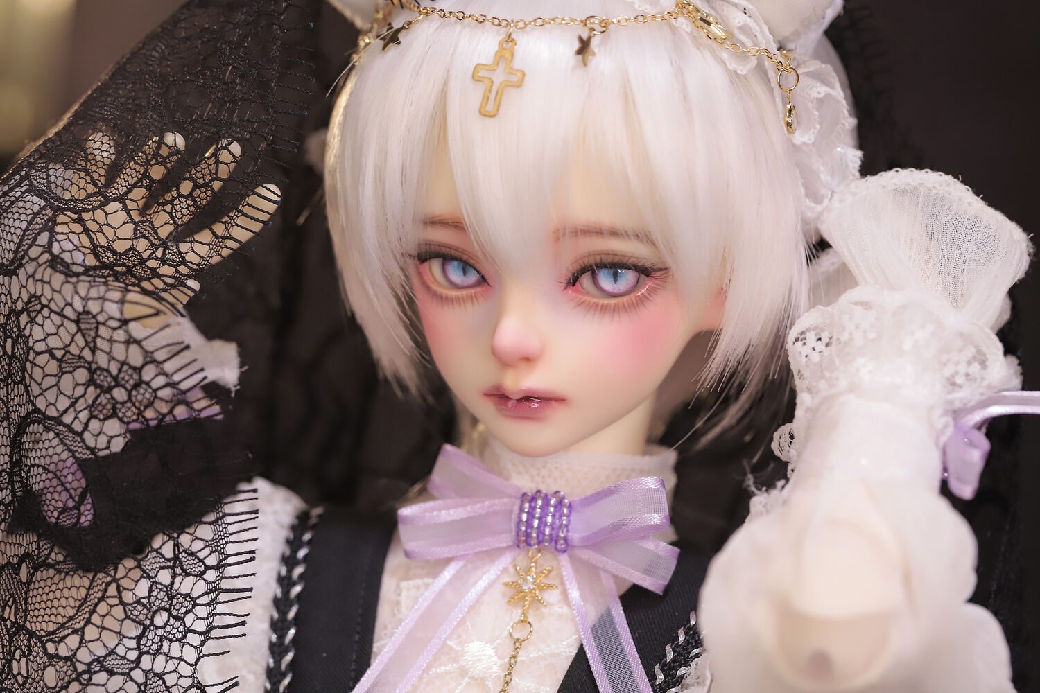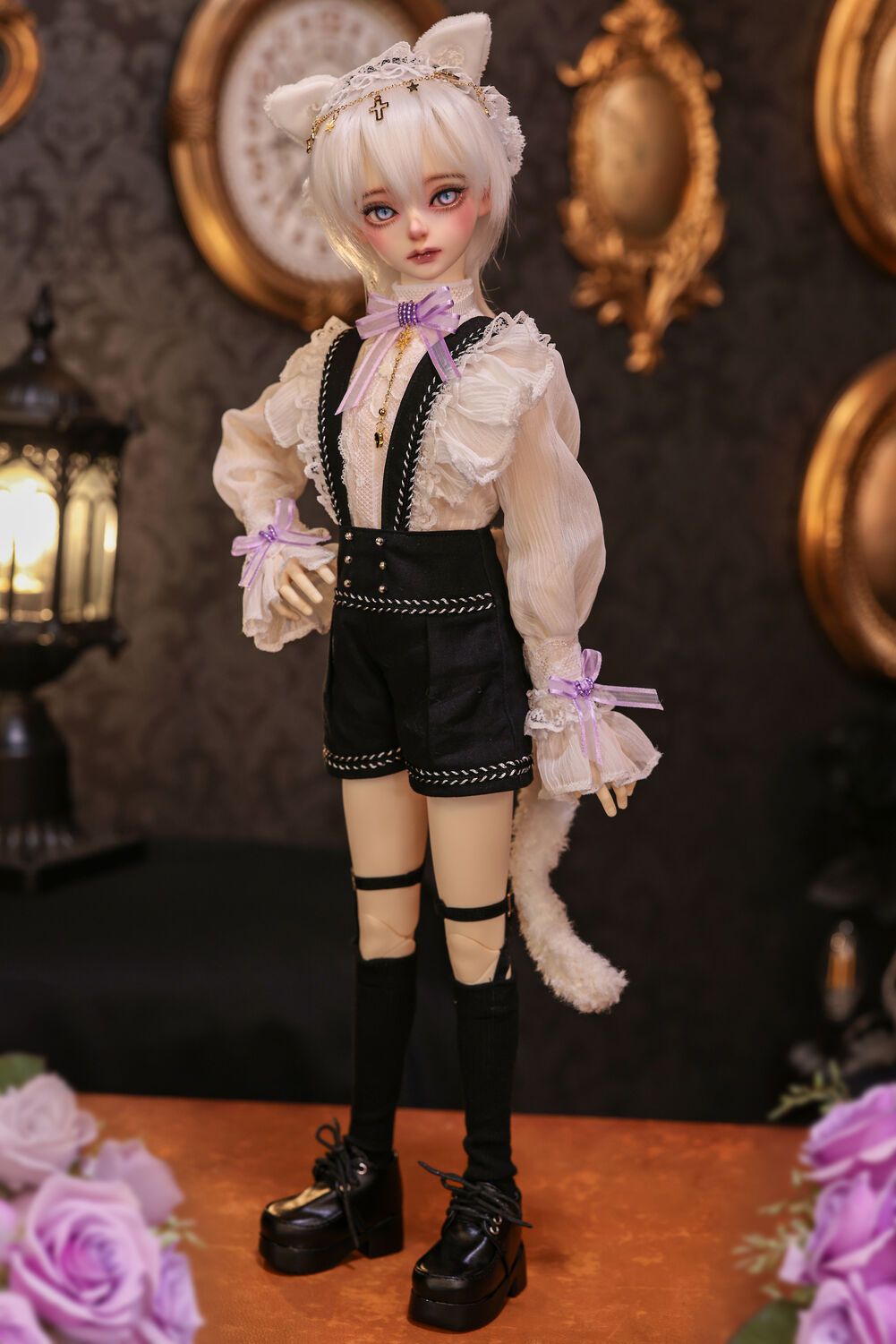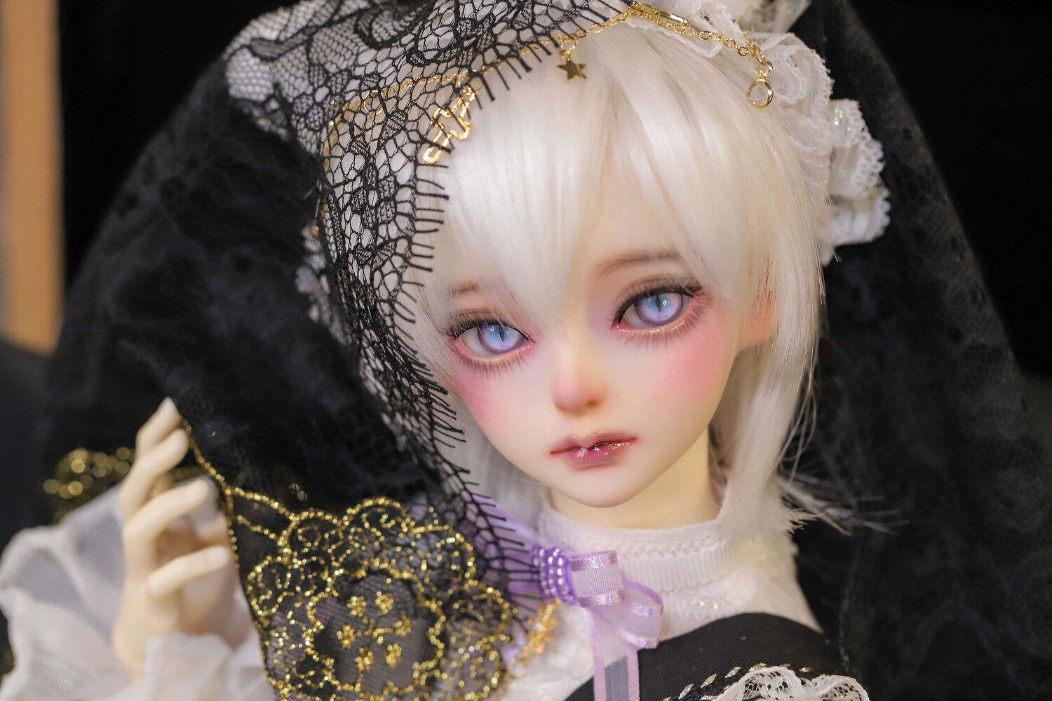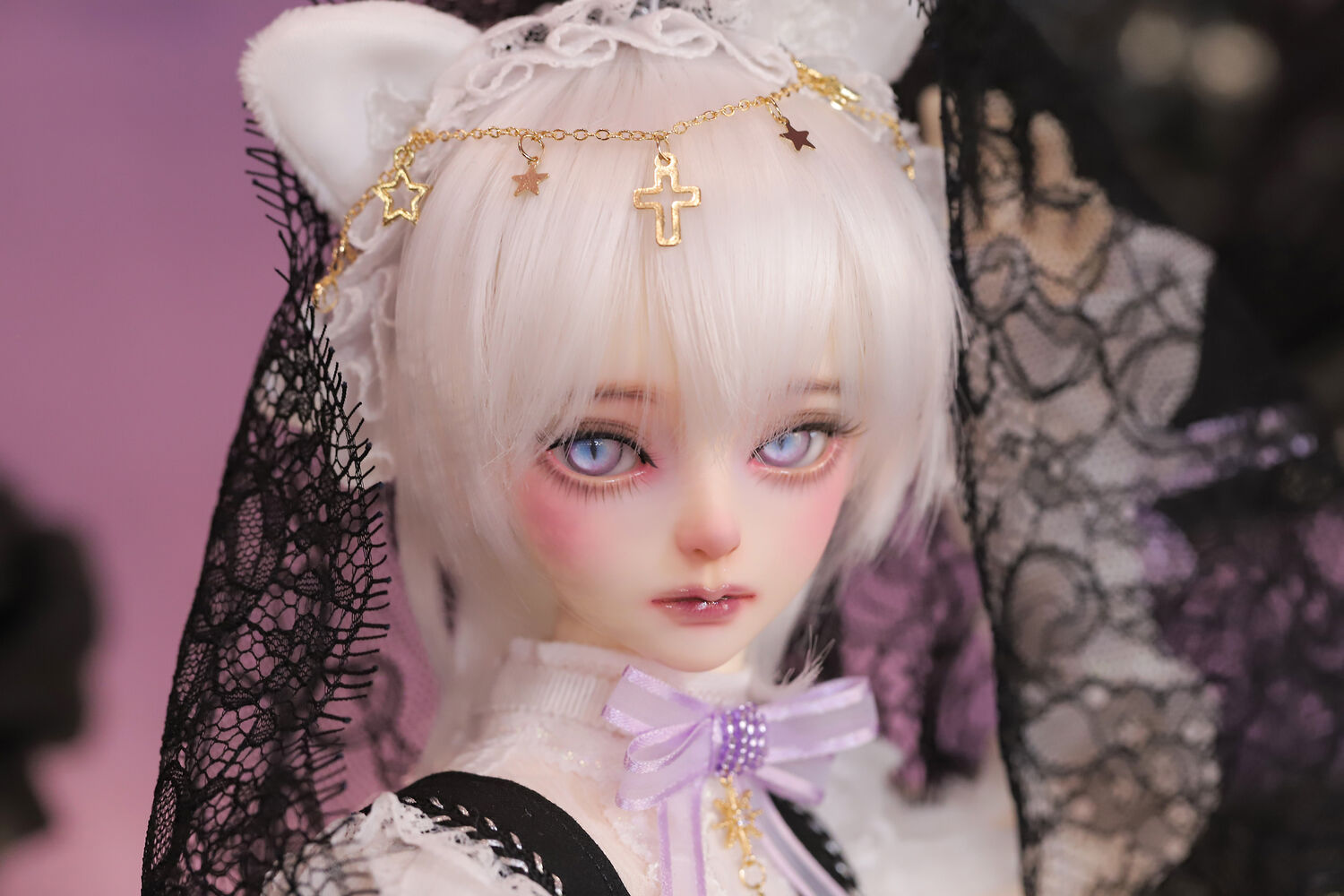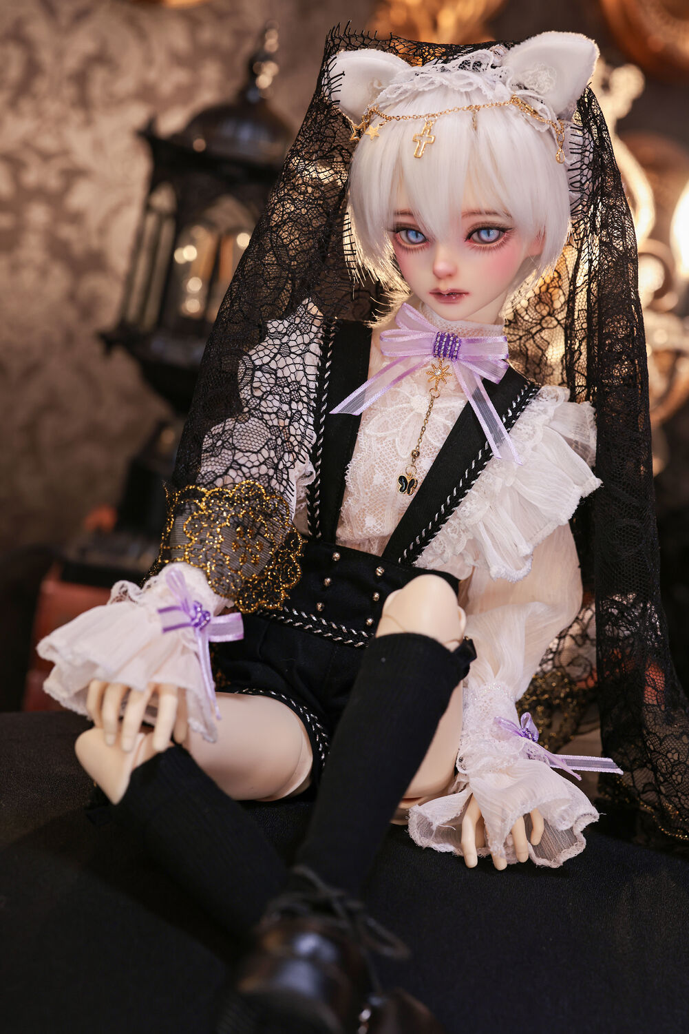 レースやフリルの細やかな装飾に、針金式で自在に表情を変えるしっぽ、金の縁取りが丁寧に施されたブラックベールが、可憐さの奥に潜む底知れぬ魅力を引き立てます。