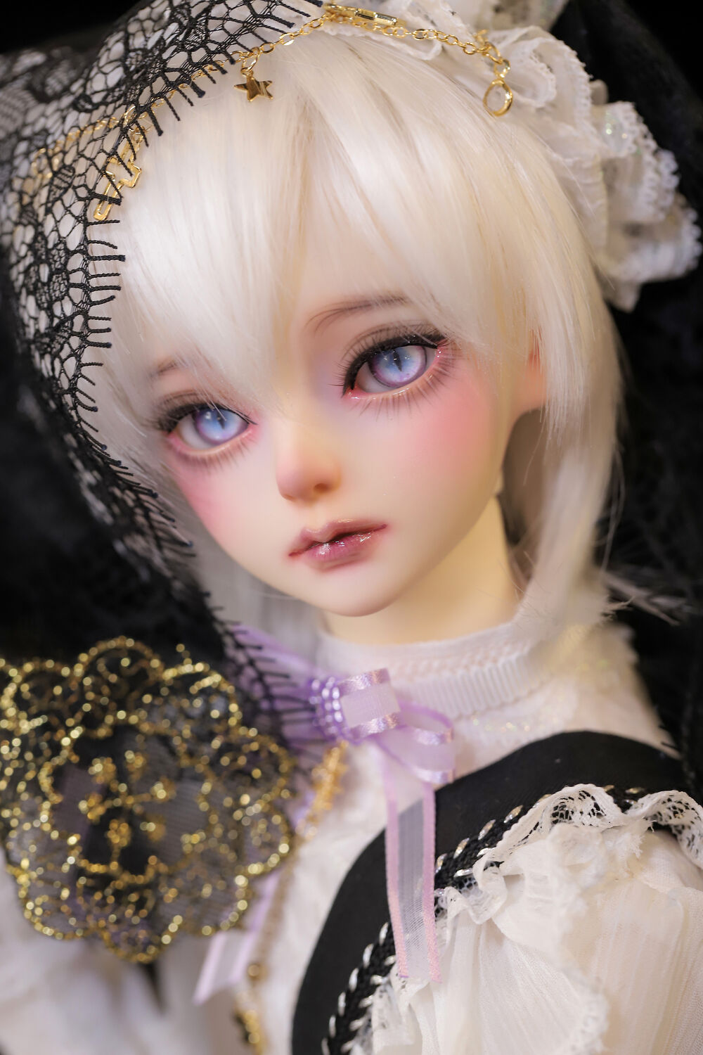 華やかでボリュームのあるフリルブラウス、光を纏うようなオーガンジー素材のリボンと、妖しさを添える黒金のベール、体躯にぴったりと沿うお仕立てが、幼さの中に滲む色気を潜ませます。