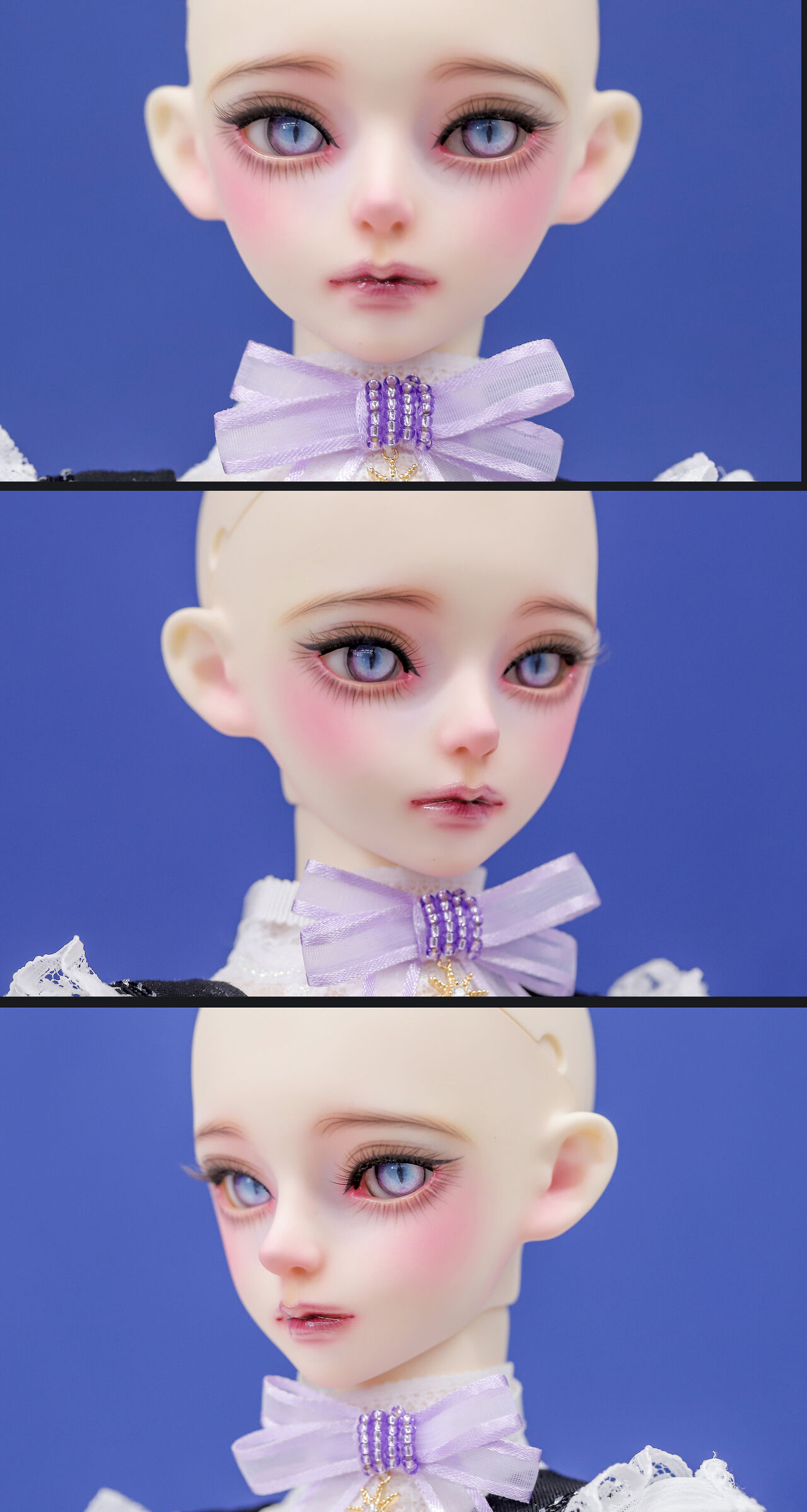 長く繊細なまつ毛の一本一本やほんのりパープルを秘めたシャドウの深みが、魔法使いの飼い猫たる愛らしさと妖しさを見事に表現しています。