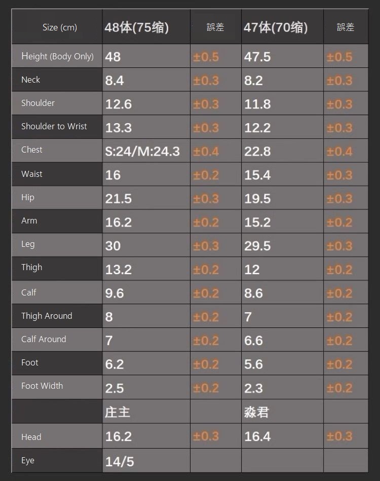 | 47cm Boy | 52.5 | 16.2 | 8.2 | 12.2 | 22.8 | 15.4 | 19.5 | 15.2 | --- | 29.5 | 12 | 5.6 | 2.3 | 6~7 | 14 | |