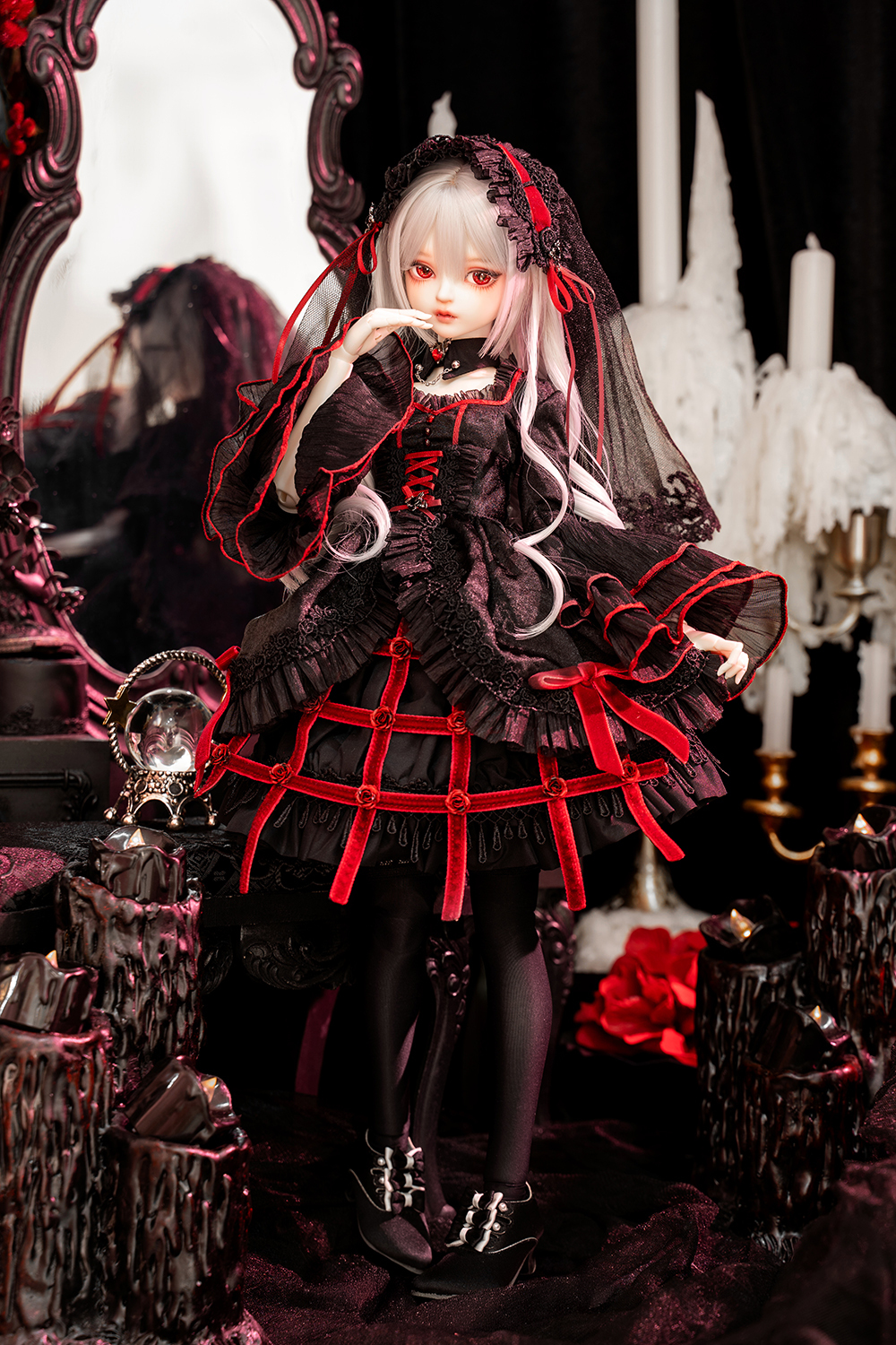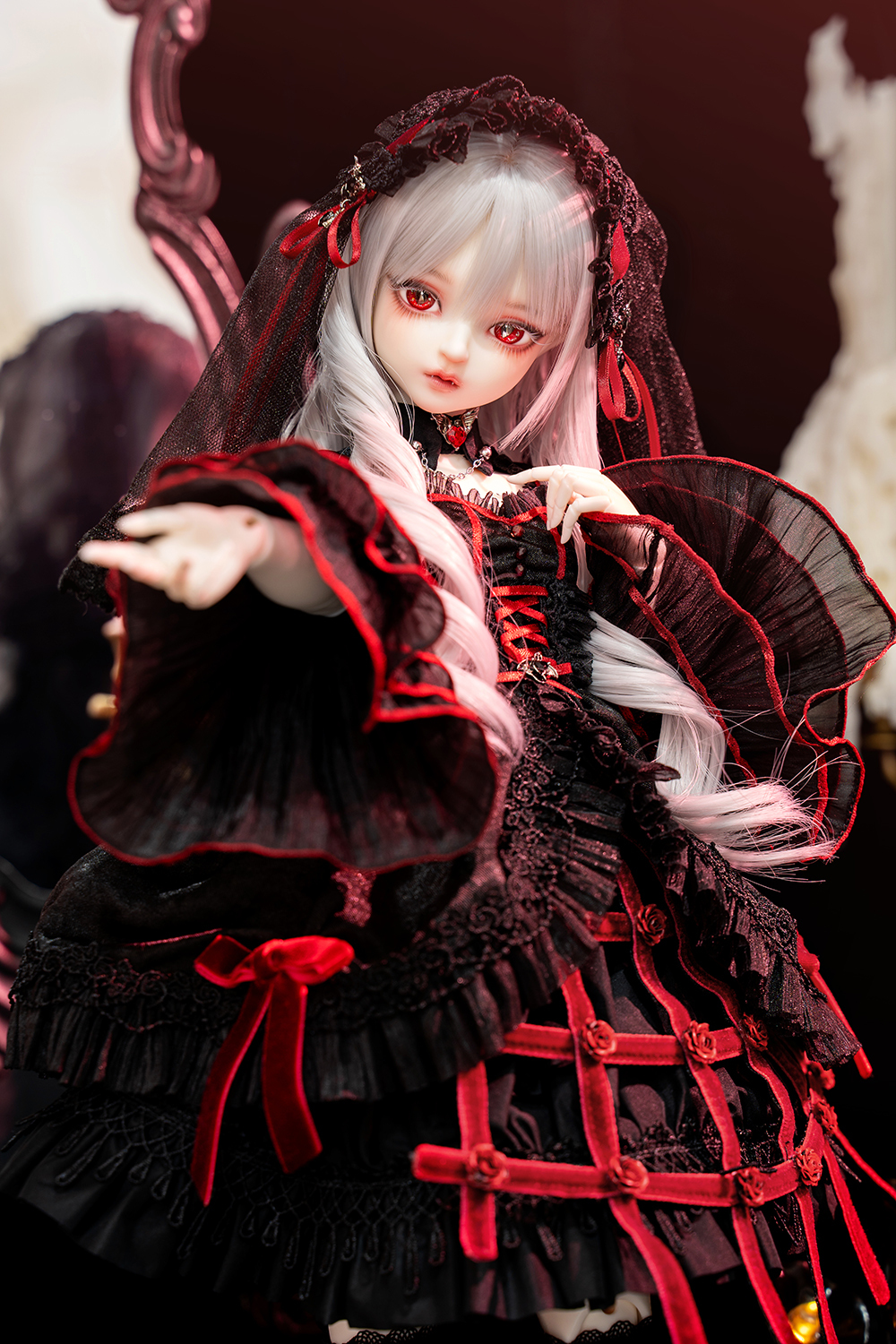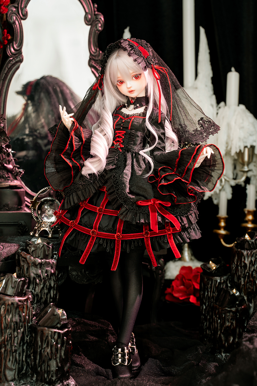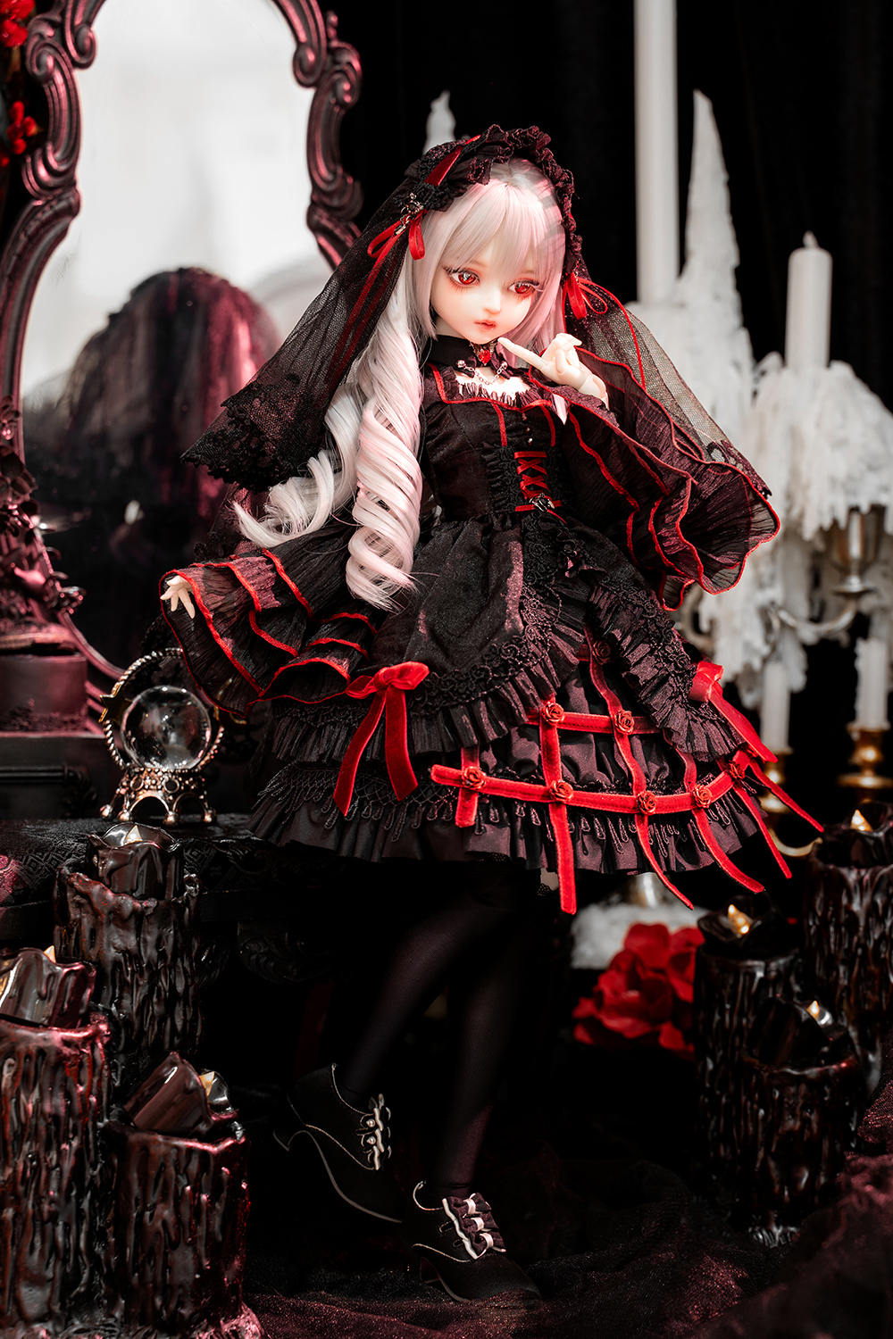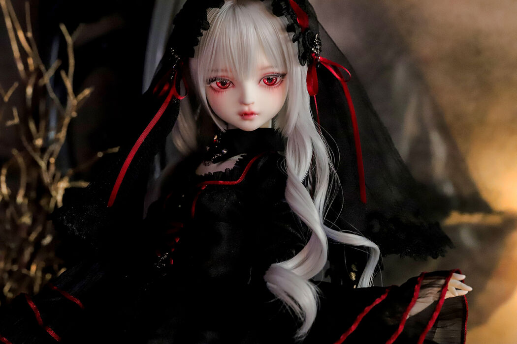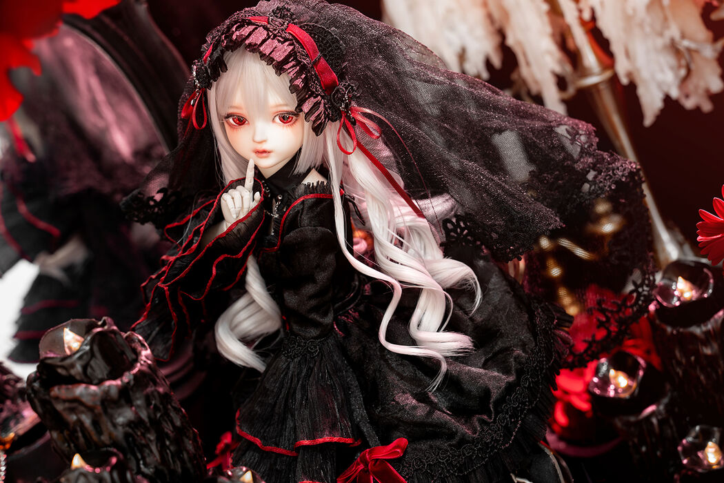 DOLKによって描きおこされた黒×赤のドレスデザインを、Fairytalesがブラッシュアップすることで吸血鬼Deliaのためのドレスセットが仕立てられています。赤いベルベットを使ったクリノリンの一部を組み合わせたスカートや、蝙蝠のようなシルバーパーツが、吸血鬼の世界観を表現。さらに、ヘッドドレスは2重にチュールレースが重ねられており、短い丈のチュールレースは前側に掛けることも出来るので、ミステリアスな雰囲気で顔を隠すような吸血鬼の演出も楽しめます。