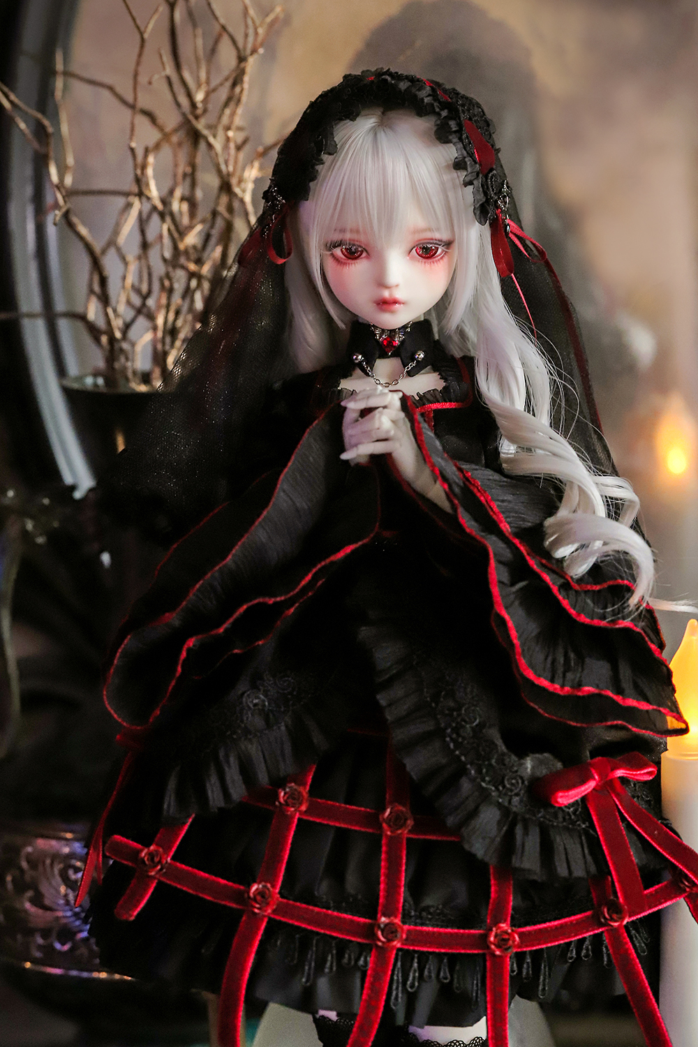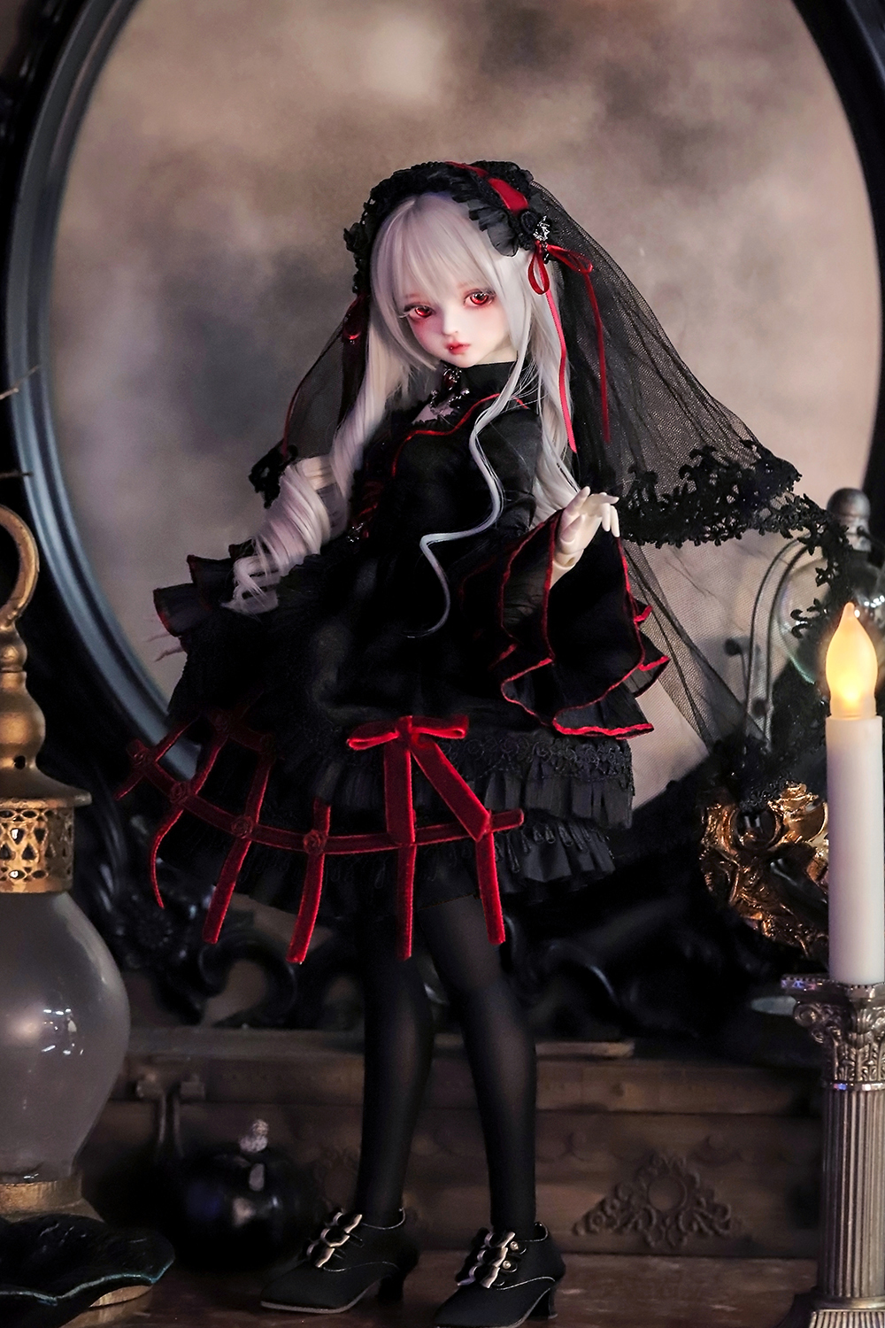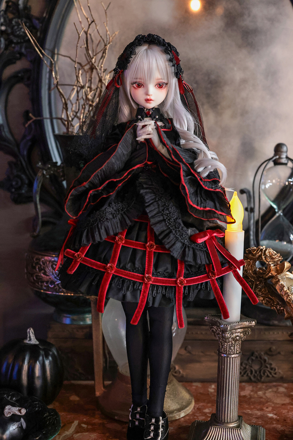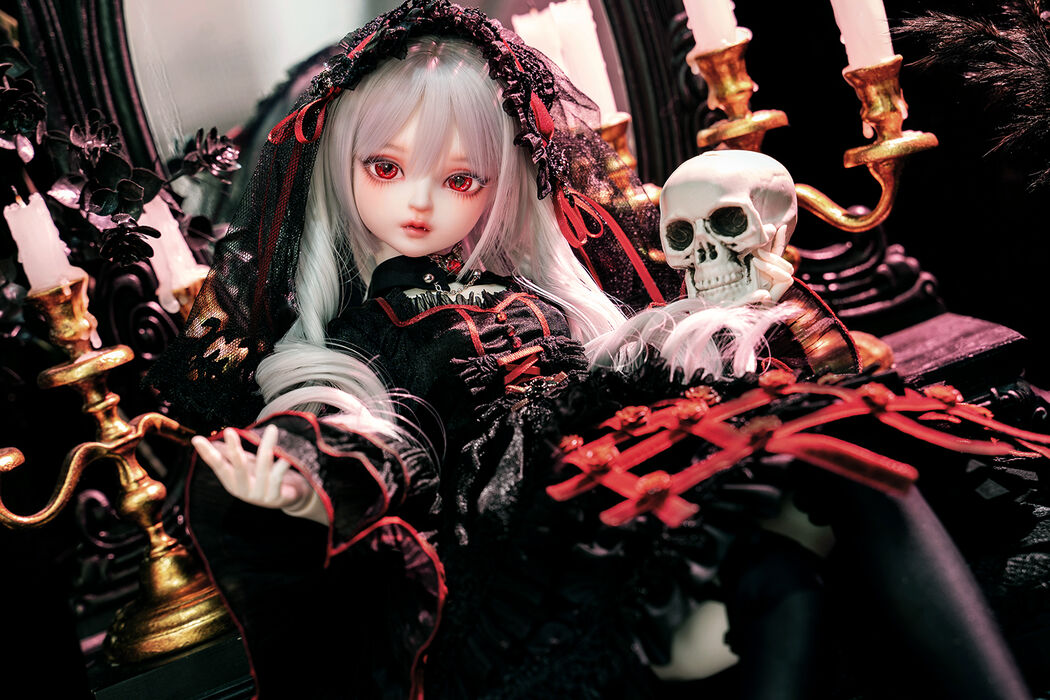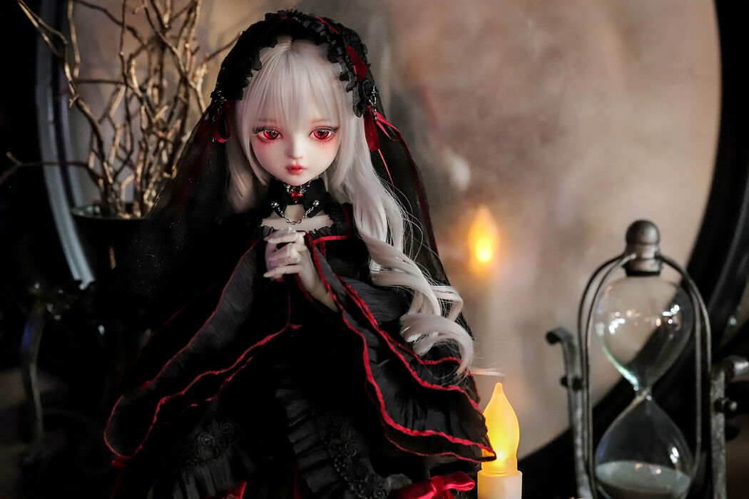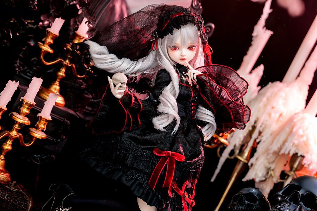 DOLKによって描きおこされた黒×赤のドレスデザインを、Fairytalesがブラッシュアップすることで吸血鬼Deliaのためのドレスセットが仕立てられています。赤いベルベットを使ったクリノリンの一部を組み合わせたスカートや、蝙蝠のようなシルバーパーツが、吸血鬼の世界観を表現。さらに、ヘッドドレスは2重にチュールレースが重ねられており、短い丈のチュールレースは前側に掛けることも出来るので、ミステリアスな雰囲気で顔を隠すような吸血鬼の演出も楽しめます。