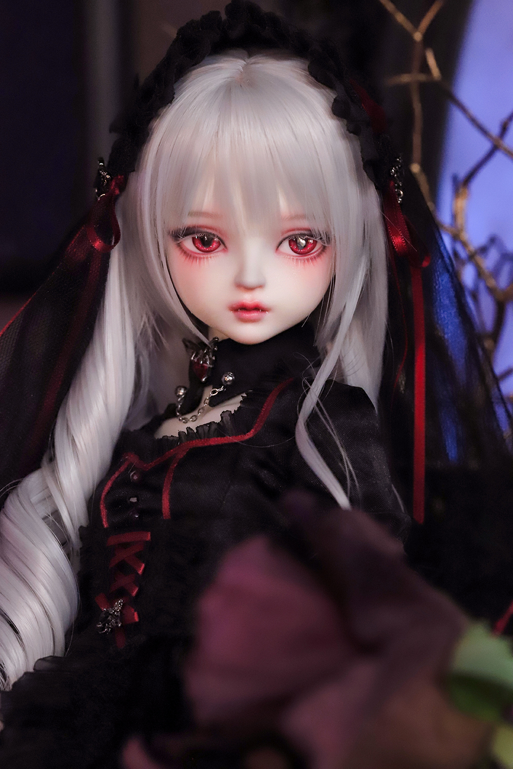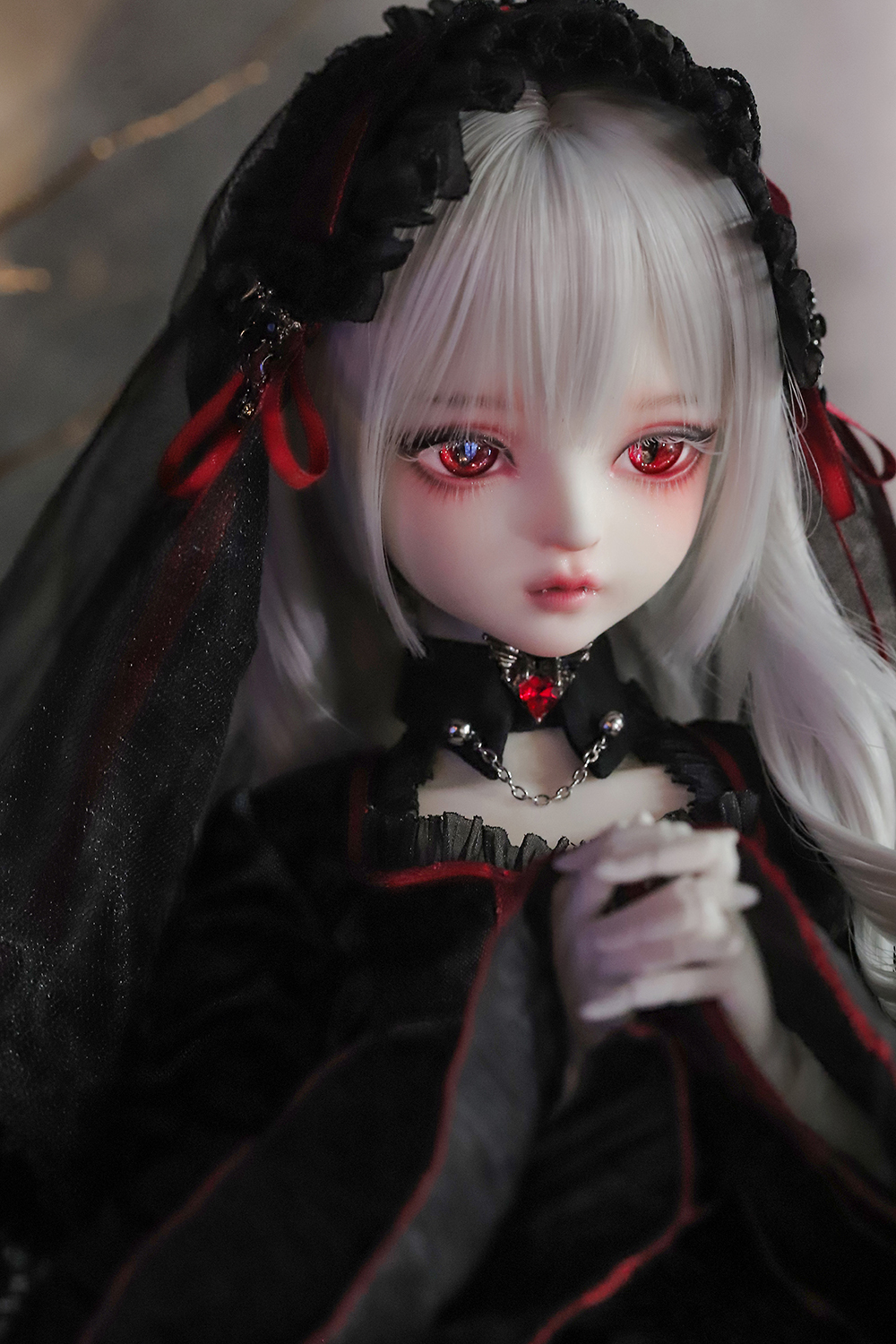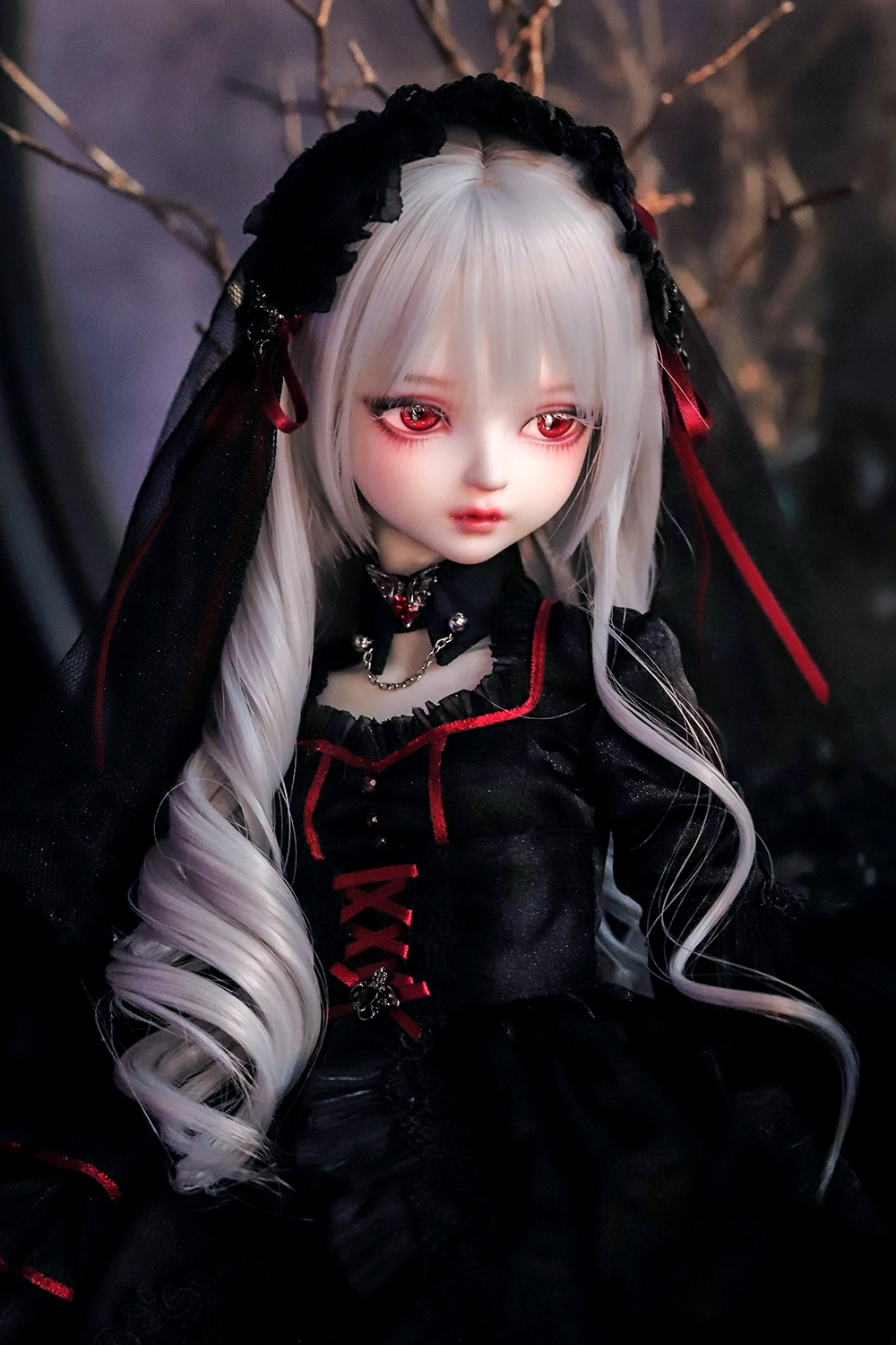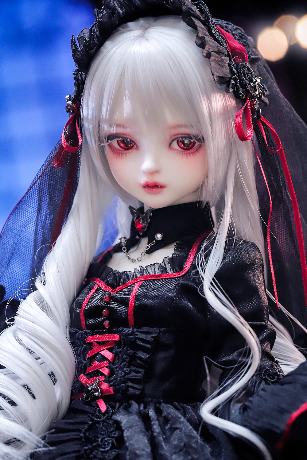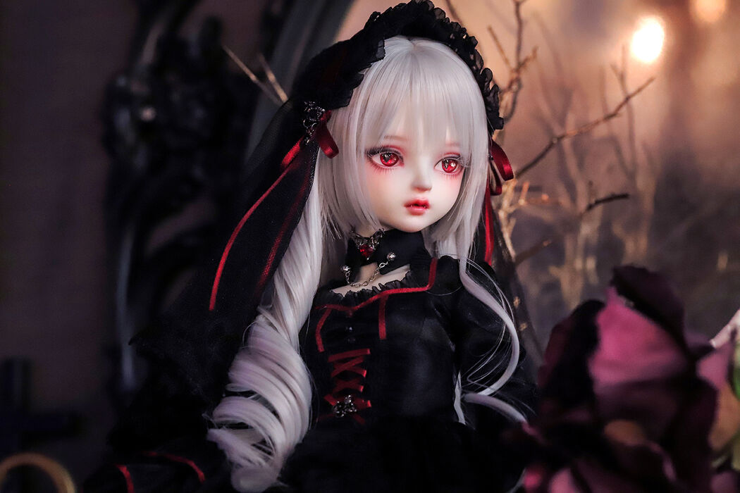 DOLKによって描きおこされた黒×赤のドレスデザインを、Fairytalesがブラッシュアップすることで吸血鬼Deliaのためのドレスセットが仕立てられています。赤いベルベットを使ったクリノリンの一部を組み合わせたスカートや、蝙蝠のようなシルバーパーツが、吸血鬼の世界観を表現。さらに、ヘッドドレスは2重にチュールレースが重ねられており、短い丈のチュールレースは前側に掛けることも出来るので、ミステリアスな雰囲気で顔を隠すような吸血鬼の演出も楽しめます。