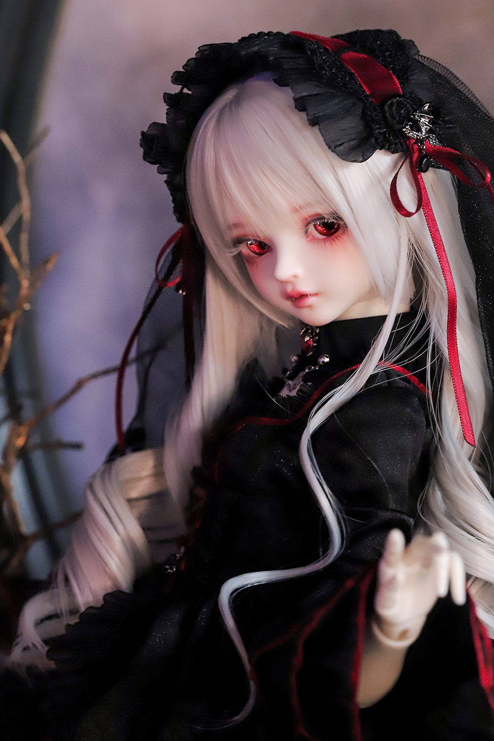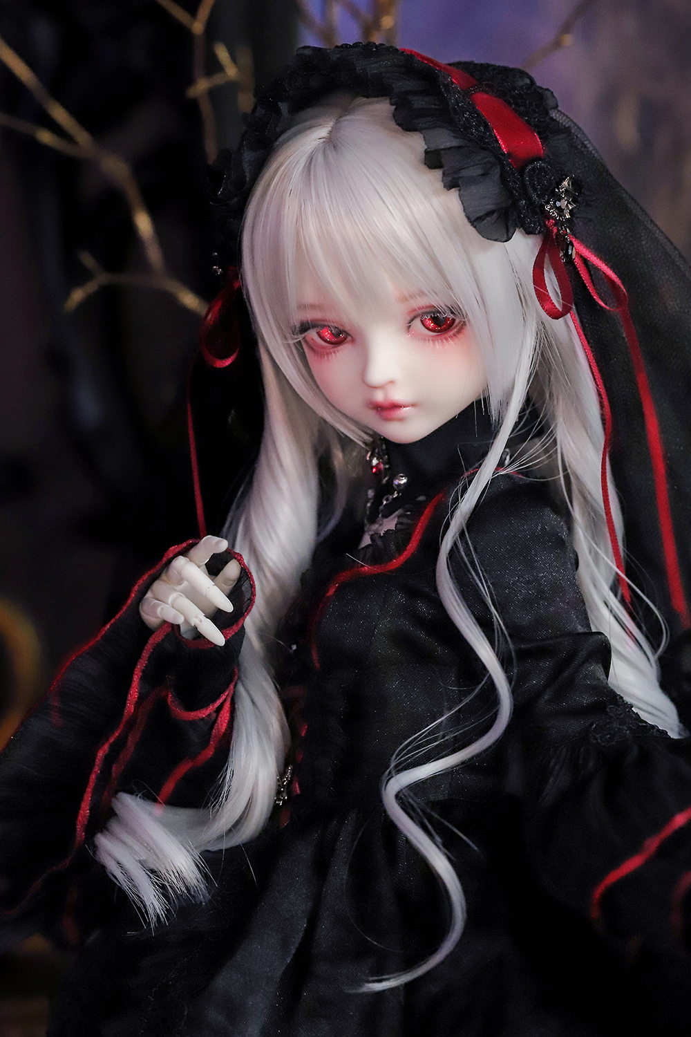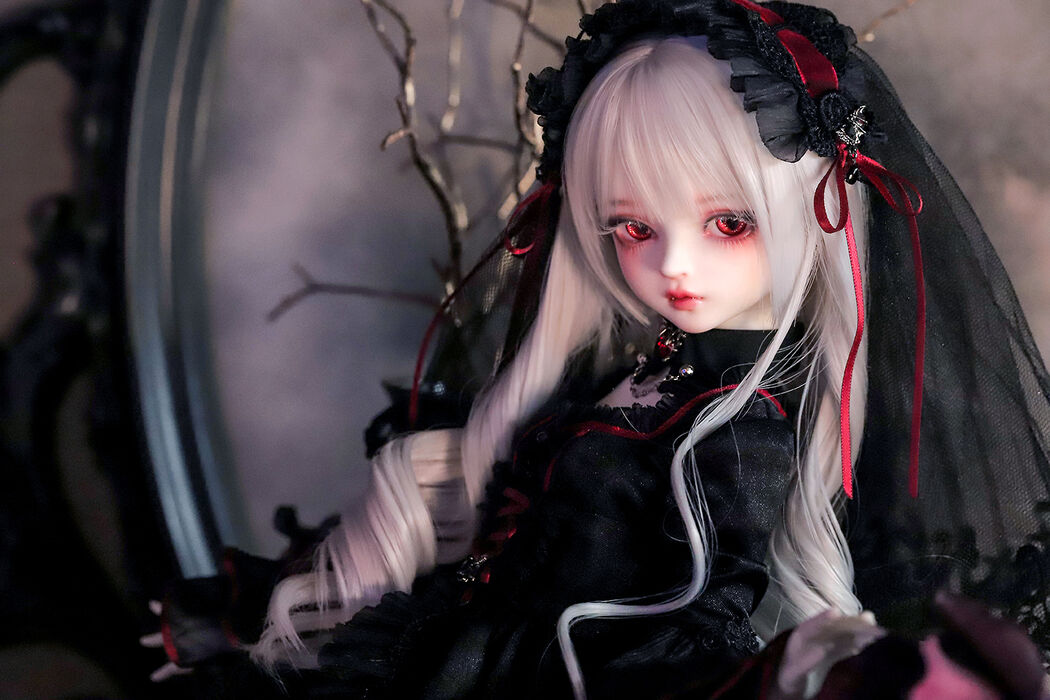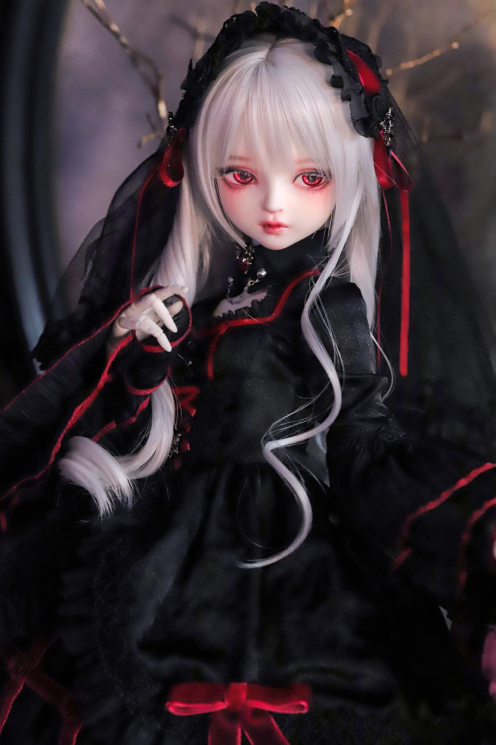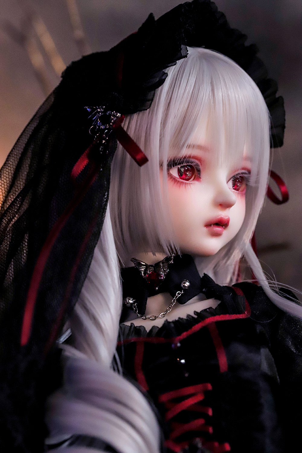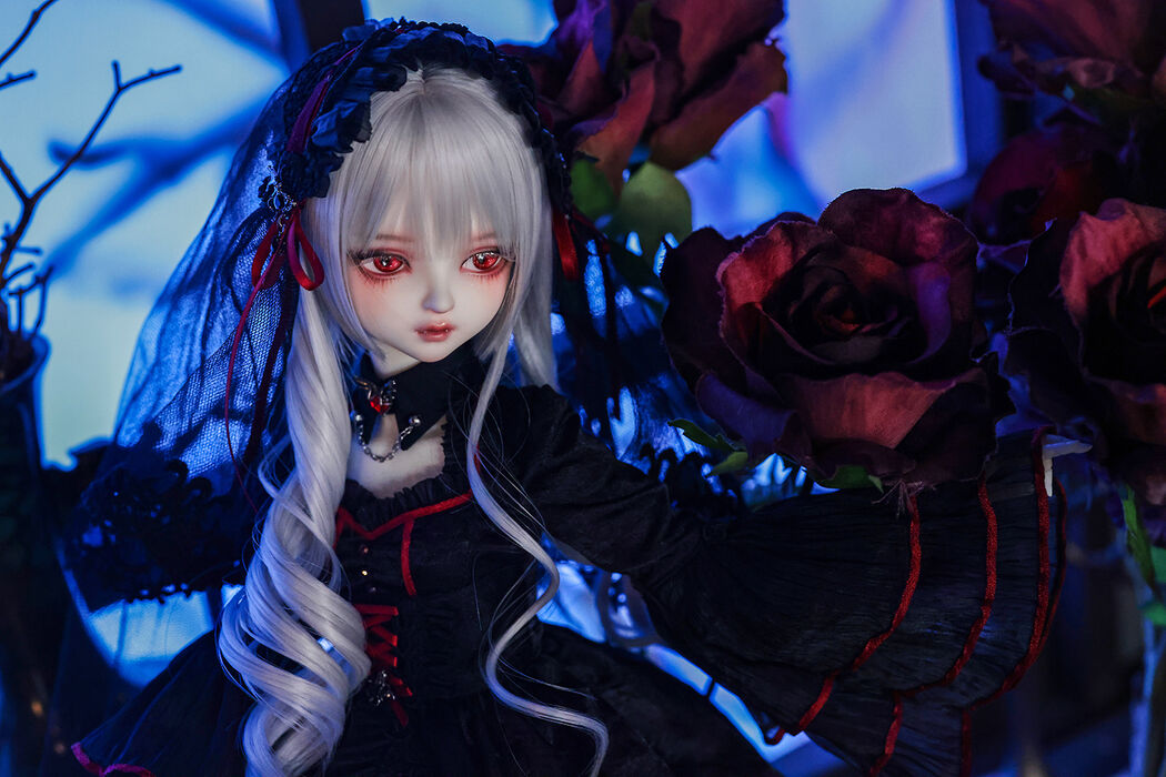 DOLKによって描きおこされた黒×赤のドレスデザインを、Fairytalesがブラッシュアップすることで吸血鬼Deliaのためのドレスセットが仕立てられています。赤いベルベットを使ったクリノリンの一部を組み合わせたスカートや、蝙蝠のようなシルバーパーツが、吸血鬼の世界観を表現。さらに、ヘッドドレスは2重にチュールレースが重ねられており、短い丈のチュールレースは前側に掛けることも出来るので、ミステリアスな雰囲気で顔を隠すような吸血鬼の演出も楽しめます。