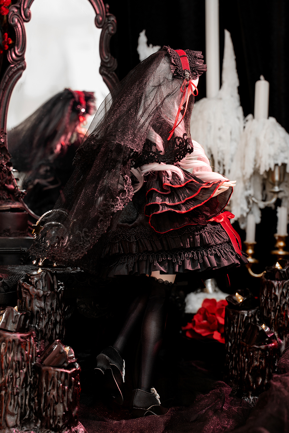 黒×紅のコントラストが美しい吸血鬼のドレスセットは、吸血鬼の頽廃的な世界観をあらわすベルベット調のクリノリンを部分的に取り入れたスカートや、白肌をより白く際立たせる漆黒の異素材を重ね、高貴な少女の佇まいを際立たせる上質な仕立てとなりました。