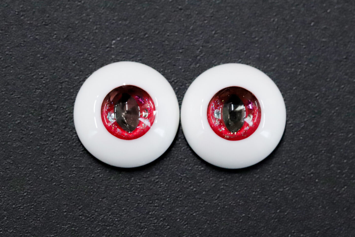 吸血鬼Deliaのコラボレーションのために、マーキスカットの瞳孔パーツを探すところから始まった限定アイ制作。そのマーキスカットの瞳孔に沿って、深い赤から炎のように輝く明るい赤へとグラデーションで変化する虹彩は、お好みで向きを変えると全く違う表情を楽しめる仕上がりとなっています。