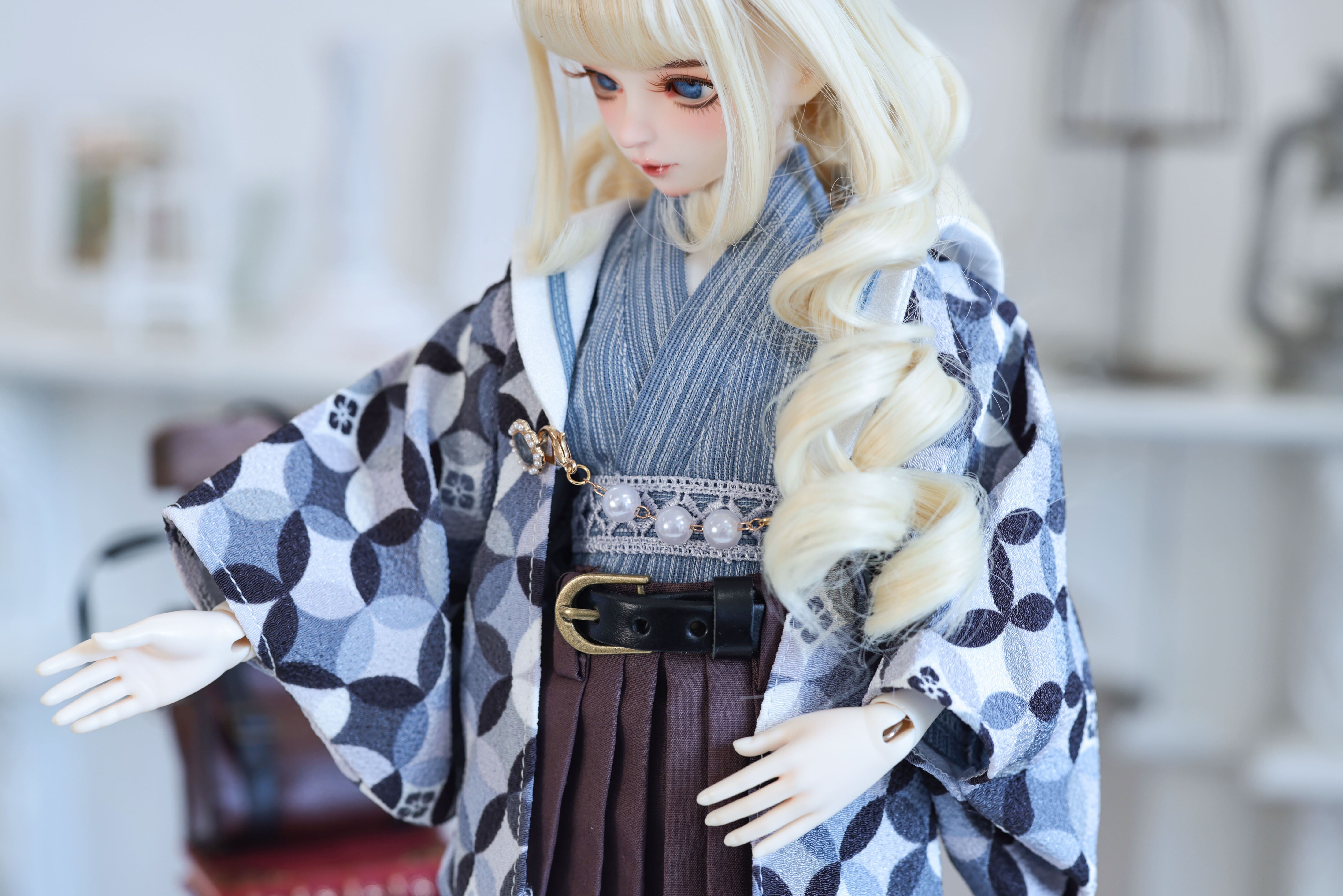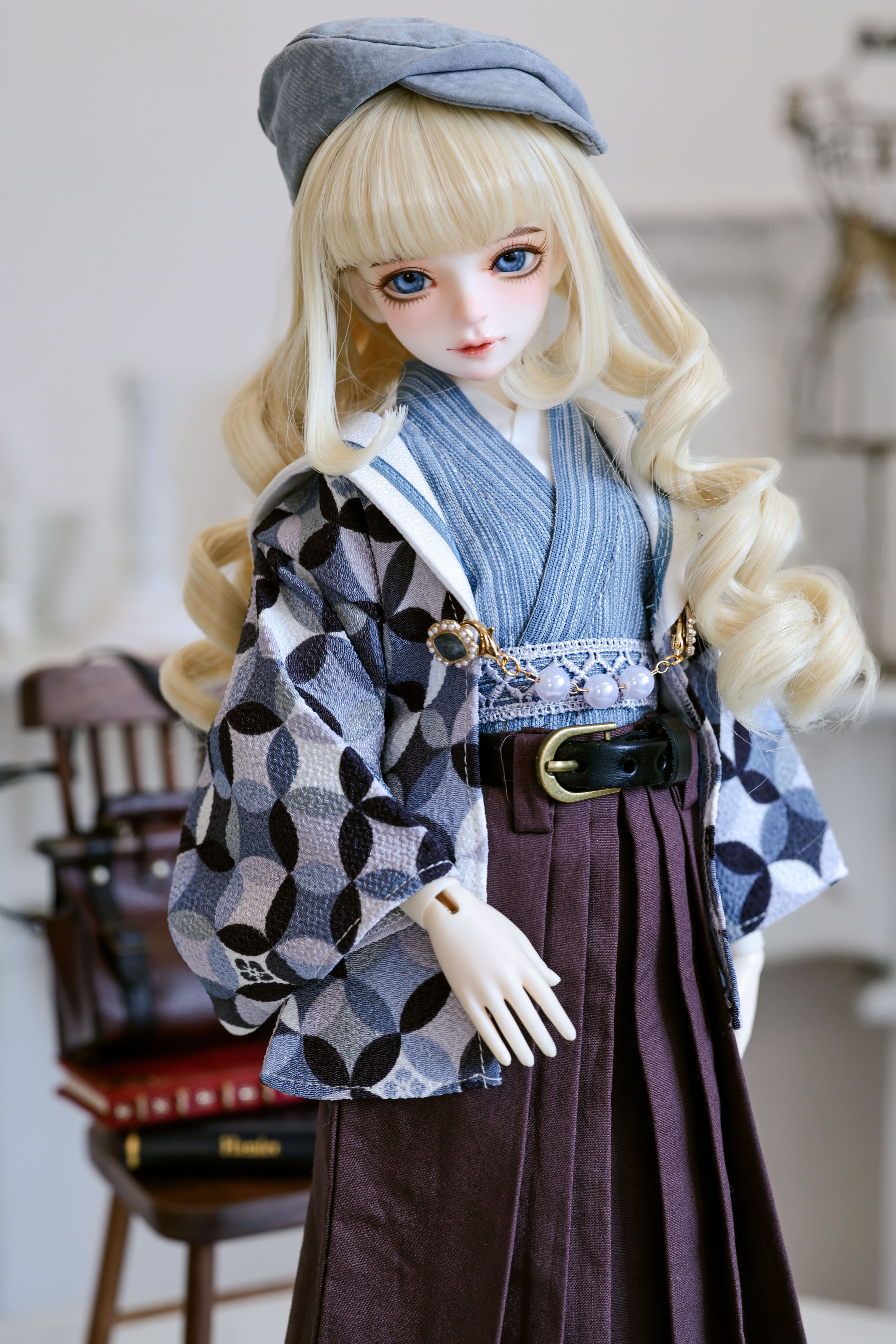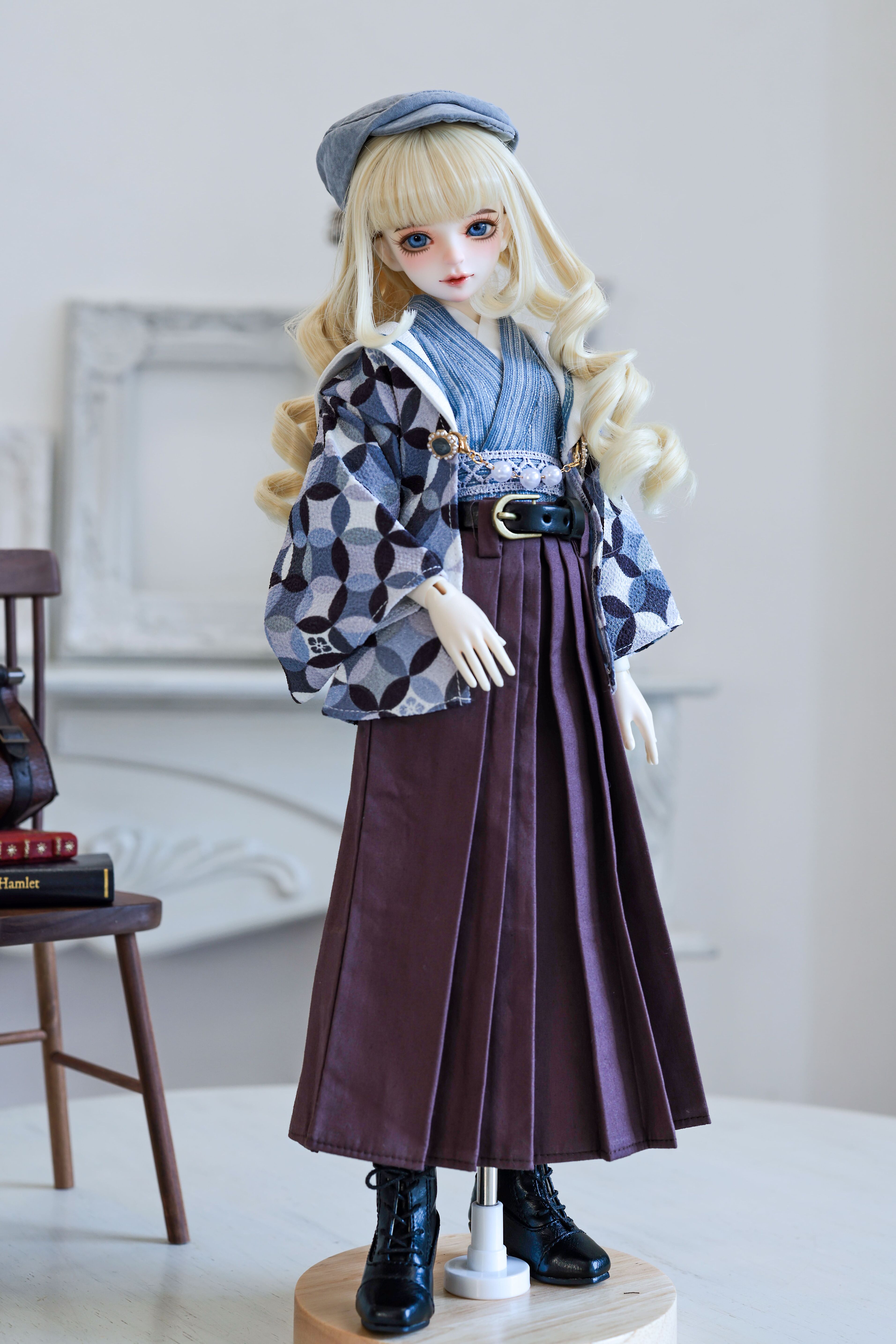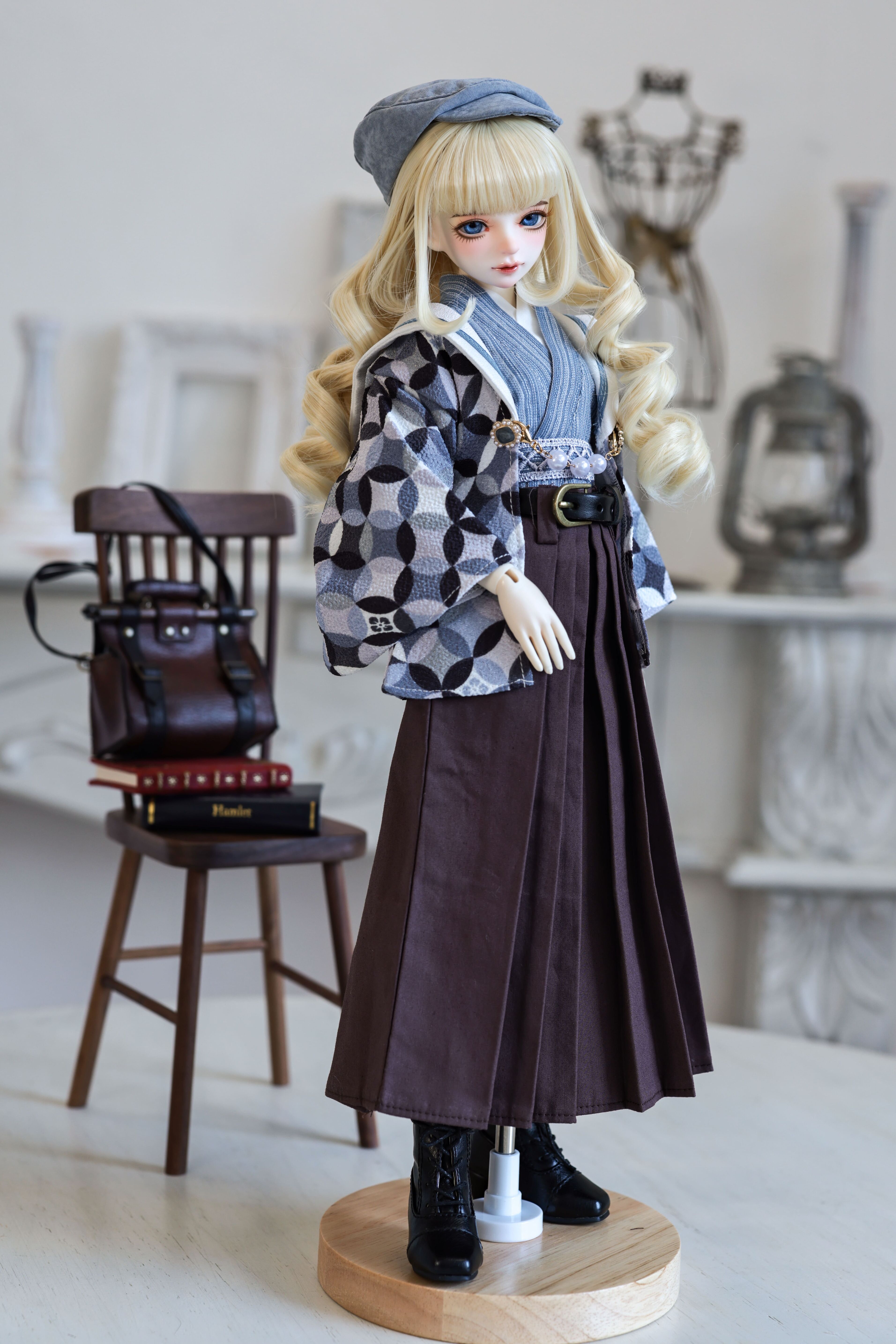柔らかなハンチングは街歩きにも似合う落ち着き。羽織は前開きで重ねが整い、胸元の飾りは着脱可能。深いタックの袴は脚線をすっきり見せ、ポーズも崩れにくい設計です。