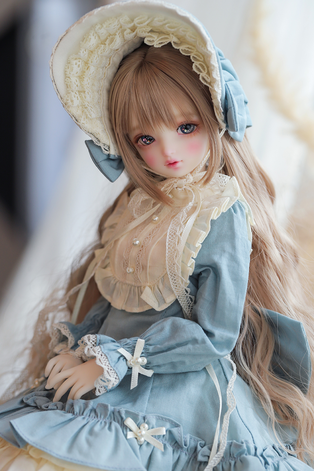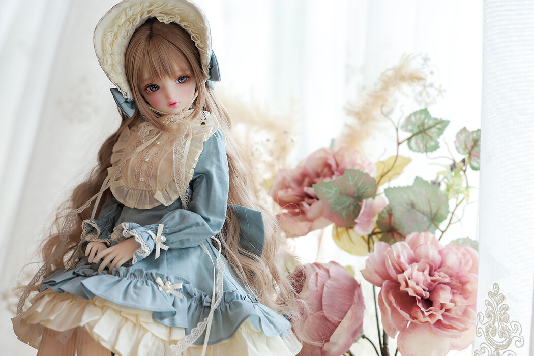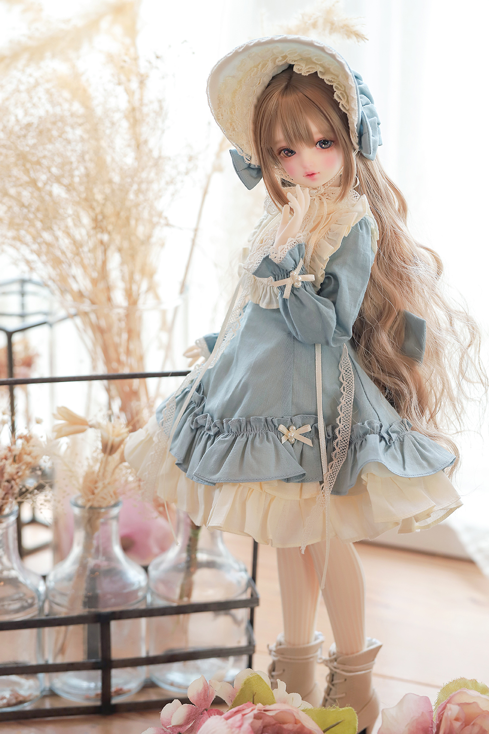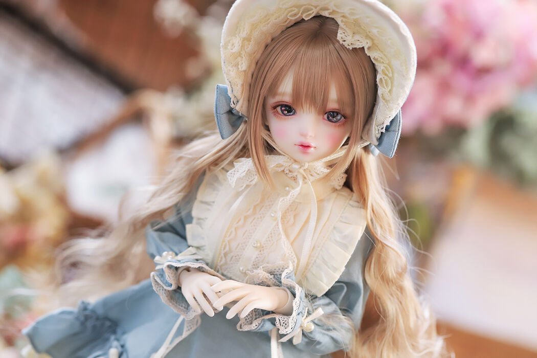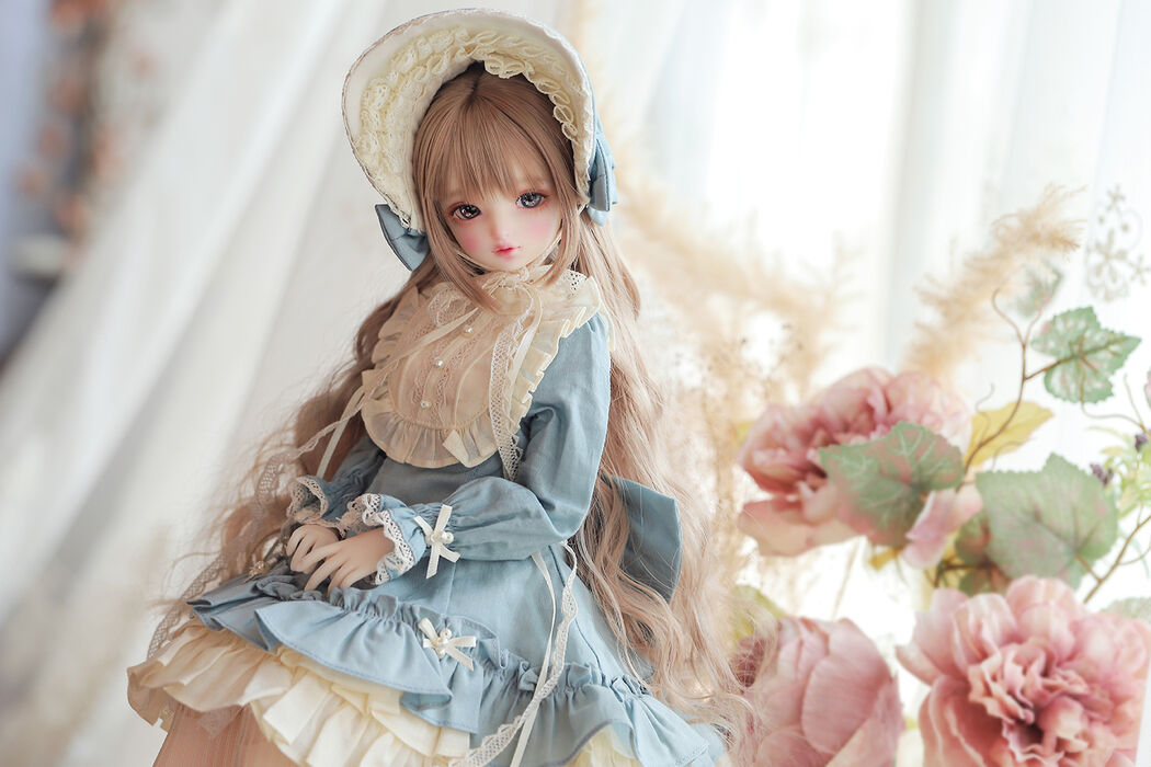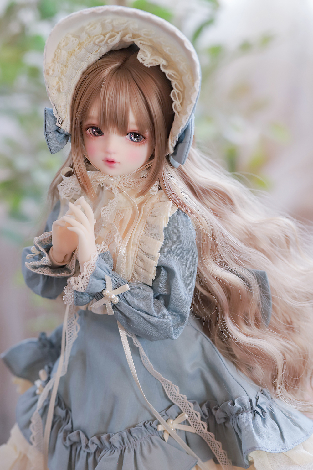 輝く表情に命を灯すドールアイは大人気SWAN DOLLによるコラボ限定アイ。さらに、甘い蜜のようなこっくりとしたミルクティカラーの柔らかなロングウィッグ、Nine9 Styleが特別に提供するアンティークブルーのドレスセットが、少女Fiaの背景にある物語をイメージさせる豪華フルセットを誕生させています。