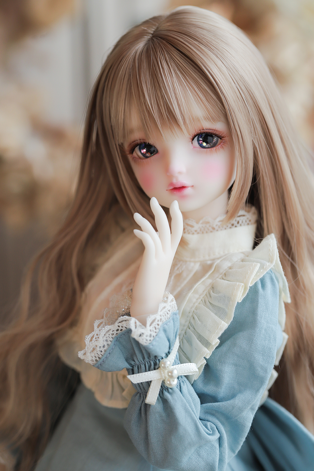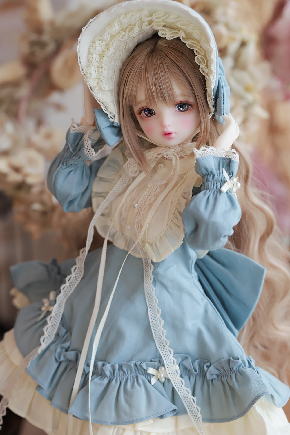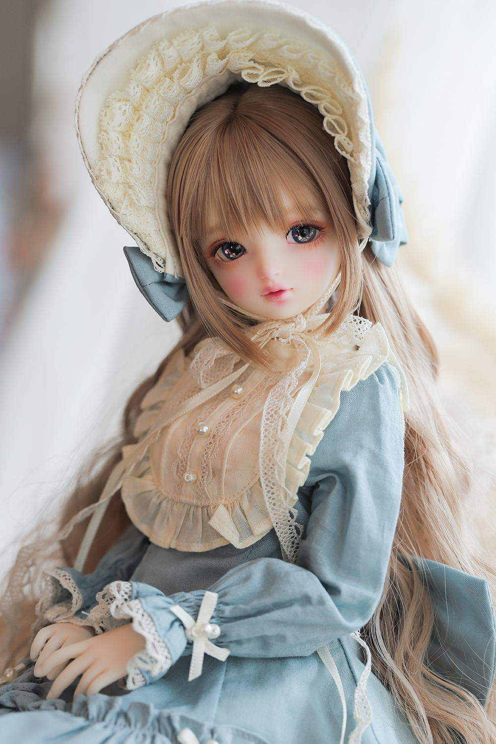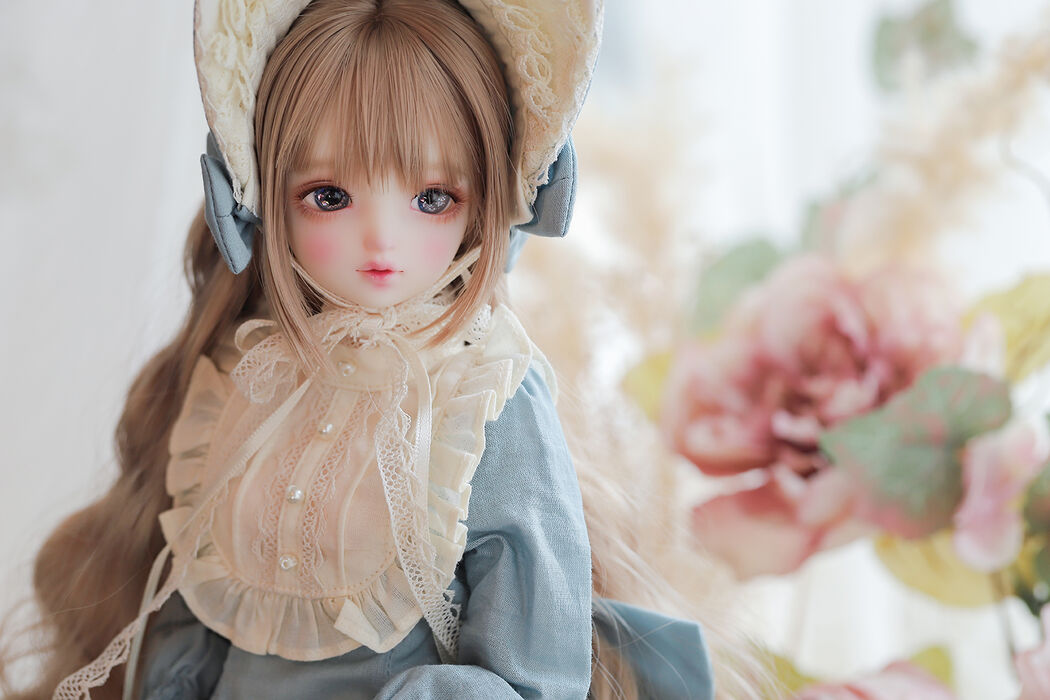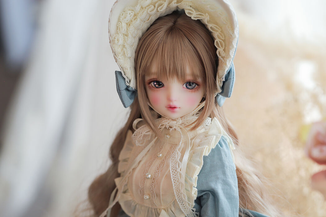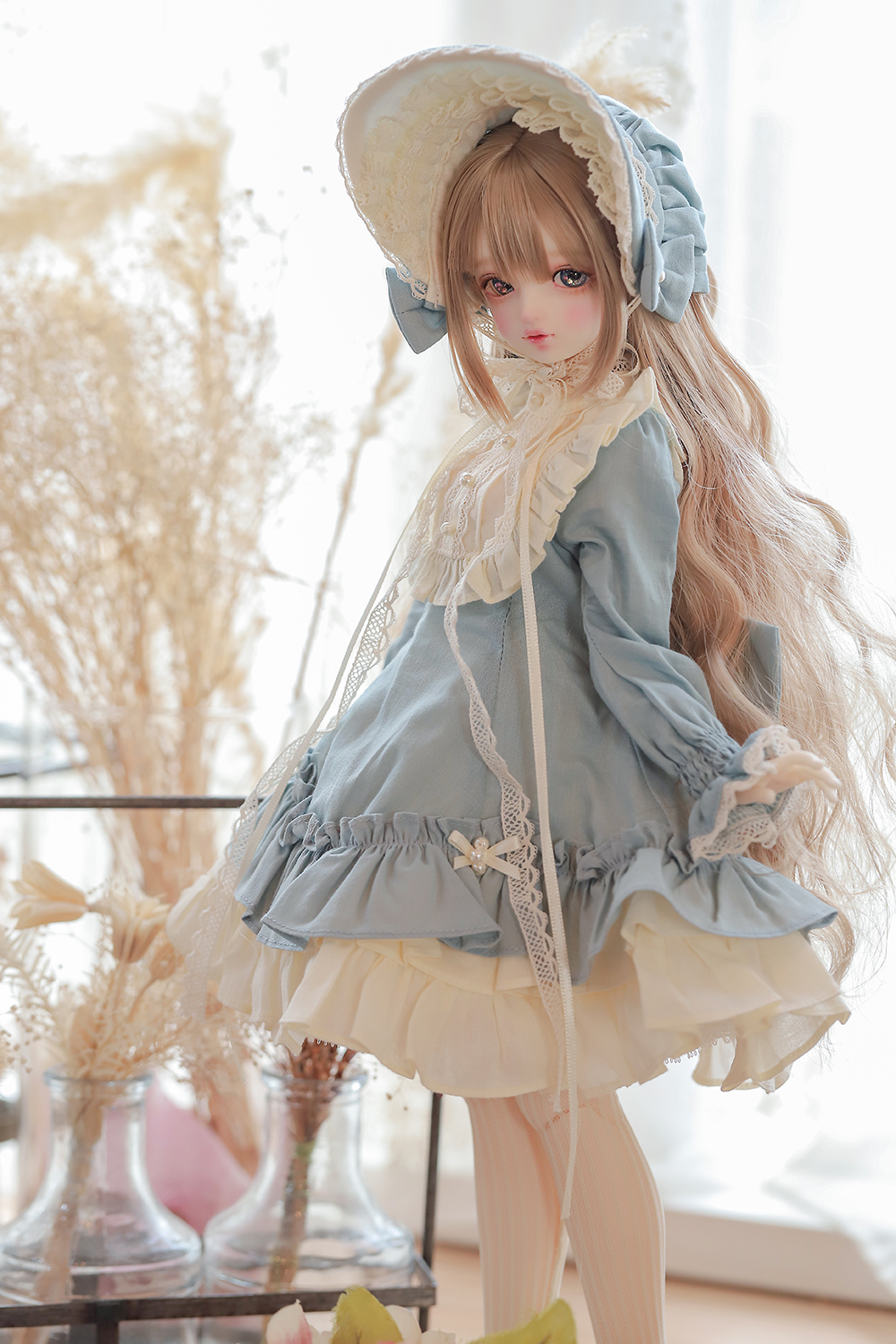 輝く表情に命を灯すドールアイは大人気SWAN DOLLによるコラボ限定アイ。さらに、甘い蜜のようなこっくりとしたミルクティカラーの柔らかなロングウィッグ、Nine9 Styleが特別に提供するアンティークブルーのドレスセットが、少女Fiaの背景にある物語をイメージさせる豪華フルセットを誕生させています。
