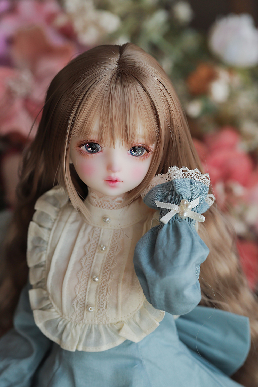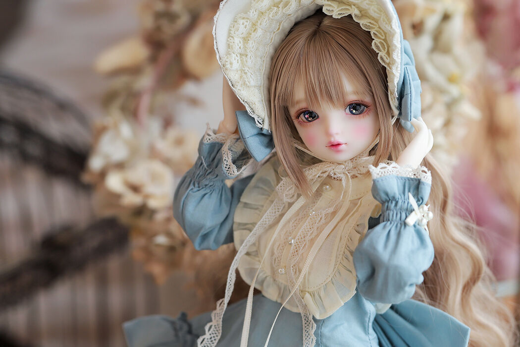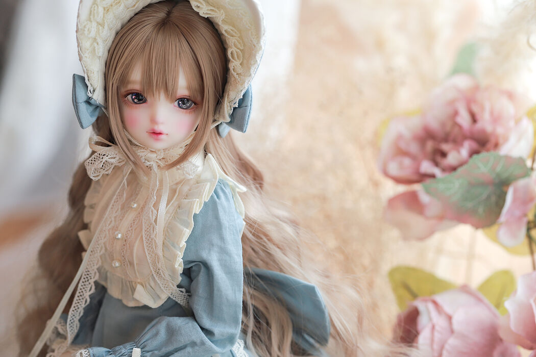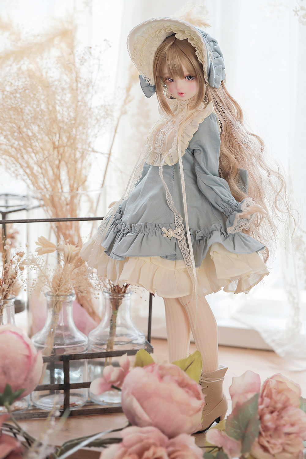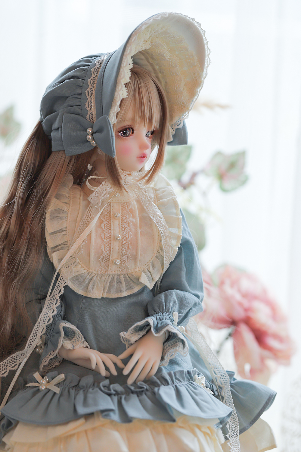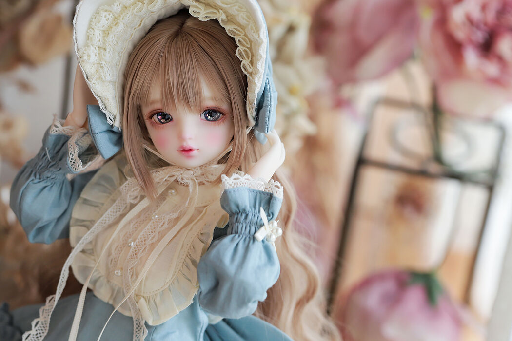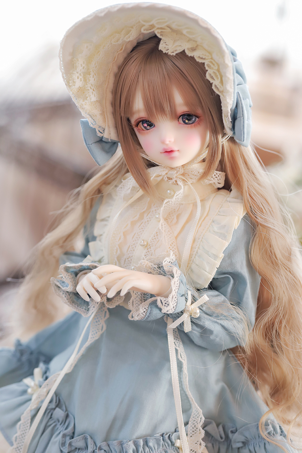 輝く表情に命を灯すドールアイは大人気SWAN DOLLによるコラボ限定アイ。さらに、甘い蜜のようなこっくりとしたミルクティカラーの柔らかなロングウィッグ、Nine9 Styleが特別に提供するアンティークブルーのドレスセットが、少女Fiaの背景にある物語をイメージさせる豪華フルセットを誕生させています。