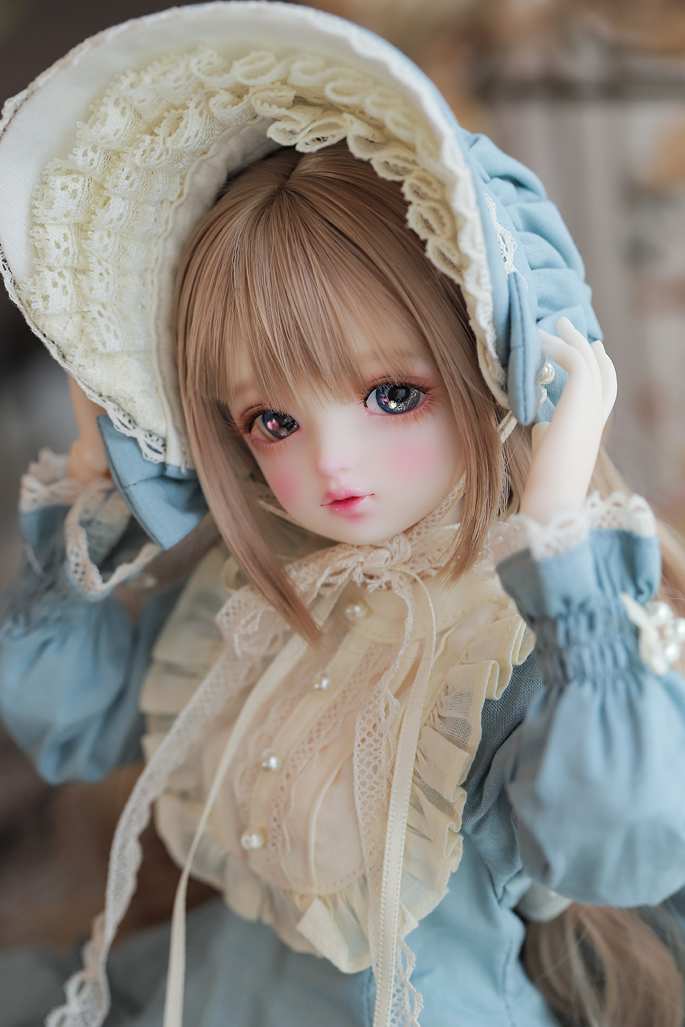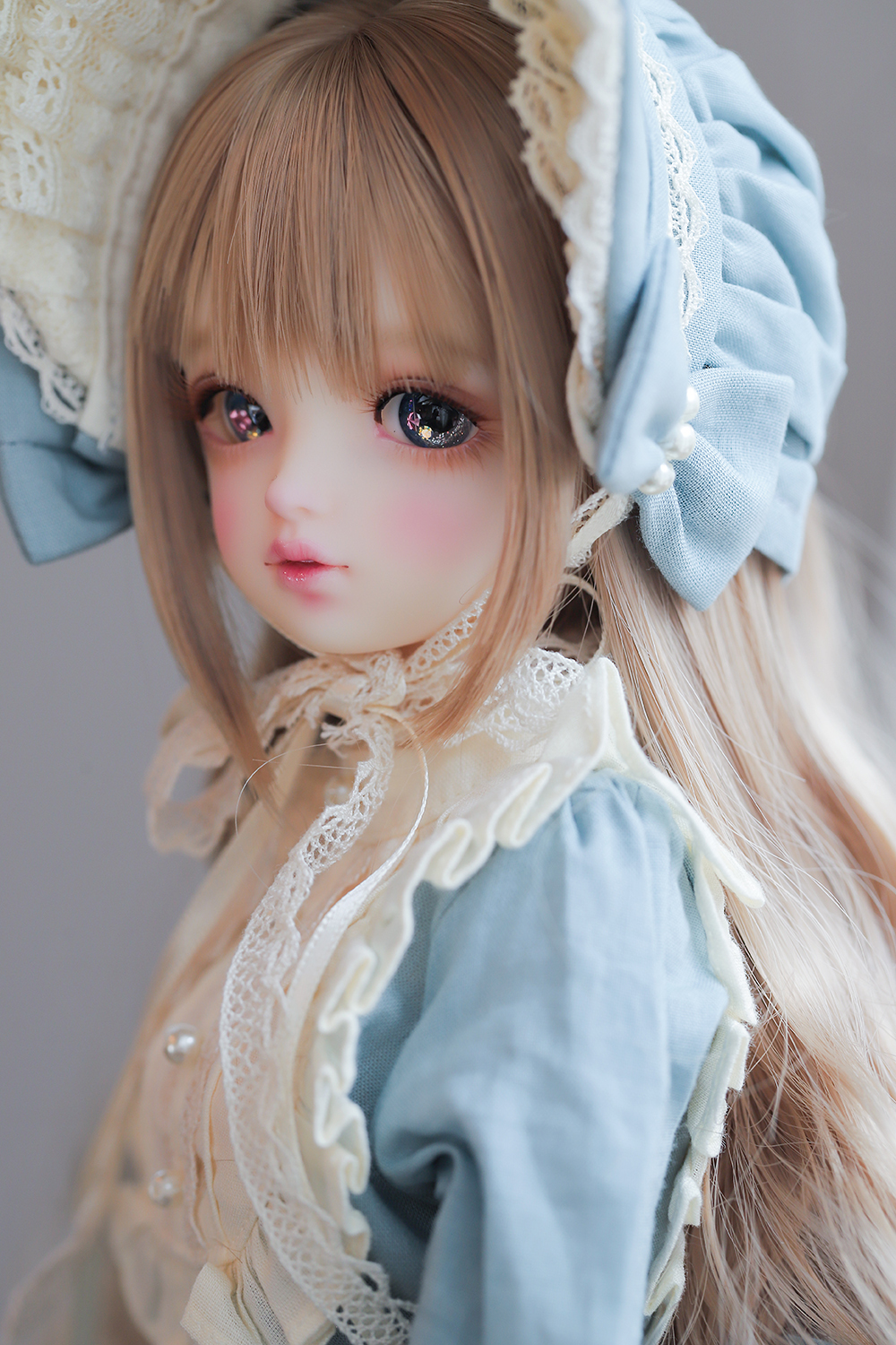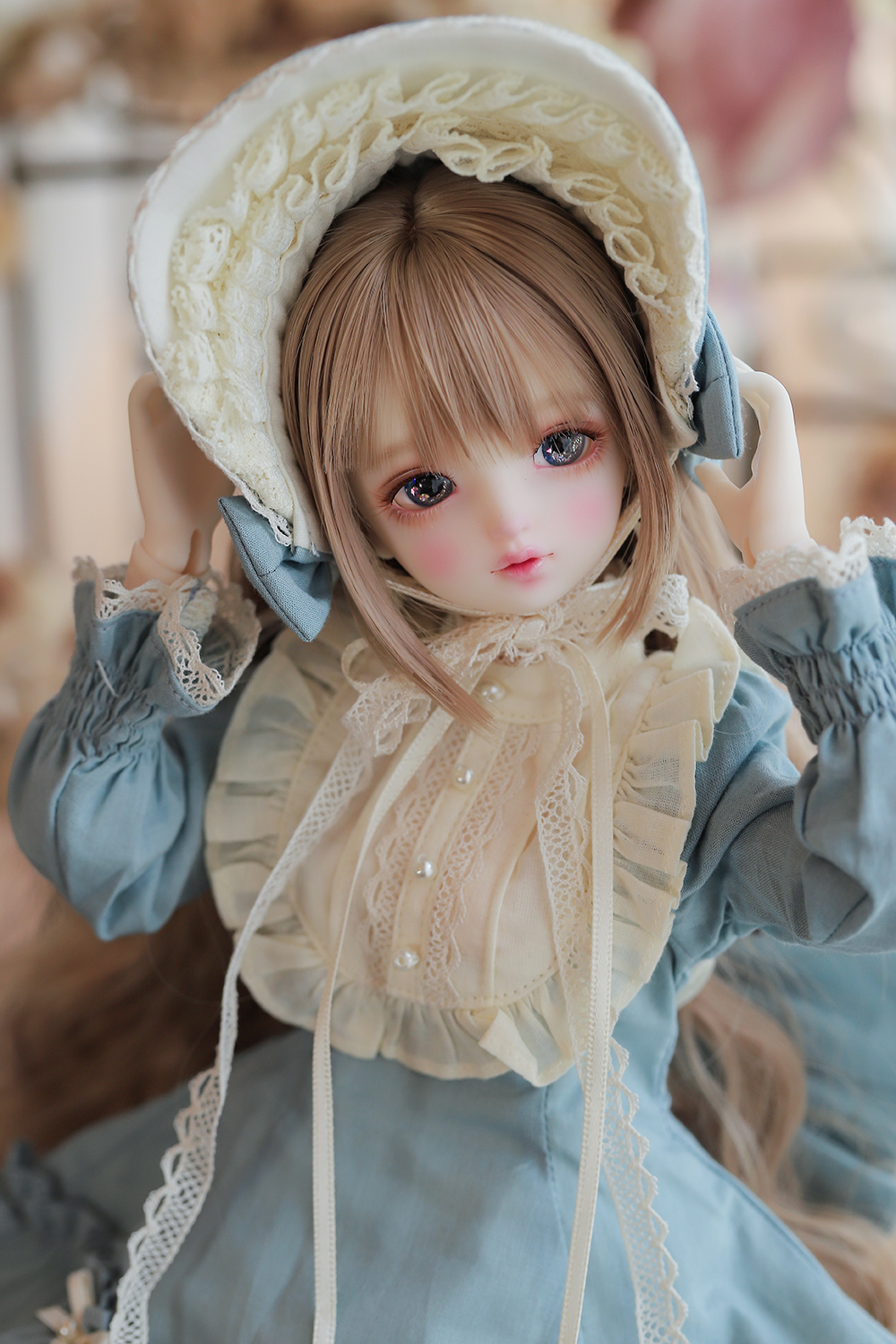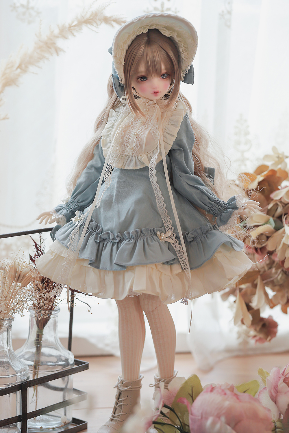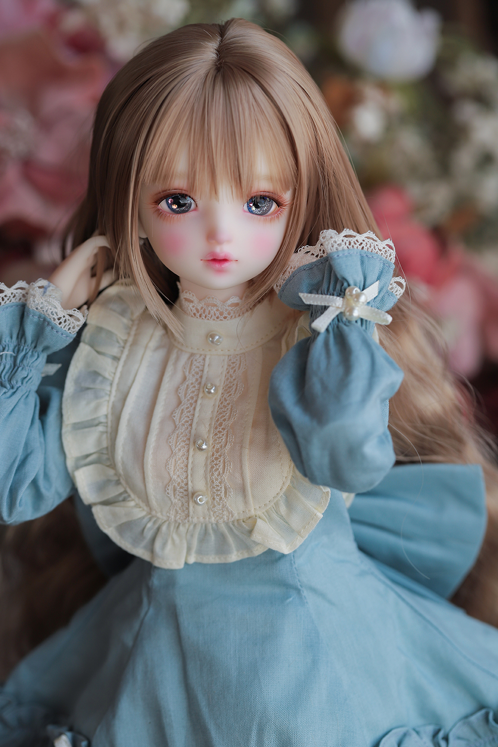 輝く表情に命を灯すドールアイは大人気SWAN DOLLによるコラボ限定アイ。さらに、甘い蜜のようなこっくりとしたミルクティカラーの柔らかなロングウィッグ、Nine9 Styleが特別に提供するアンティークブルーのドレスセットが、少女Fiaの背景にある物語をイメージさせる豪華フルセットを誕生させています。