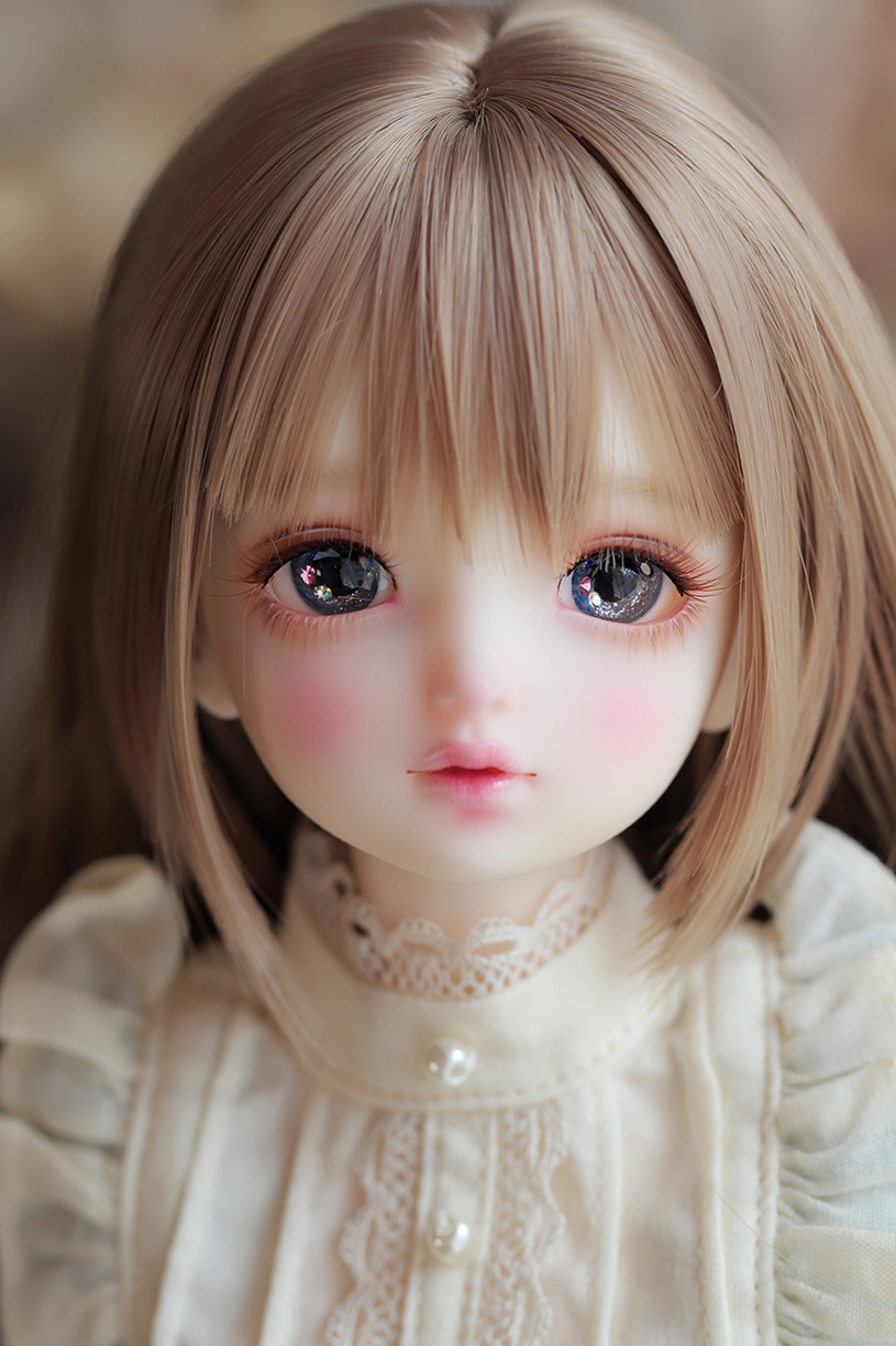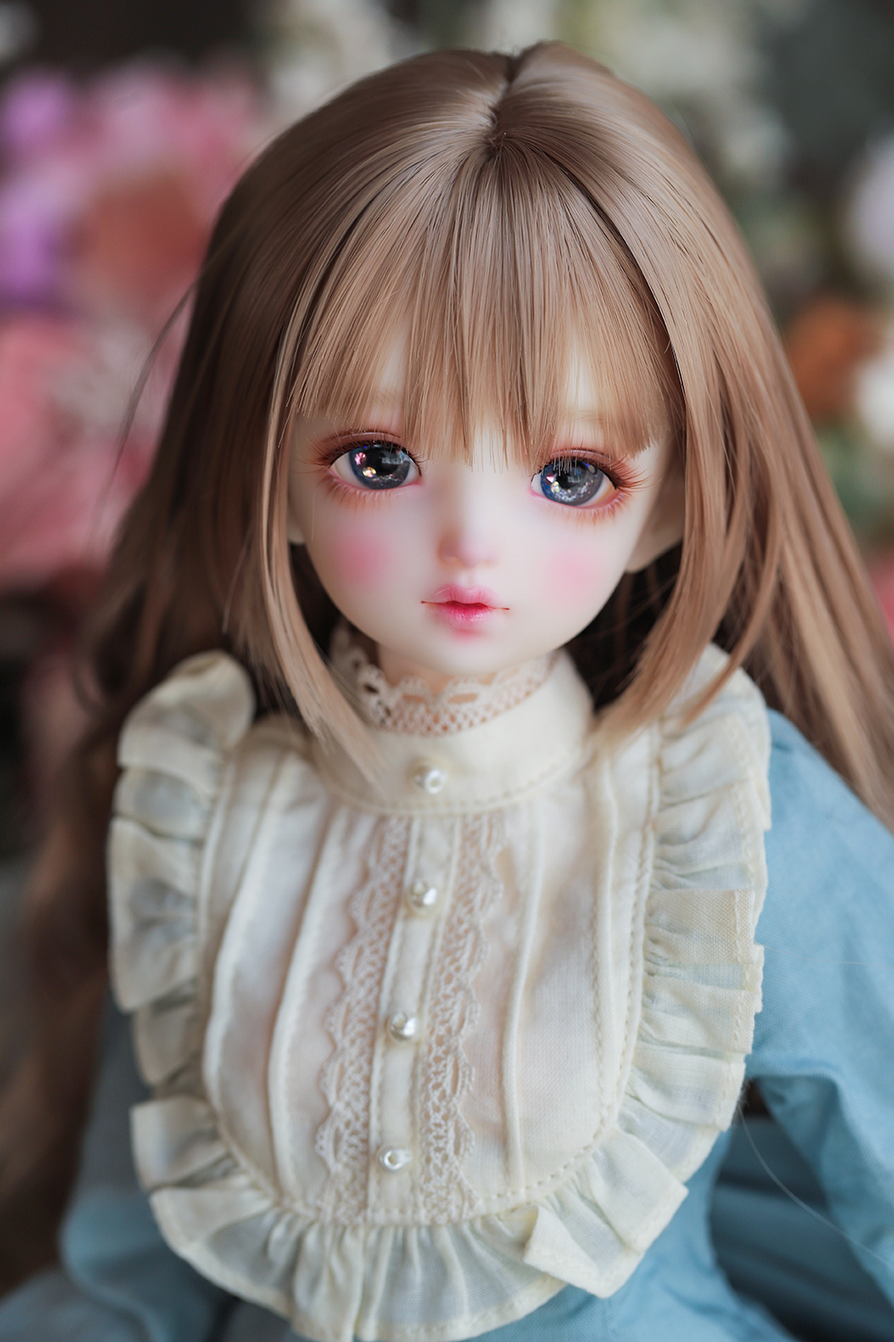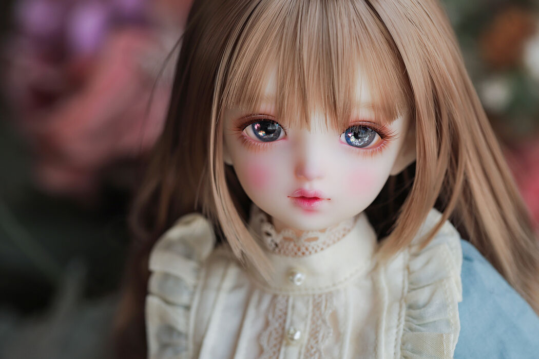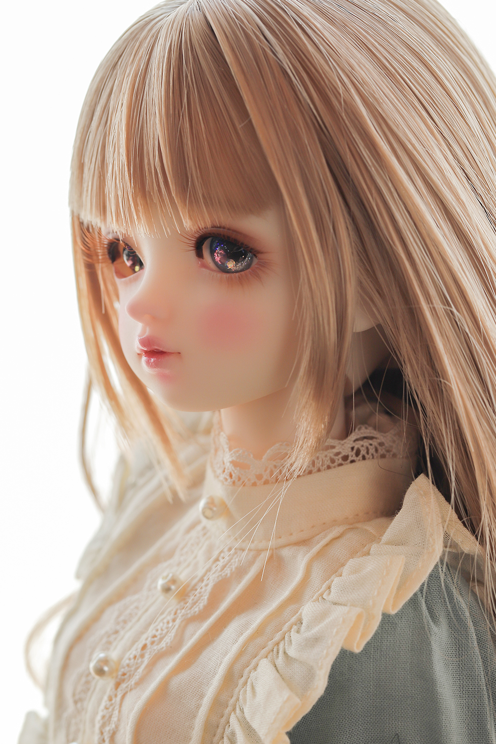 愛くるしいたれ目造形が特徴のFiaを彩るのは、甘やかで上品な作風をもつ Atelier sarasoo です。アザレアのような明るいピンク色のチークや、桃色のリップ、ミルクチョコレートのような優しいブラウンのアイラインが、Fiaの整った造形を、一輪の花のような明るい表情に仕上げています。光を浴びてきらきらと輝く表情は、秘密の花園を手入れする少女の姿を彷彿とさせます。