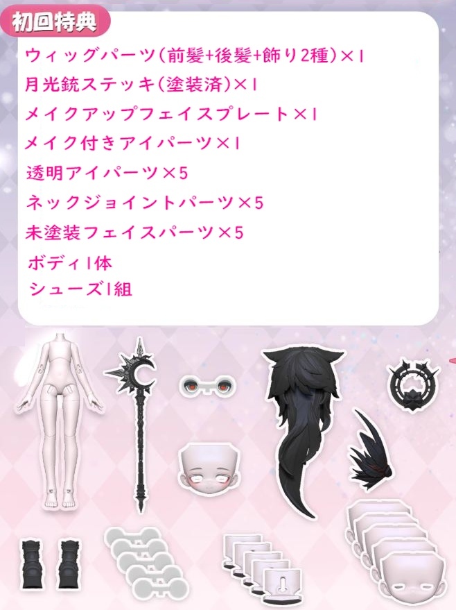 【初回特典】透明アイパーツ×5、ネックジョイントパーツ×5、未塗装アイホールありフェイスパーツ×5、月光天使ボディ×1 、メイクアップフェイスプレート×1、メイク付きアイパーツ×1、月光銃ステッキ(塗装済)×1、ウィッグパーツ(前髪+後髪+飾り2種)×1、シューズ×1組が追加で付属します。