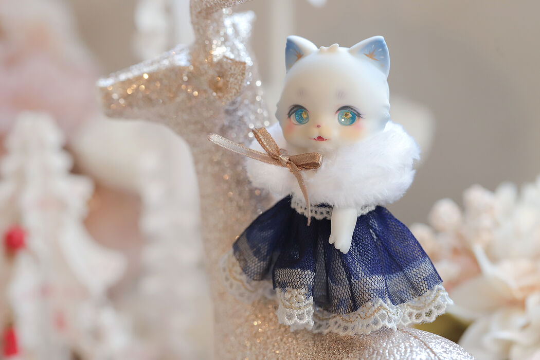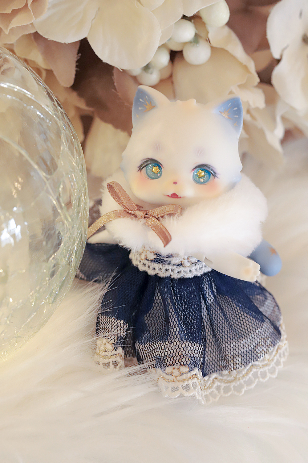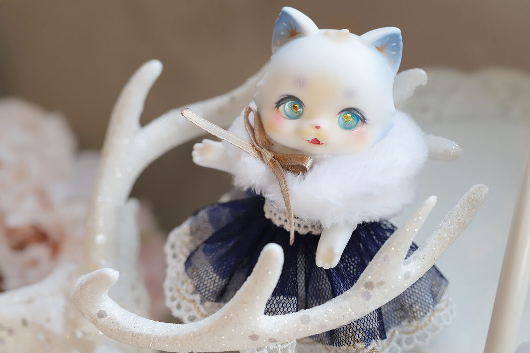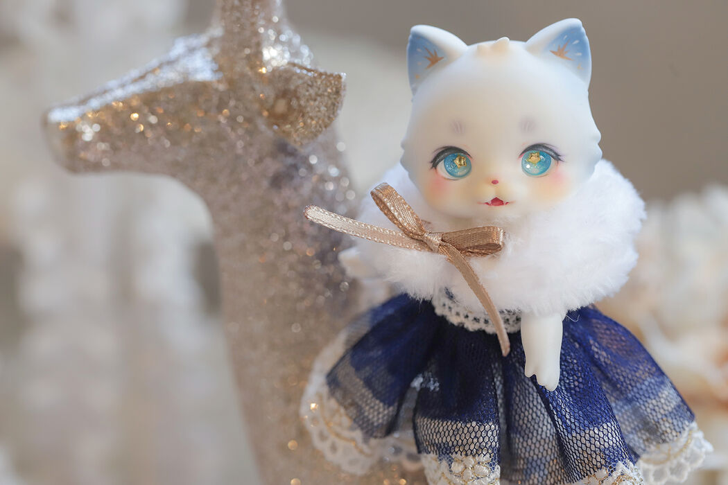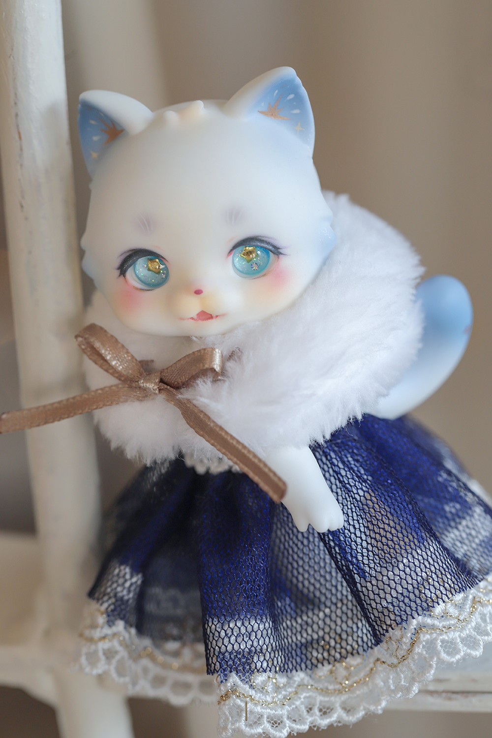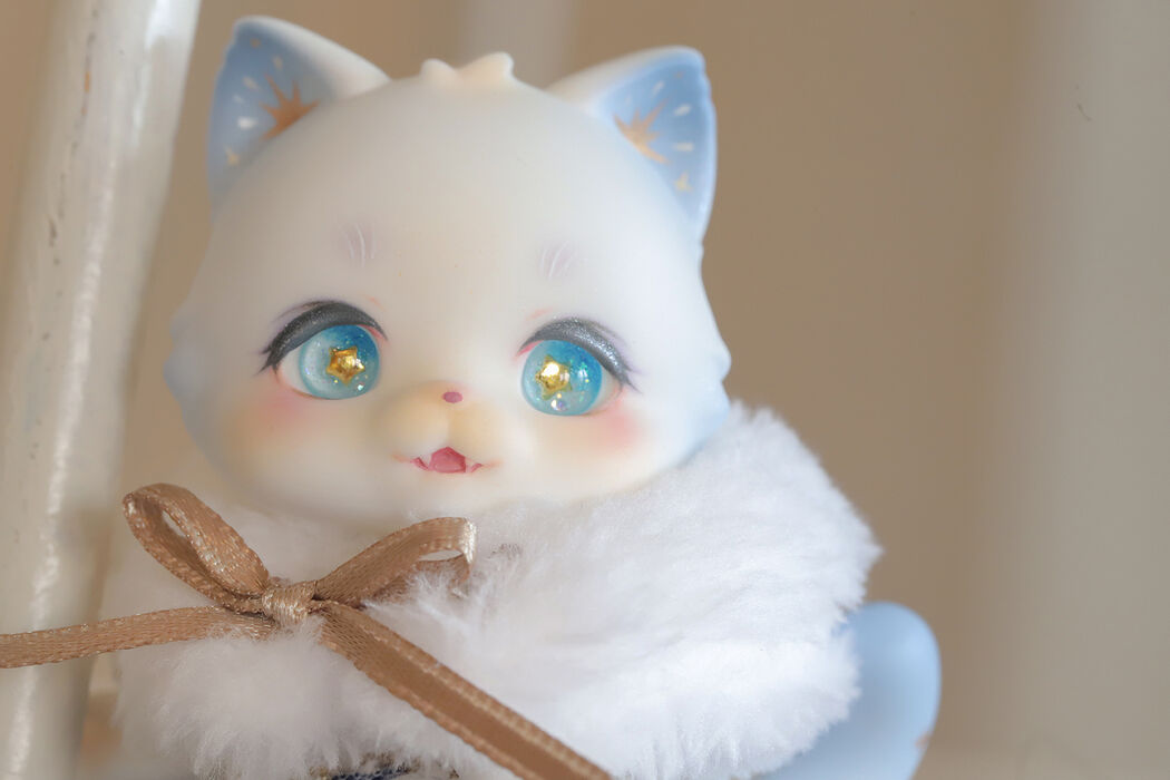 動物ドールのコラボメイクを数多く手掛ける実力派アーティストLunar eclipseが、Mayoの小さなボディに、冬の星空をイメージした可愛くて繊細な限定メイクを施しています。しっぽのパーツや、小さな耳にも煌めく星が描かれており、膝小僧や足裏の造形にも丁寧なメイクがされた特別仕様になりました。