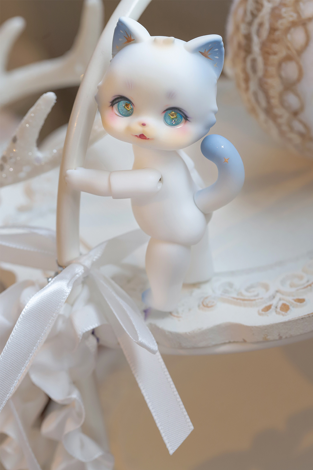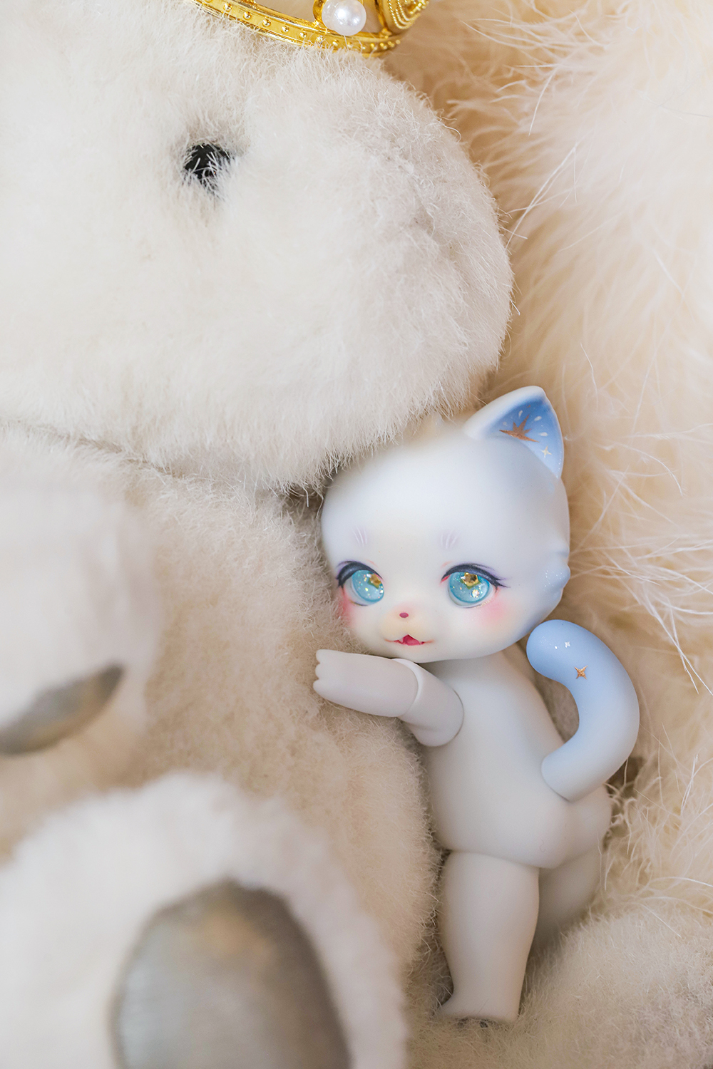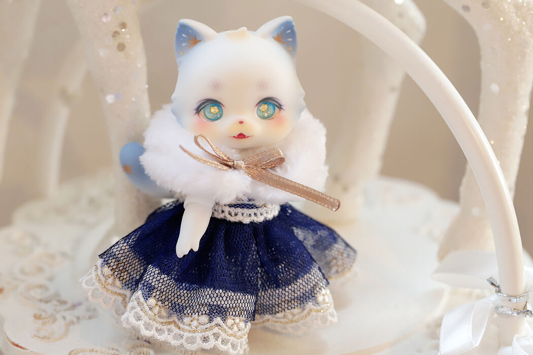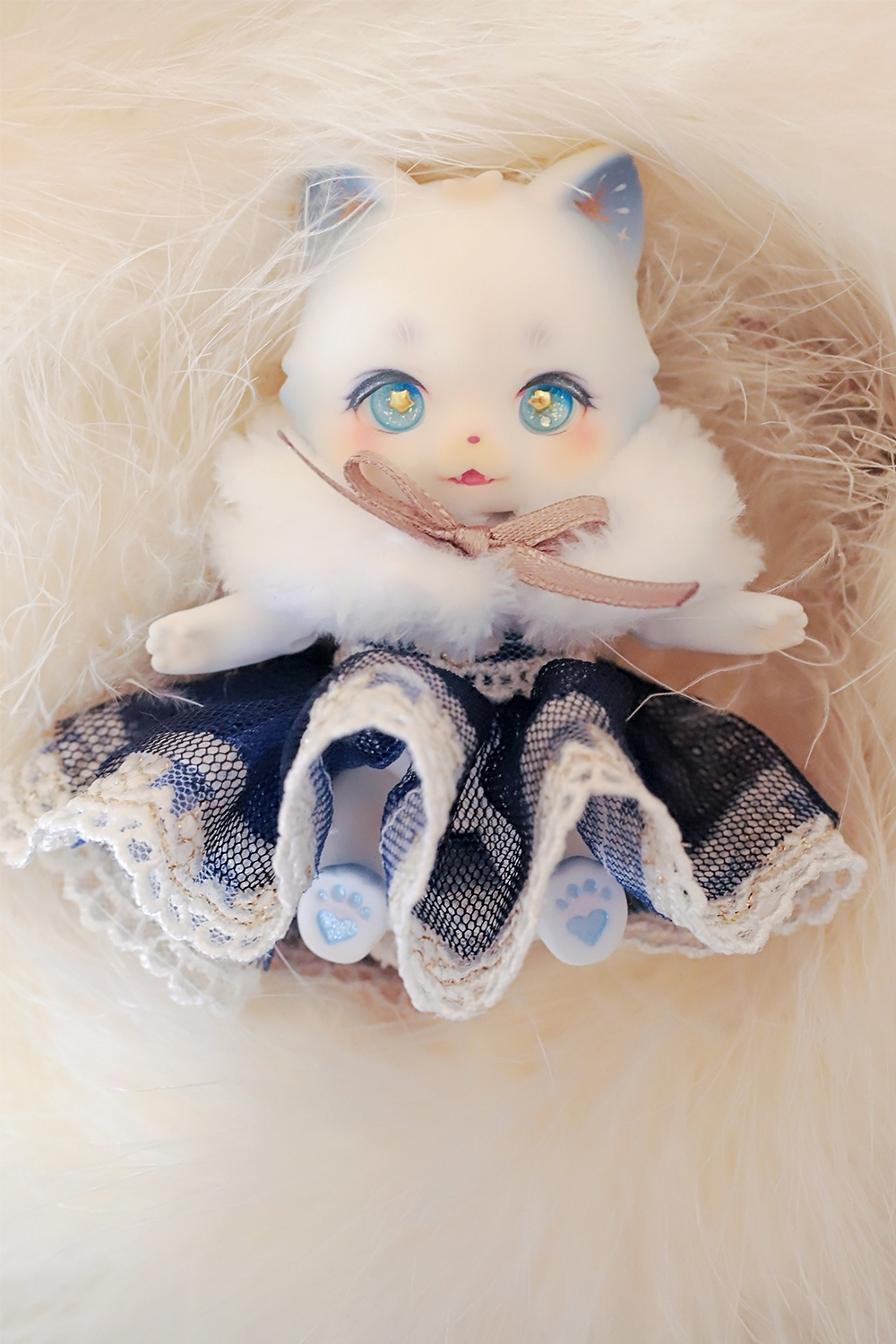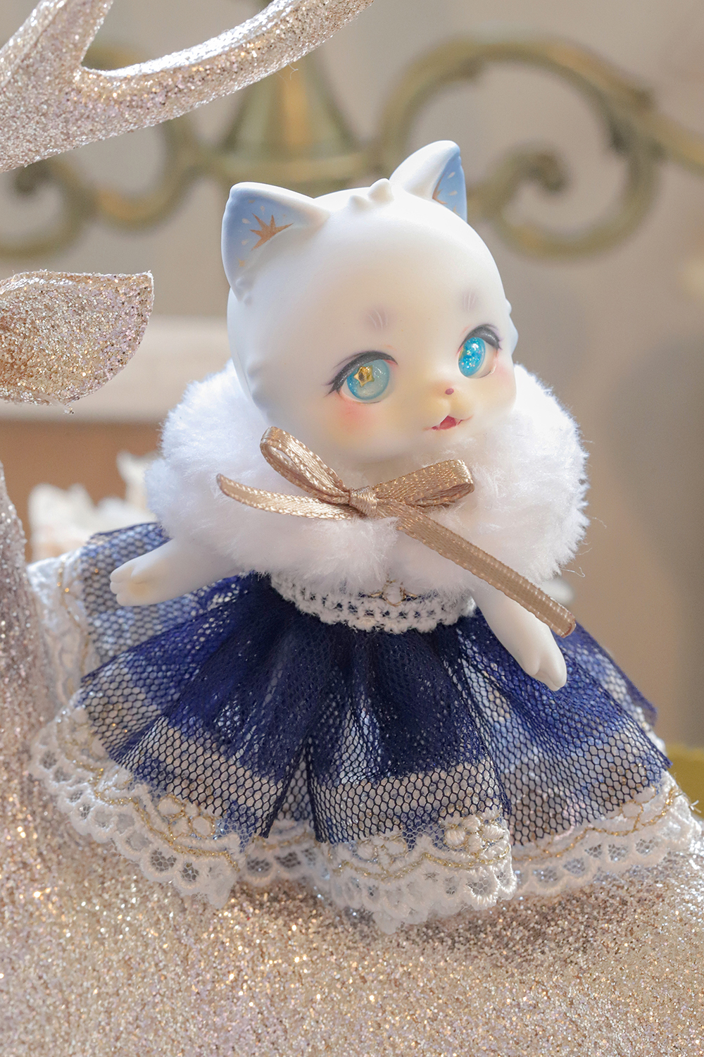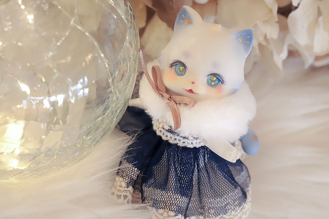 動物ドールのコラボメイクを数多く手掛ける実力派アーティストLunar eclipseが、Mayoの小さなボディに、冬の星空をイメージした可愛くて繊細な限定メイクを施しています。しっぽのパーツや、小さな耳にも煌めく星が描かれており、膝小僧や足裏の造形にも丁寧なメイクがされた特別仕様になりました。