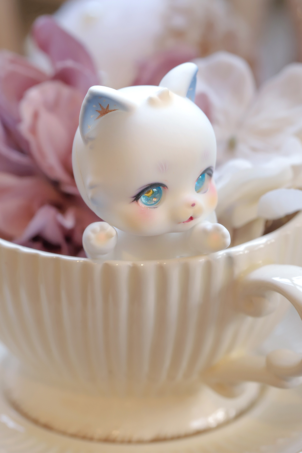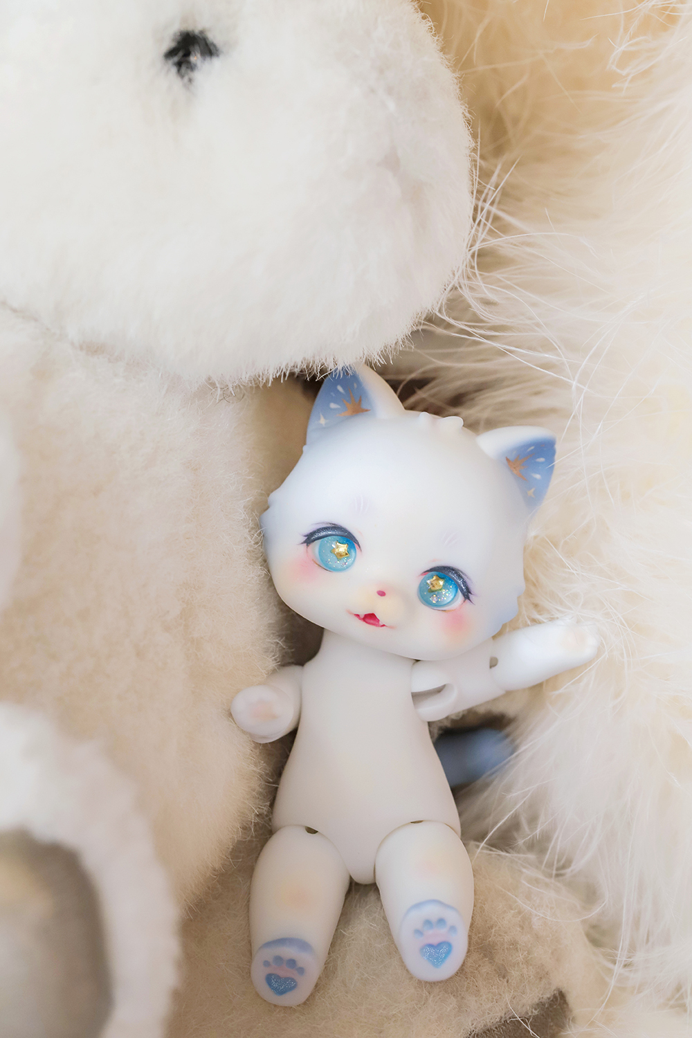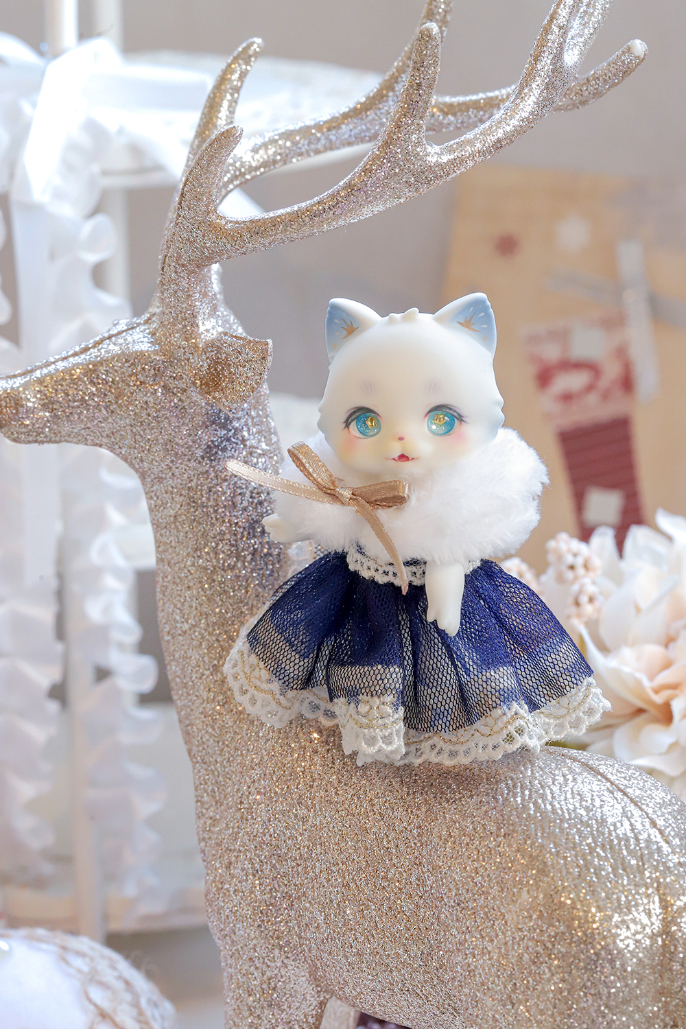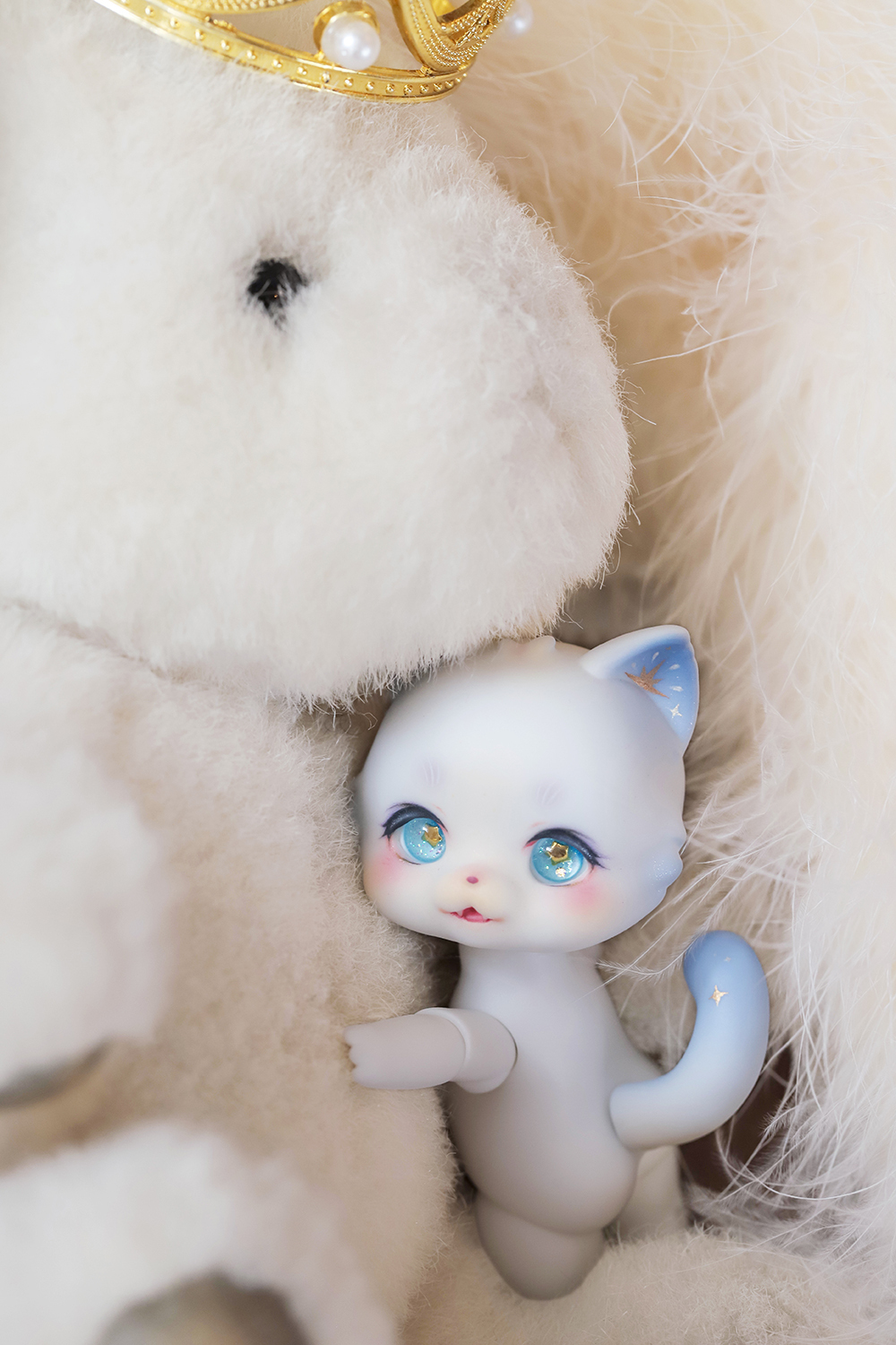 動物ドールのコラボメイクを数多く手掛ける実力派アーティストLunar eclipseが、Mayoの小さなボディに、冬の星空をイメージした可愛くて繊細な限定メイクを施しています。しっぽのパーツや、小さな耳にも煌めく星が描かれており、膝小僧や足裏の造形にも丁寧なメイクがされた特別仕様になりました。