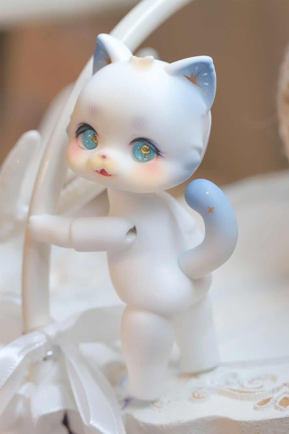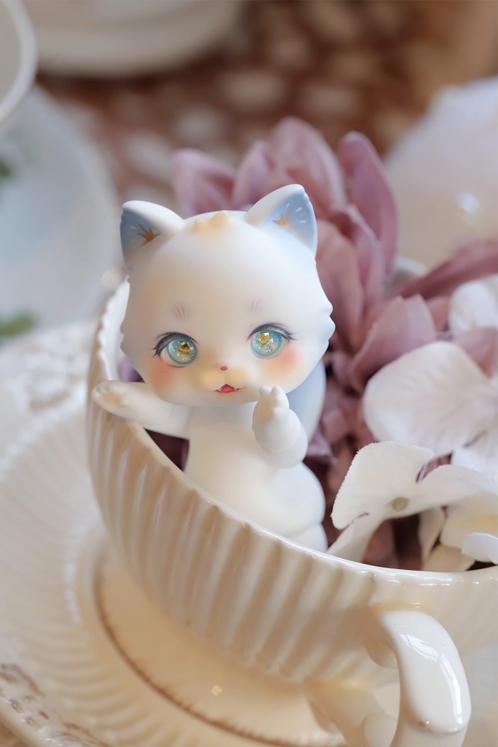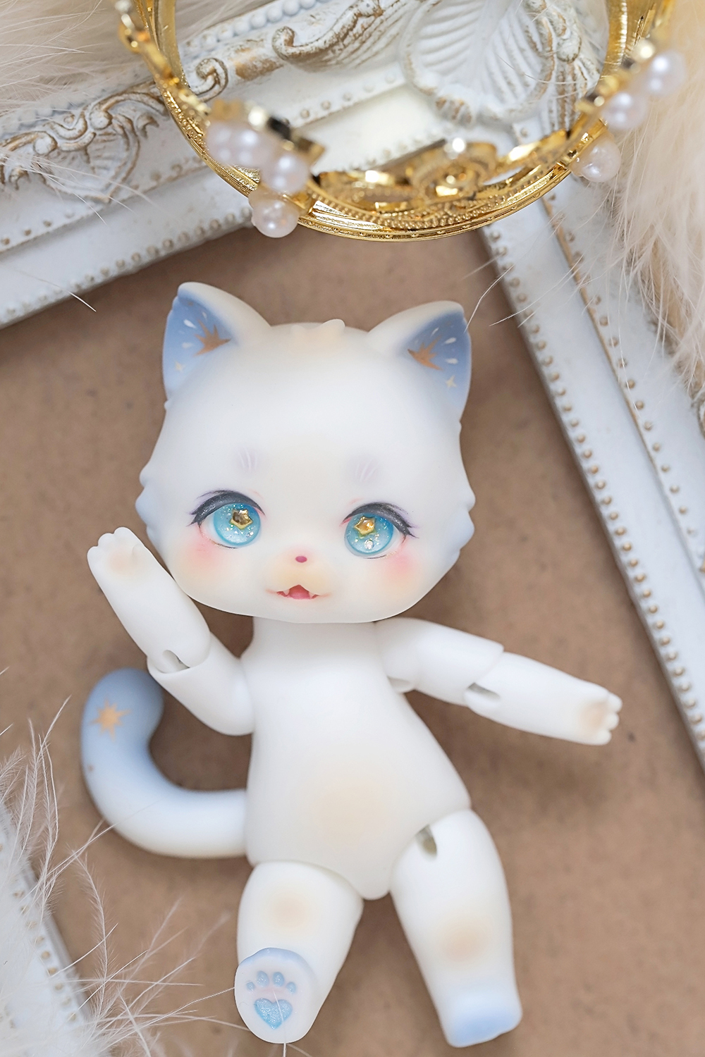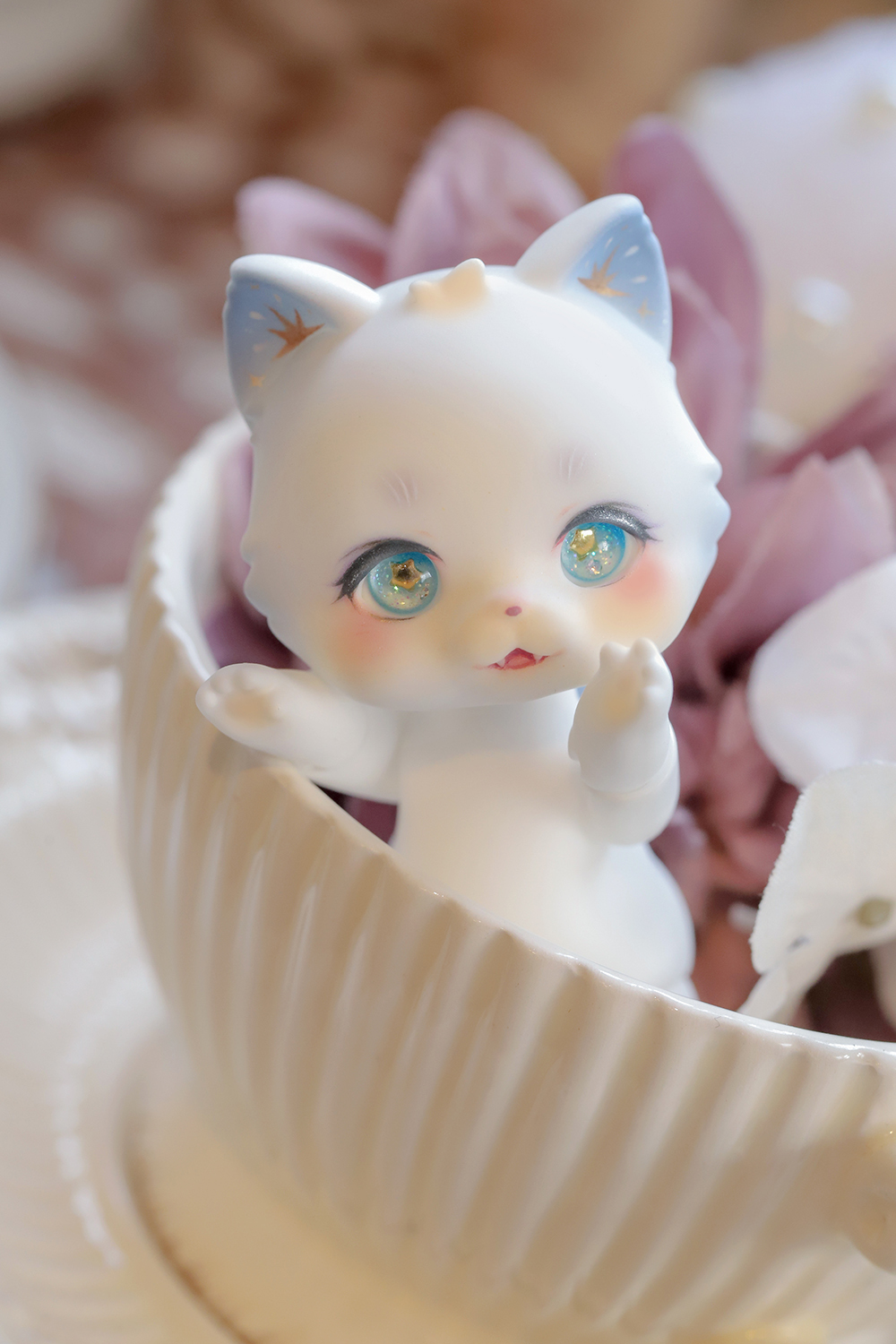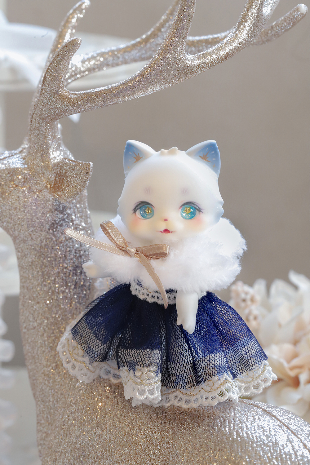 動物ドールのコラボメイクを数多く手掛ける実力派アーティストLunar eclipseが、Mayoの小さなボディに、冬の星空をイメージした可愛くて繊細な限定メイクを施しています。しっぽのパーツや、小さな耳にも煌めく星が描かれており、膝小僧や足裏の造形にも丁寧なメイクがされた特別仕様になりました。