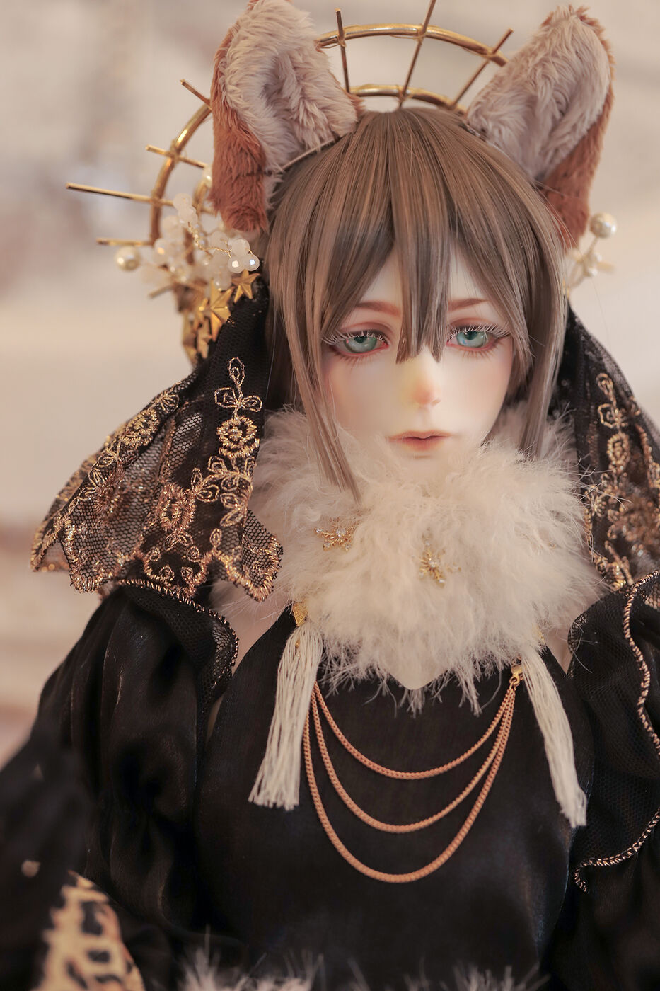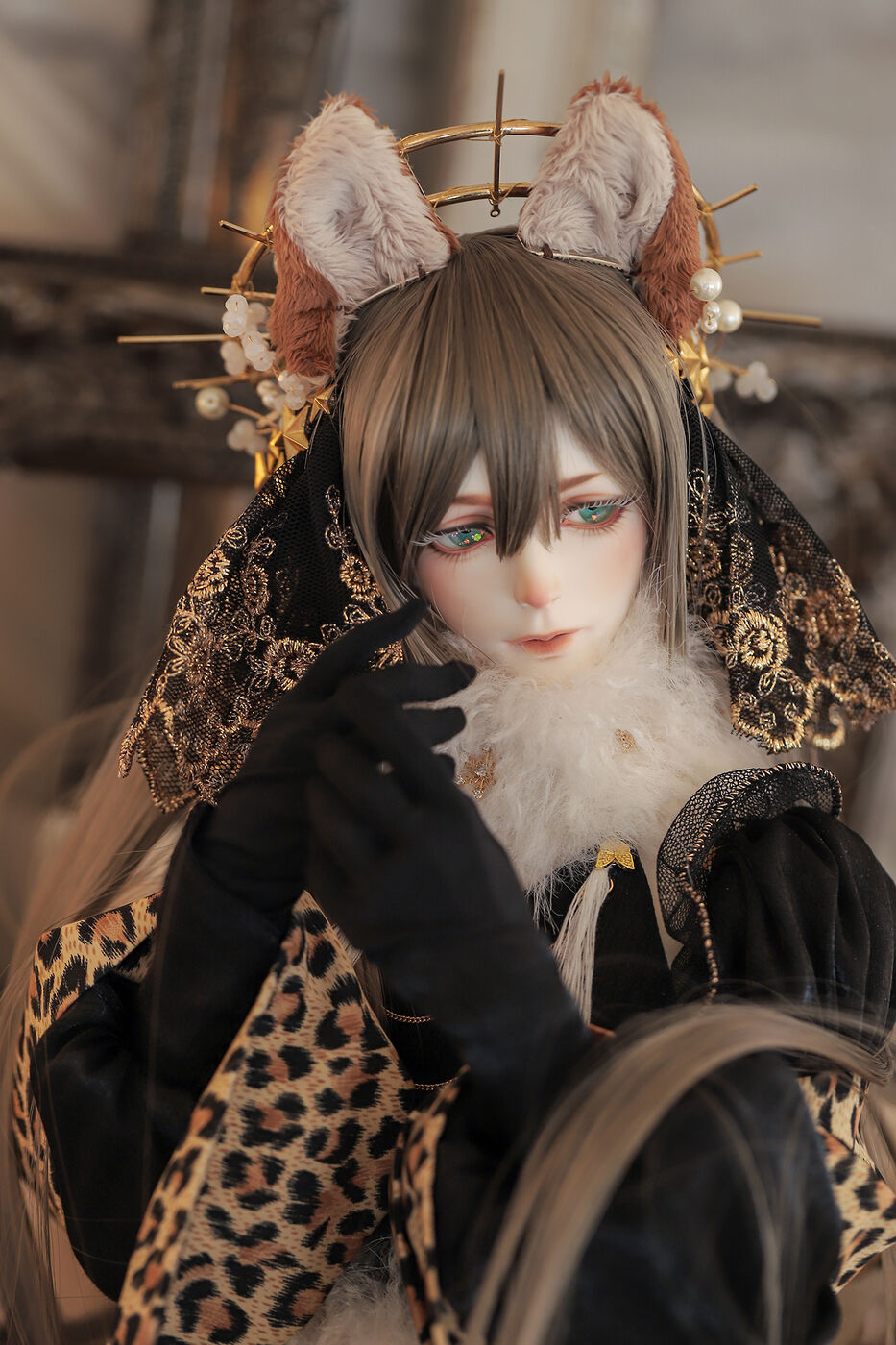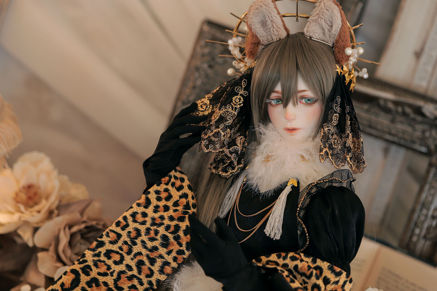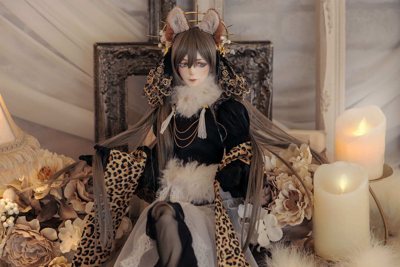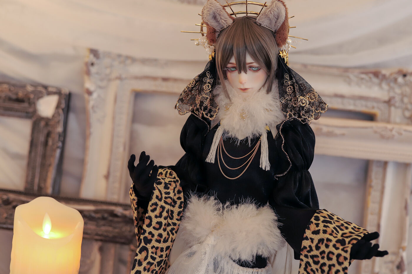 ドール服の専門メーカーZ-agramによって、輝く光輪や、猫耳のそばで輝く星・パールの装飾が美しい特別感ある一着に仕立てられています。漆黒の異素材を組み合わせることで生まれる奥行きが、ドレスの表現を極限まで高めています。