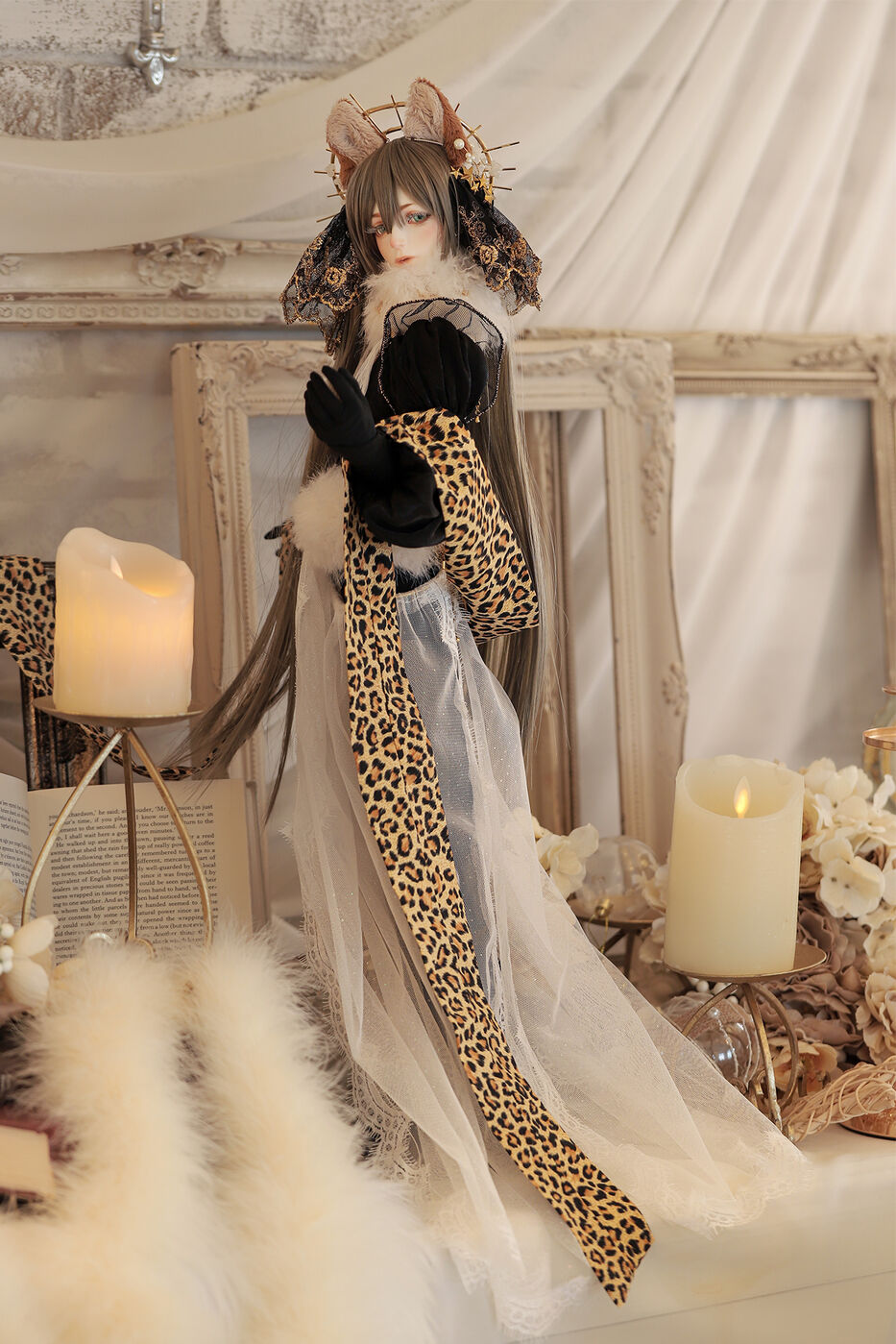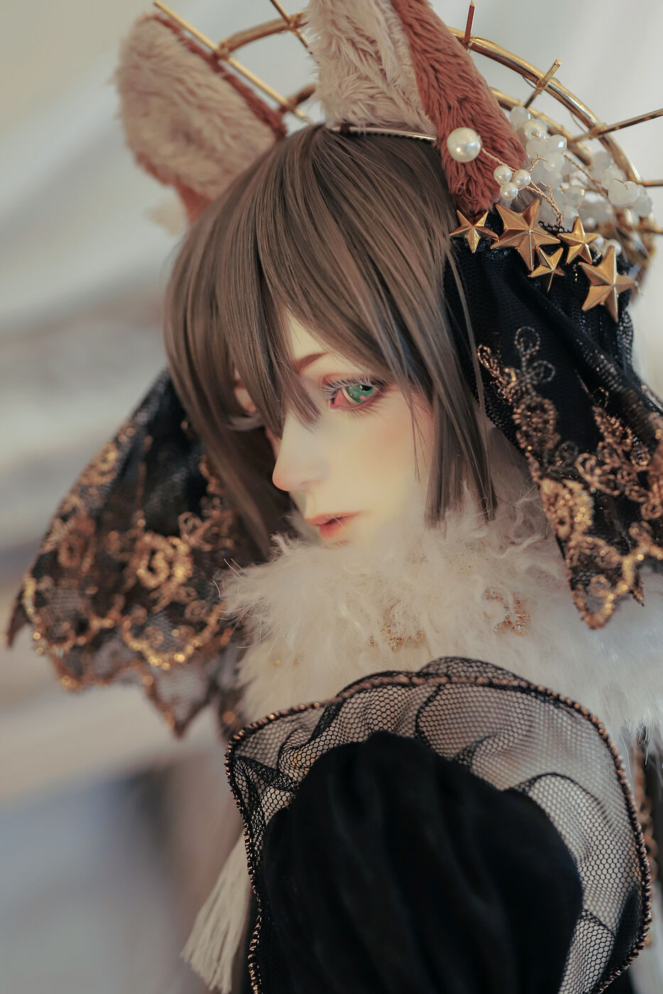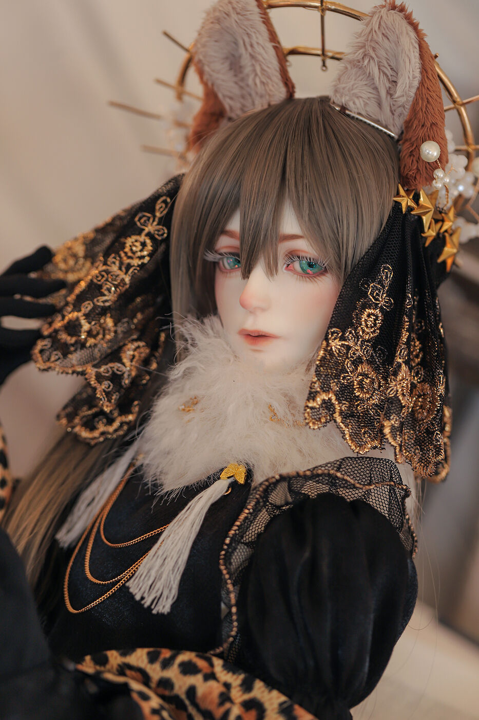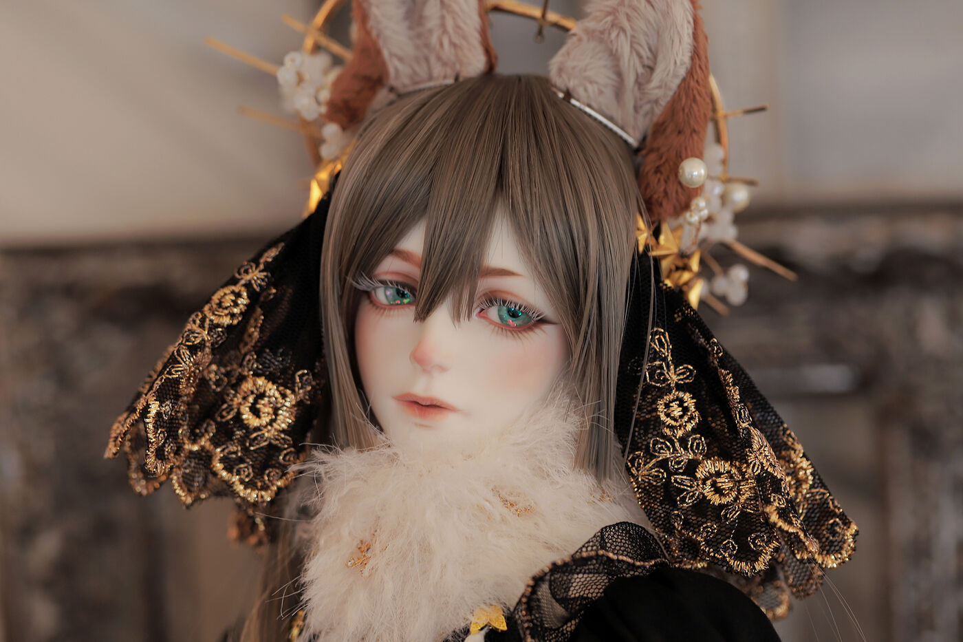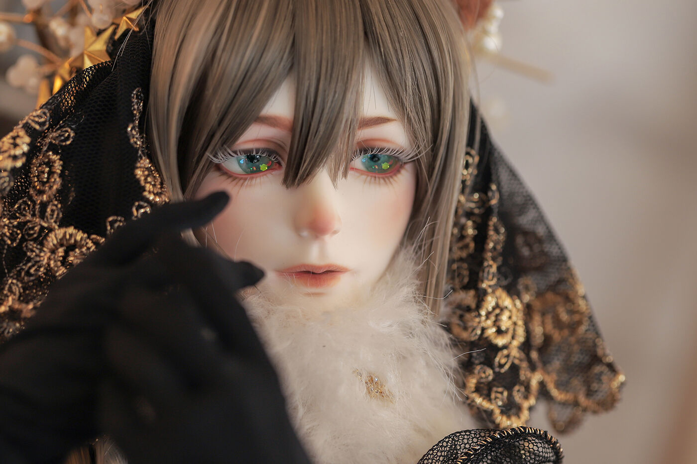 ドール服の専門メーカーZ-agramによって、輝く光輪や、猫耳のそばで輝く星・パールの装飾が美しい特別感ある一着に仕立てられています。漆黒の異素材を組み合わせることで生まれる奥行きが、ドレスの表現を極限まで高めています。